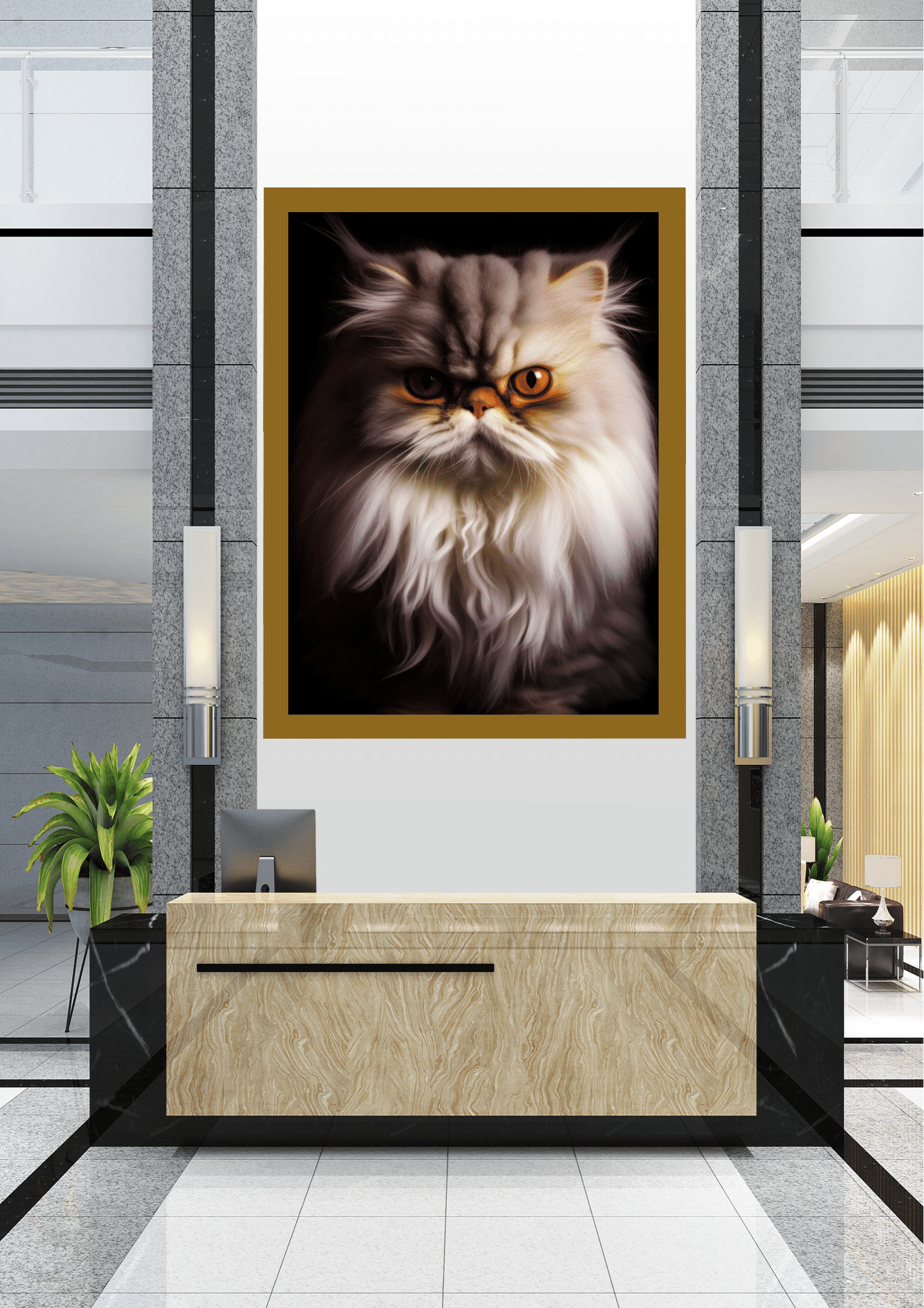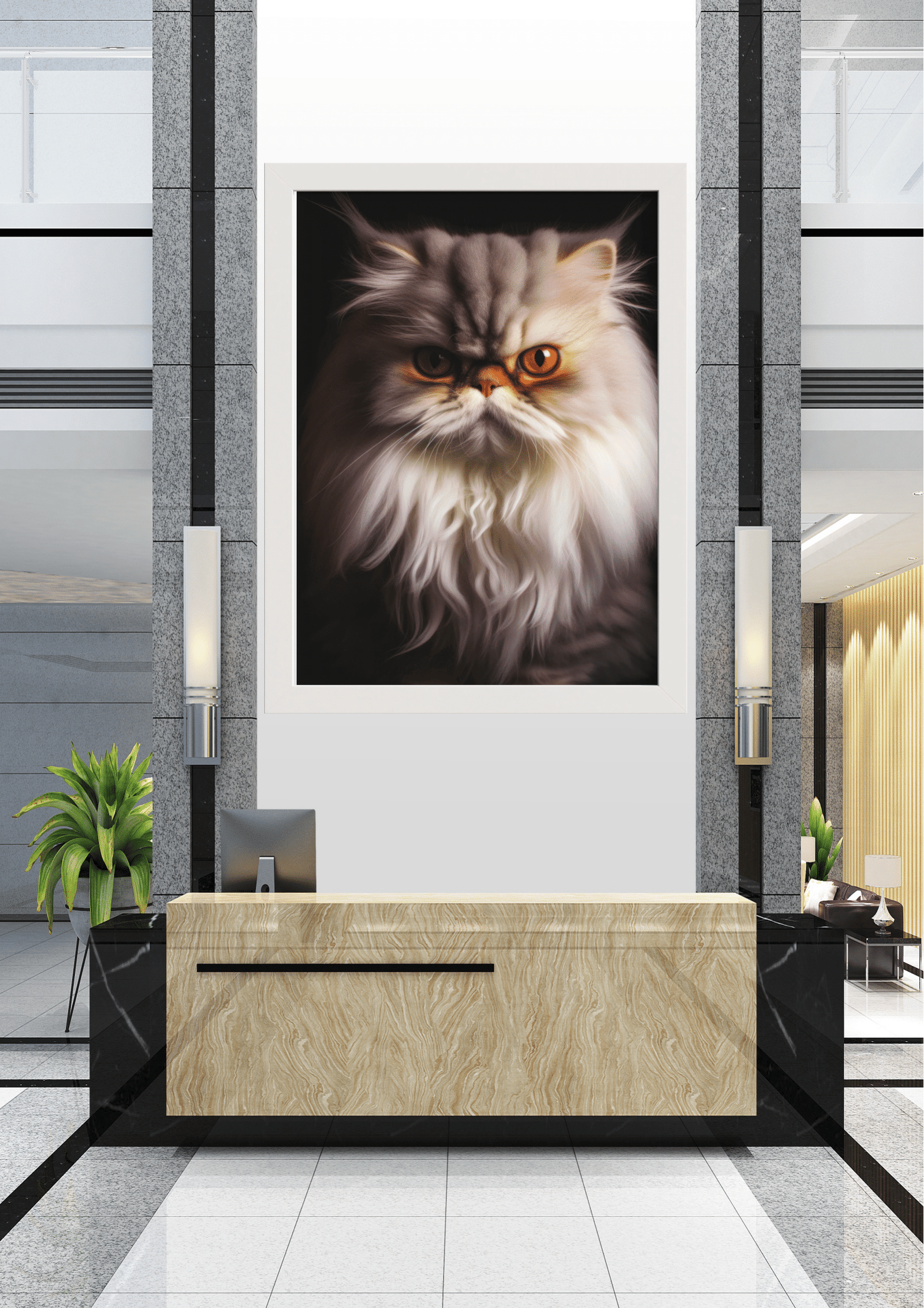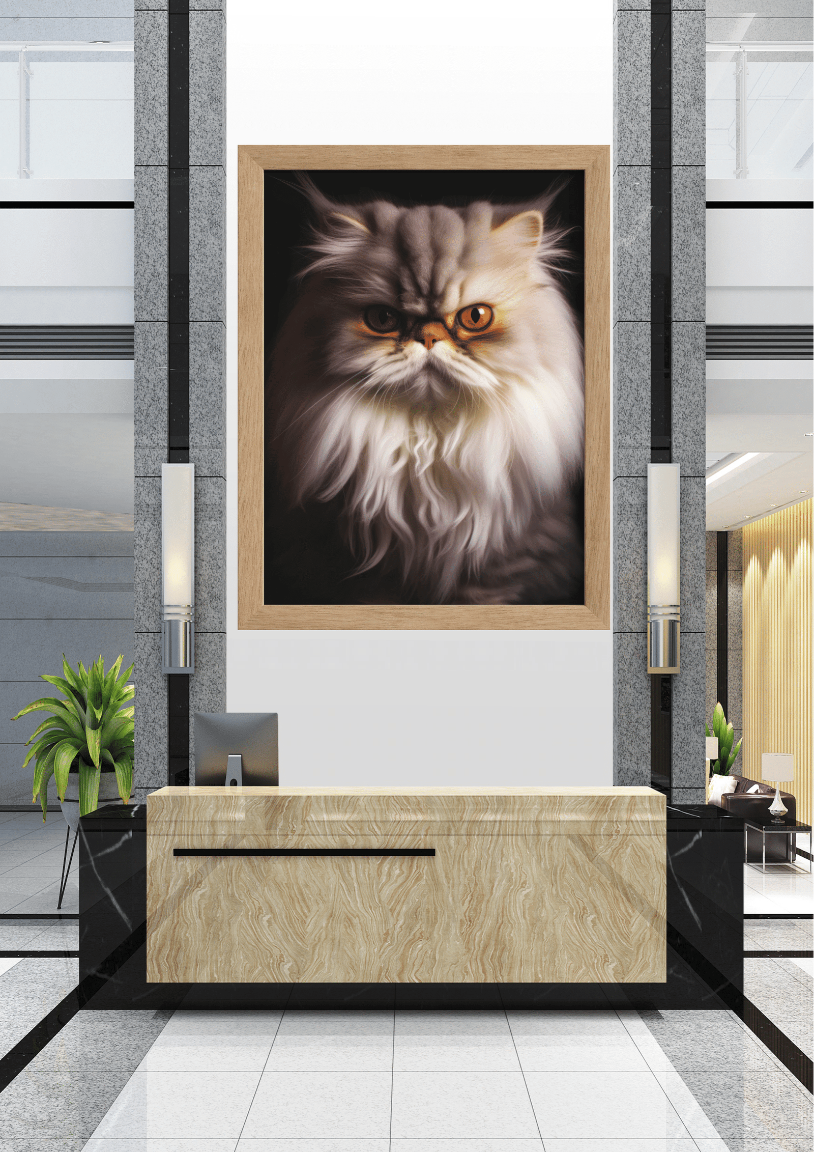 No coração de um elegante hall de entrada, um retrato impressionante captura a essência majestosa de um gato persa. A imagem, emoldurada em preto, destaca o olhar penetrante e os pelos exuberantes do felino, criando um contraste marcante com o ambiente moderno e minimalista ao seu redor. A recepção, com seu design em mármore e linhas retas, complementa a sofisticação do espaço, enquanto plantas verdes adicionam um toque de vida e cor. As paredes em tons neutros e a iluminação sutil conferem uma atmosfera de tranquilidade e luxo. Este cenário não apenas exibe o retrato como uma peça central de arte, mas também simboliza a fusão perfeita entre natureza e design contemporâneo. A presença do gato, com seu olhar quase hipnótico, convida os visitantes a uma experiência visual intrigante e inesquecível.