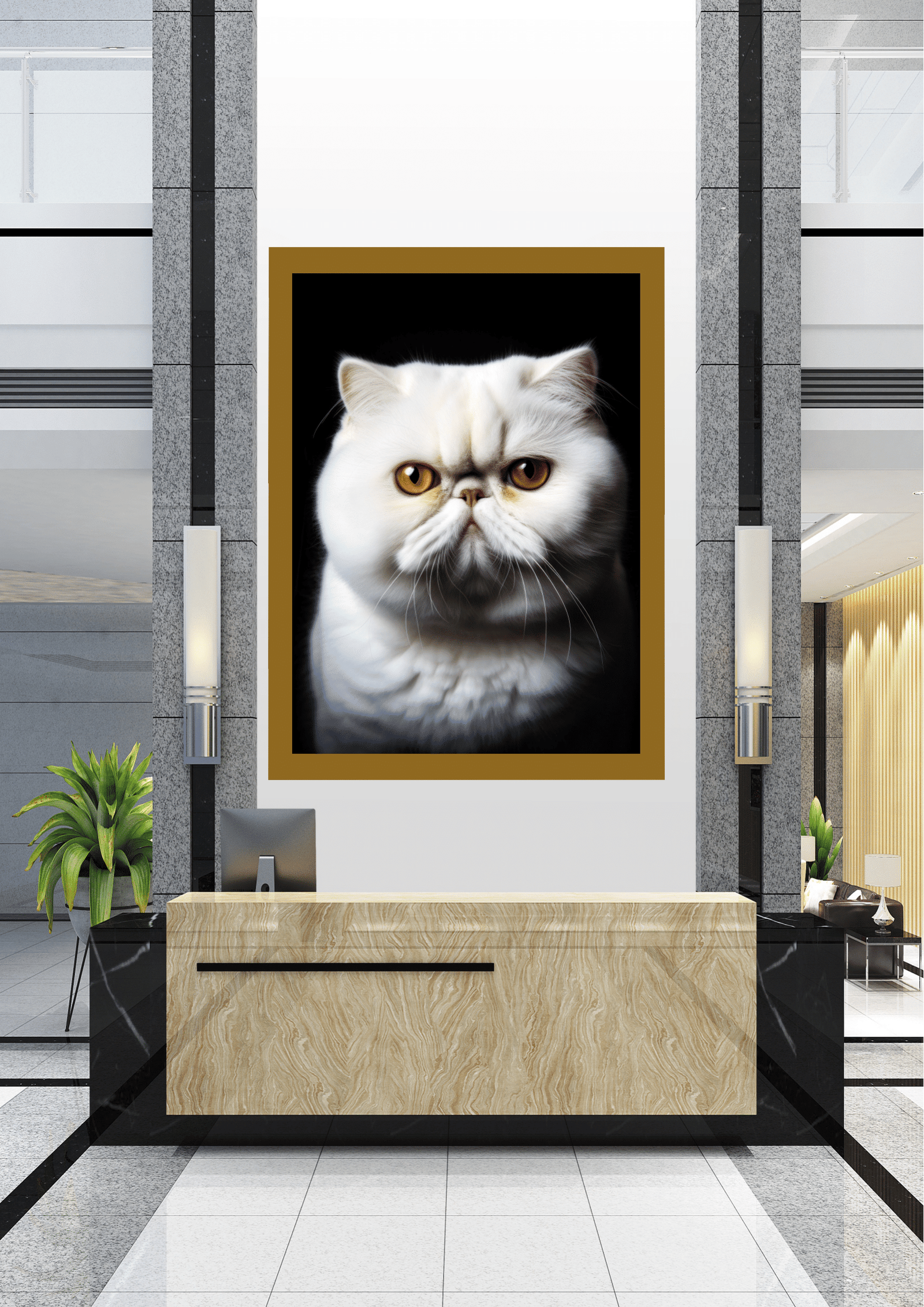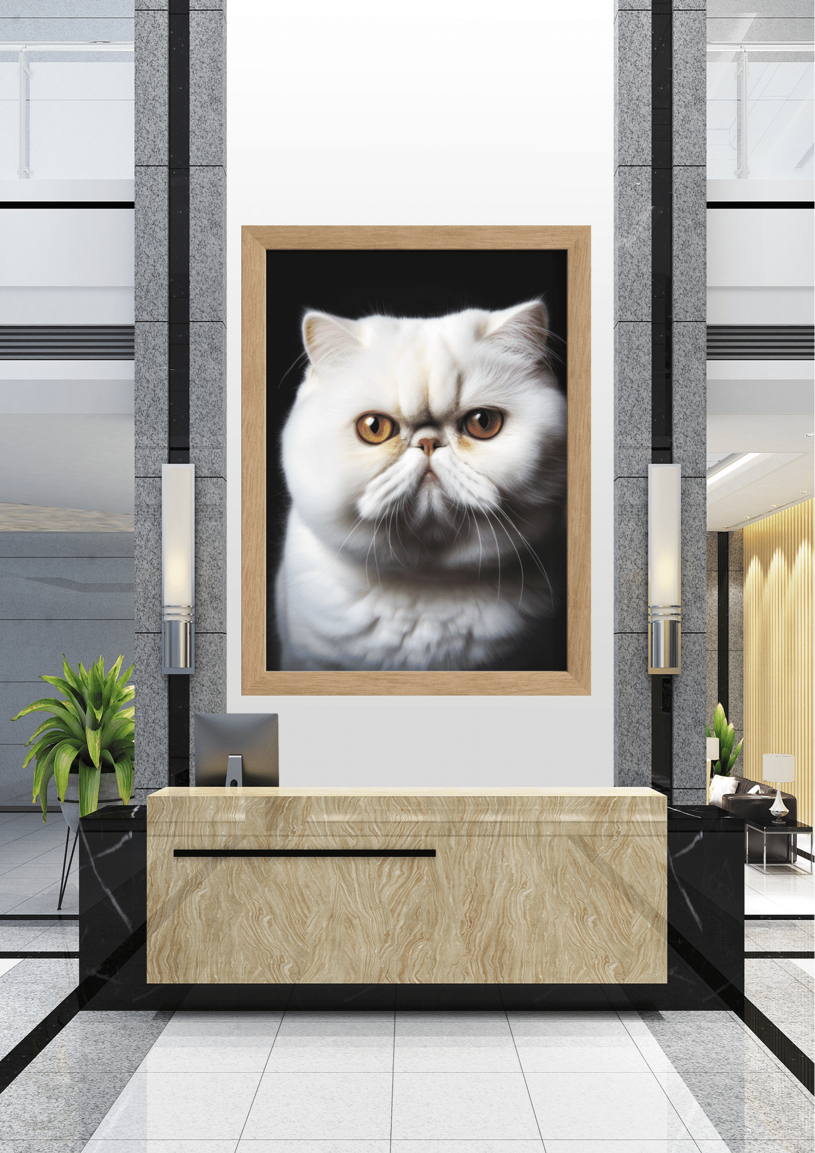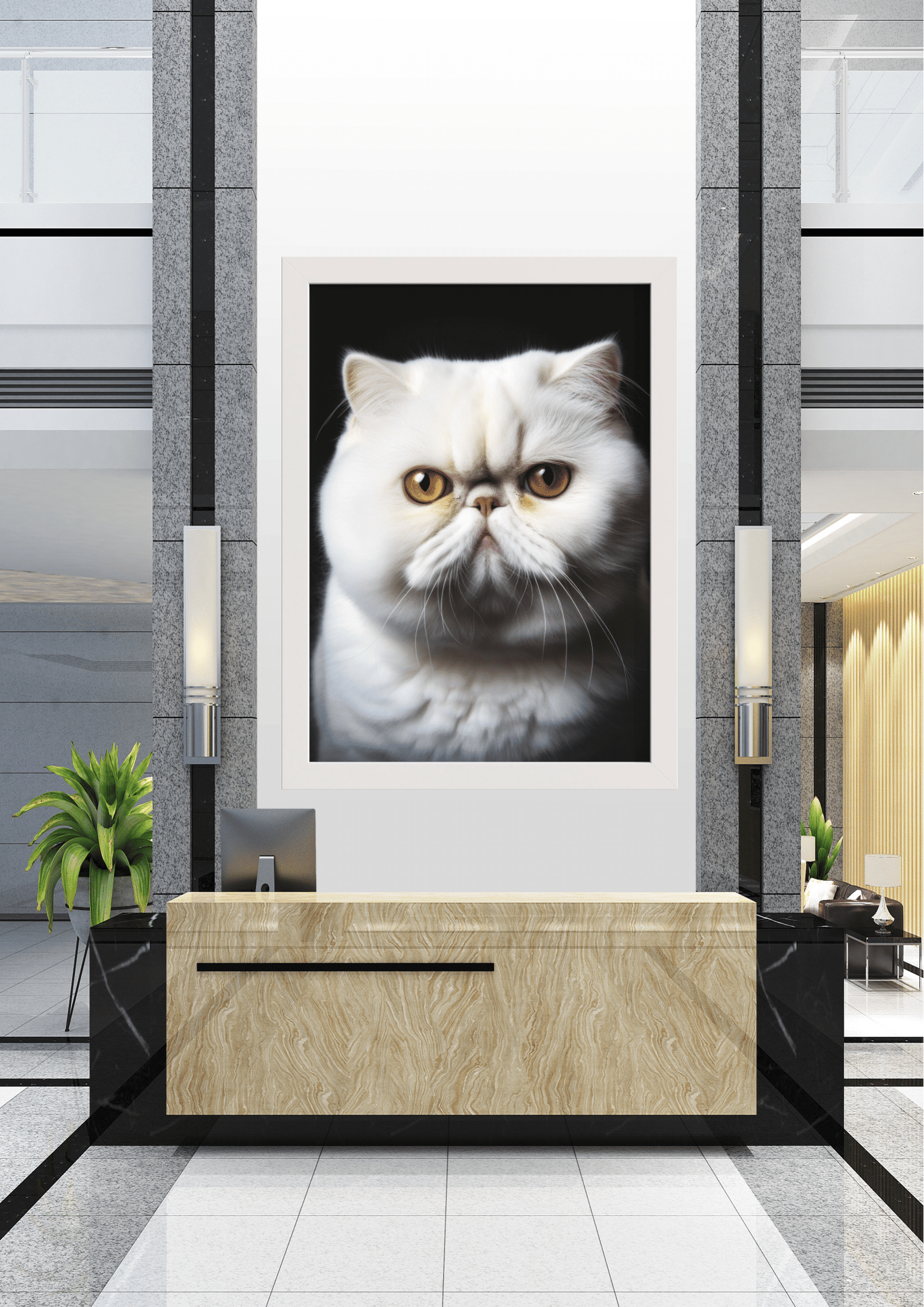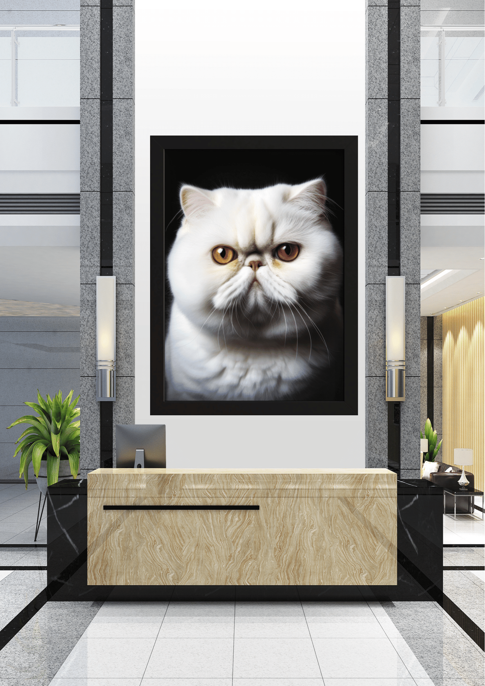 No centro de um elegante hall de entrada, destaca-se uma imponente imagem de um gato persa de olhar penetrante. A fotografia, emoldurada com precisão, captura a essência majestosa e enigmática do felino, cujos olhos âmbar parecem observar cada visitante que adentra o espaço. O contraste entre o pelo branco do gato e o fundo escuro da imagem cria uma atmosfera de sofisticação e mistério, complementando a decoração moderna e minimalista ao redor. As paredes de mármore e a mobília de linhas retas reforçam a sensação de luxo e exclusividade do ambiente. Plantas verdes ao lado do balcão adicionam um toque de frescor, equilibrando o cenário com a natureza. Este hall não é apenas uma passagem, mas uma experiência visual que convida à contemplação e à admiração.