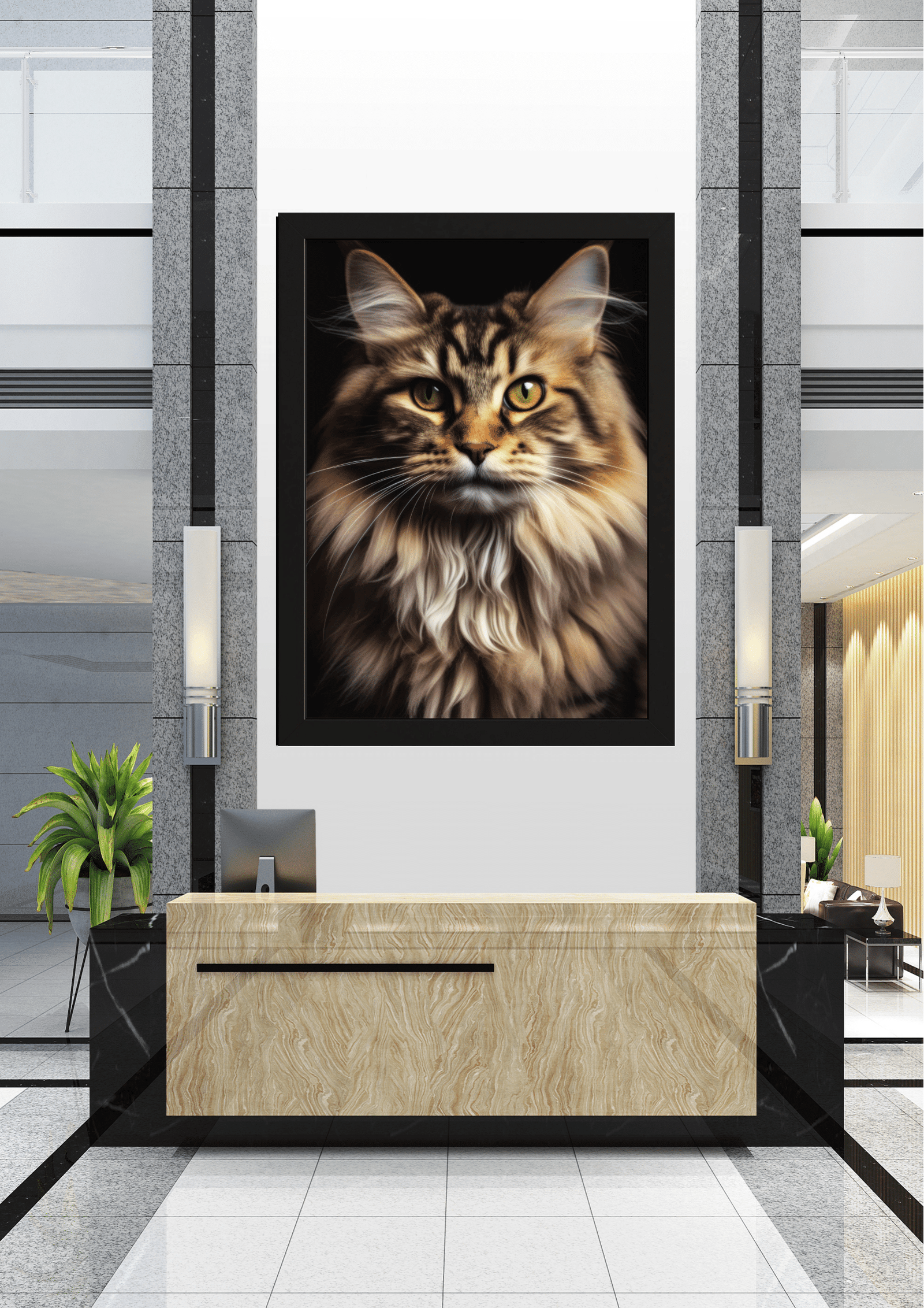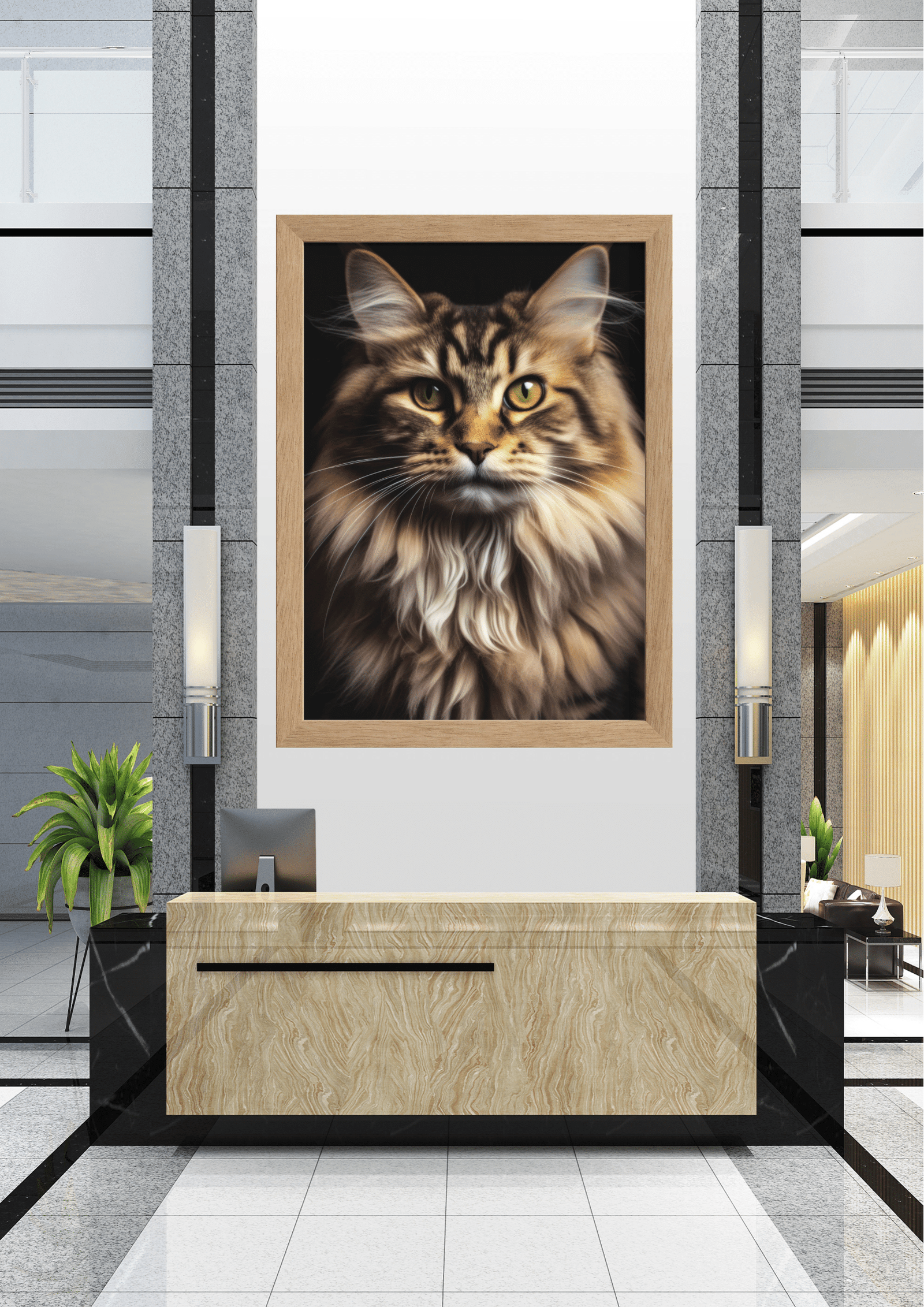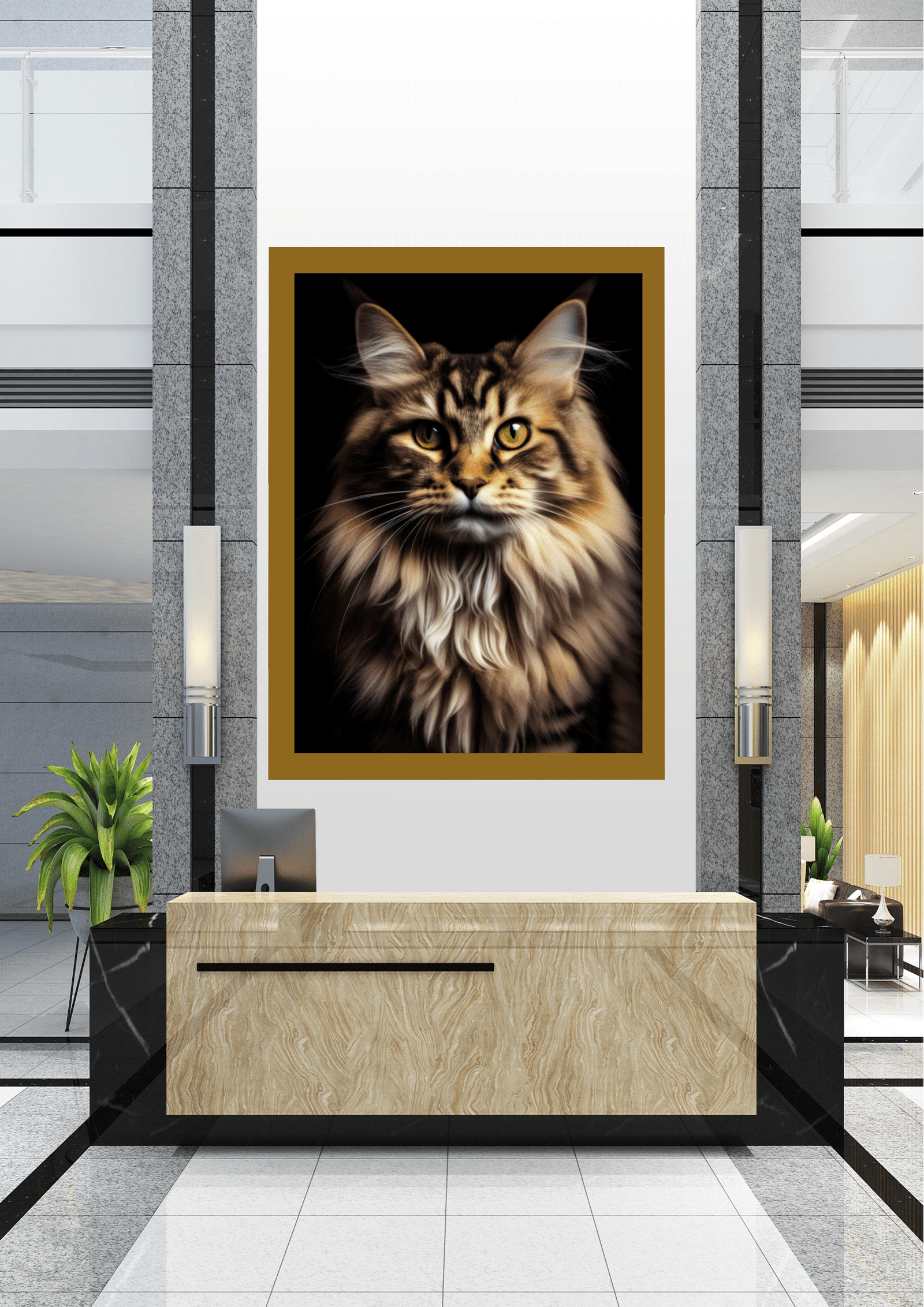 A imagem captura a imponência de um majestoso gato de pelos longos, exibido em uma grande moldura no hall de entrada de um edifício moderno. A obra de arte domina o espaço com sua presença imponente, destacando os olhos penetrantes e o pelo detalhado do felino. O ambiente é sofisticado, com acabamentos em mármore e granito, complementando a elegância do retrato. As luzes suaves e as plantas cuidadosamente posicionadas ao redor do balcão de recepção adicionam um toque de frescor e acolhimento ao local. Este espaço, onde arte e arquitetura se encontram, cria uma atmosfera de tranquilidade e sofisticação, convidando os visitantes a apreciarem a beleza e a serenidade do ambiente. A escolha do retrato do gato transmite uma sensação de segurança e curiosidade, tornando-se um ponto focal que cativa todos que passam por ali.