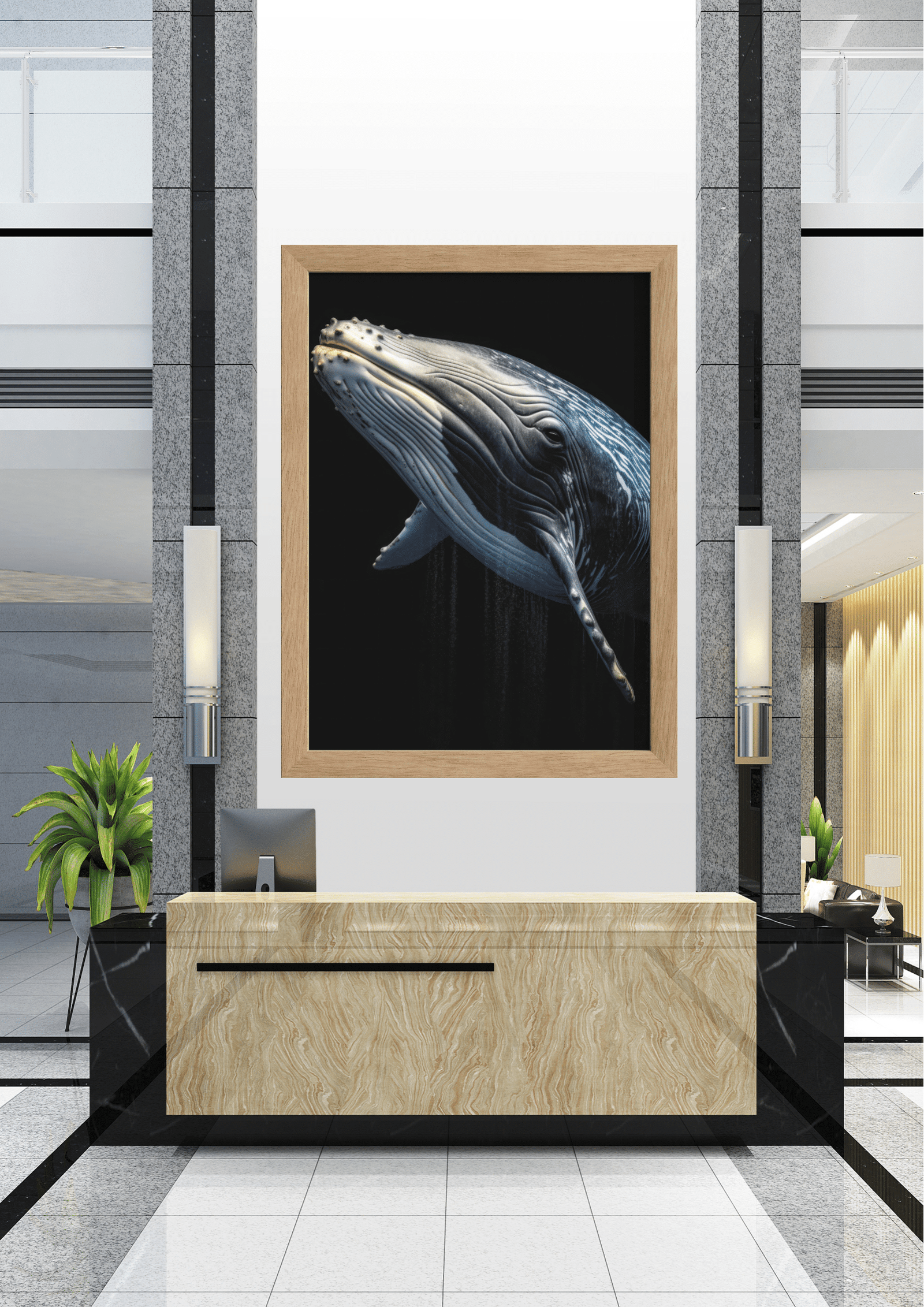 A imagem está emoldurada em preto, complementando o fundo escuro e focando toda a atenção no sujeito principal. O quadro está estrategicamente posicionado em um ambiente moderno e minimalista, ocupando uma posição central em uma parede branca entre duas colunas de granito cinza. Este cenário contemporâneo cria um contraste intrigante entre o mundo natural representado pela baleia e o ambiente construído pelo homem.