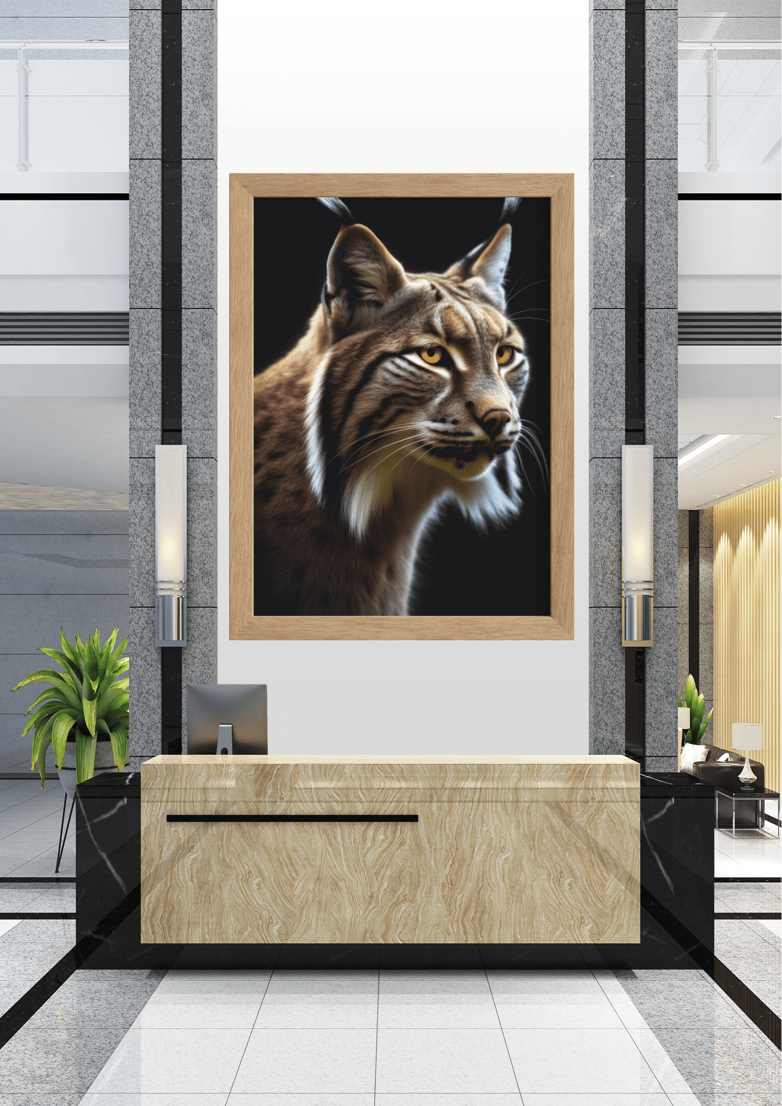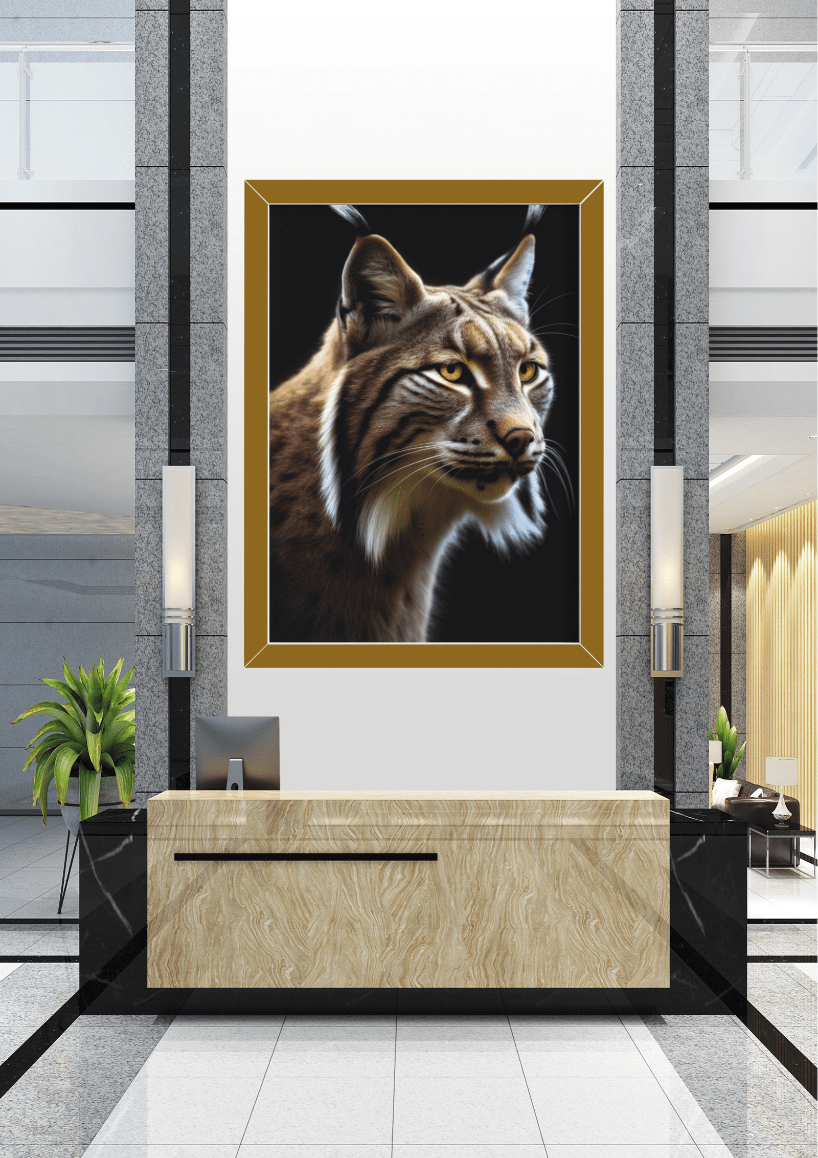 A imagem destaca um majestoso lince retratado em uma impressionante obra de arte, emoldurada e exibida com destaque no saguão de um edifício moderno. O lince, com seu olhar penetrante e pelagem detalhada, traz um toque de natureza selvagem ao ambiente sofisticado. A composição contrasta a beleza natural do animal com as linhas retas e materiais frios da arquitetura contemporânea, criando uma harmonia visual entre o mundo natural e o urbano. A recepção, com seu design minimalista e materiais nobres, como mármore e aço, complementa a grandiosidade da arte. Plantas estrategicamente posicionadas adicionam um toque de vida e cor ao espaço, reforçando a conexão com a natureza. Este cenário não apenas embeleza o ambiente, mas também convida os visitantes a refletirem sobre a coexistência entre o homem e a natureza.