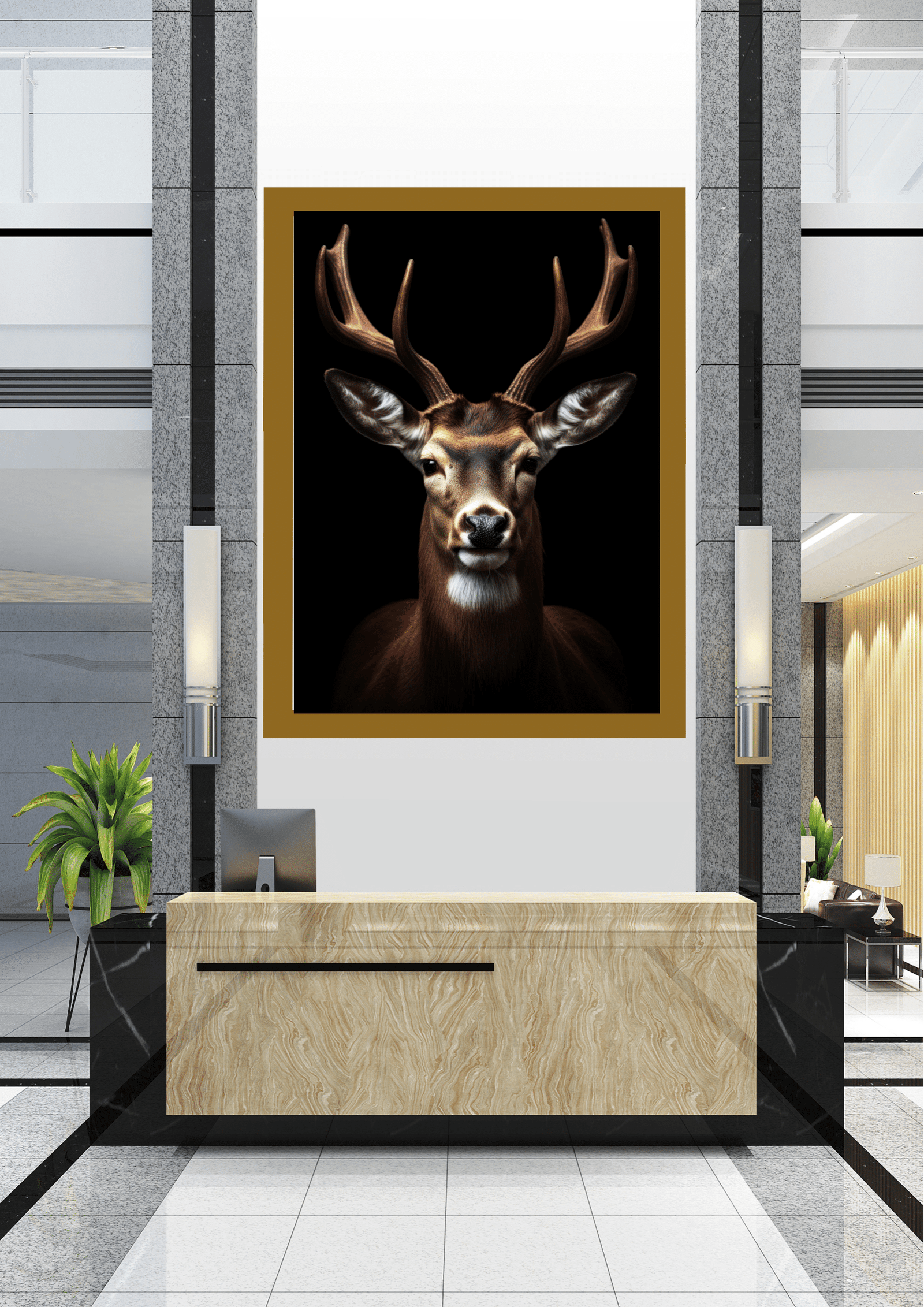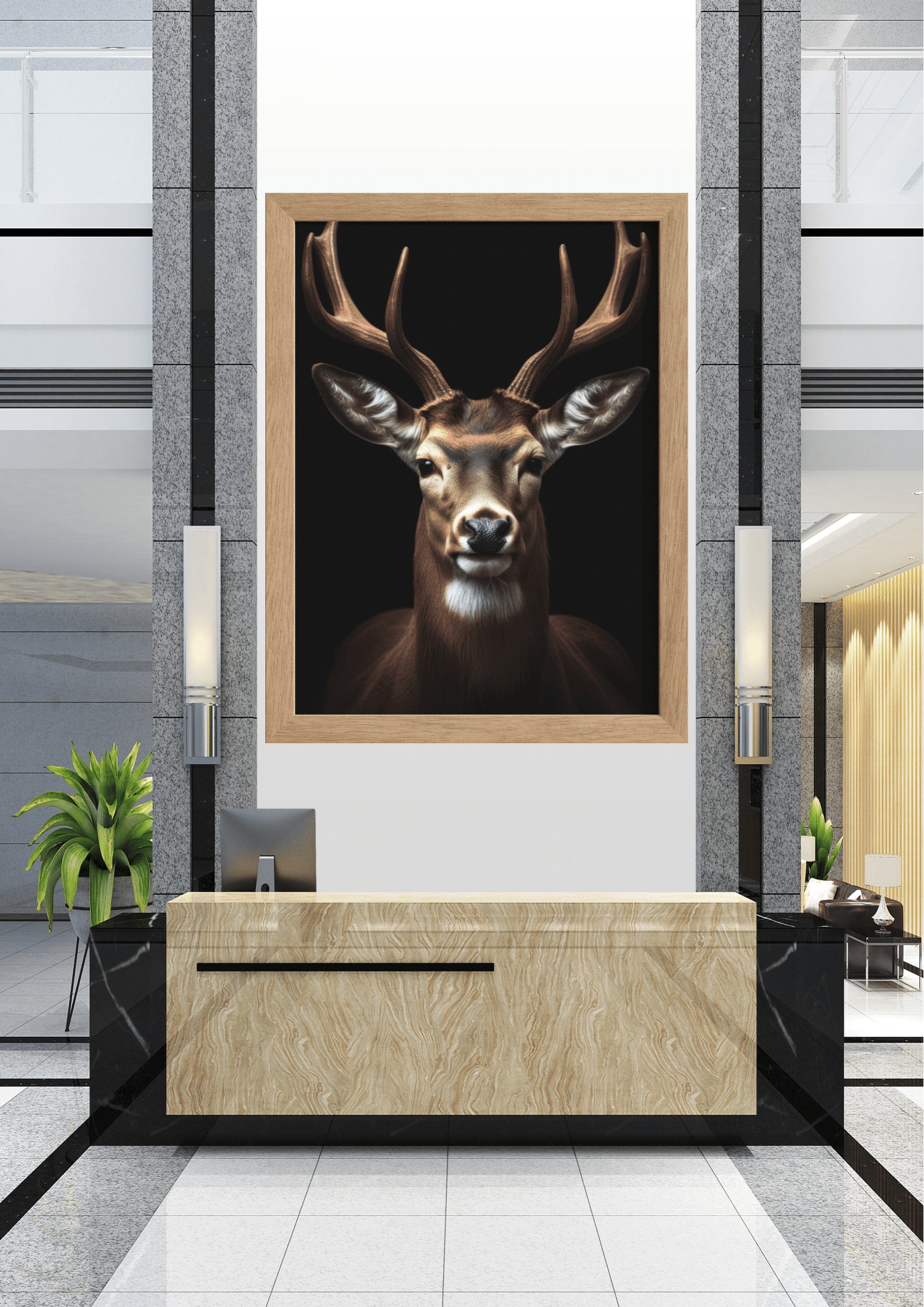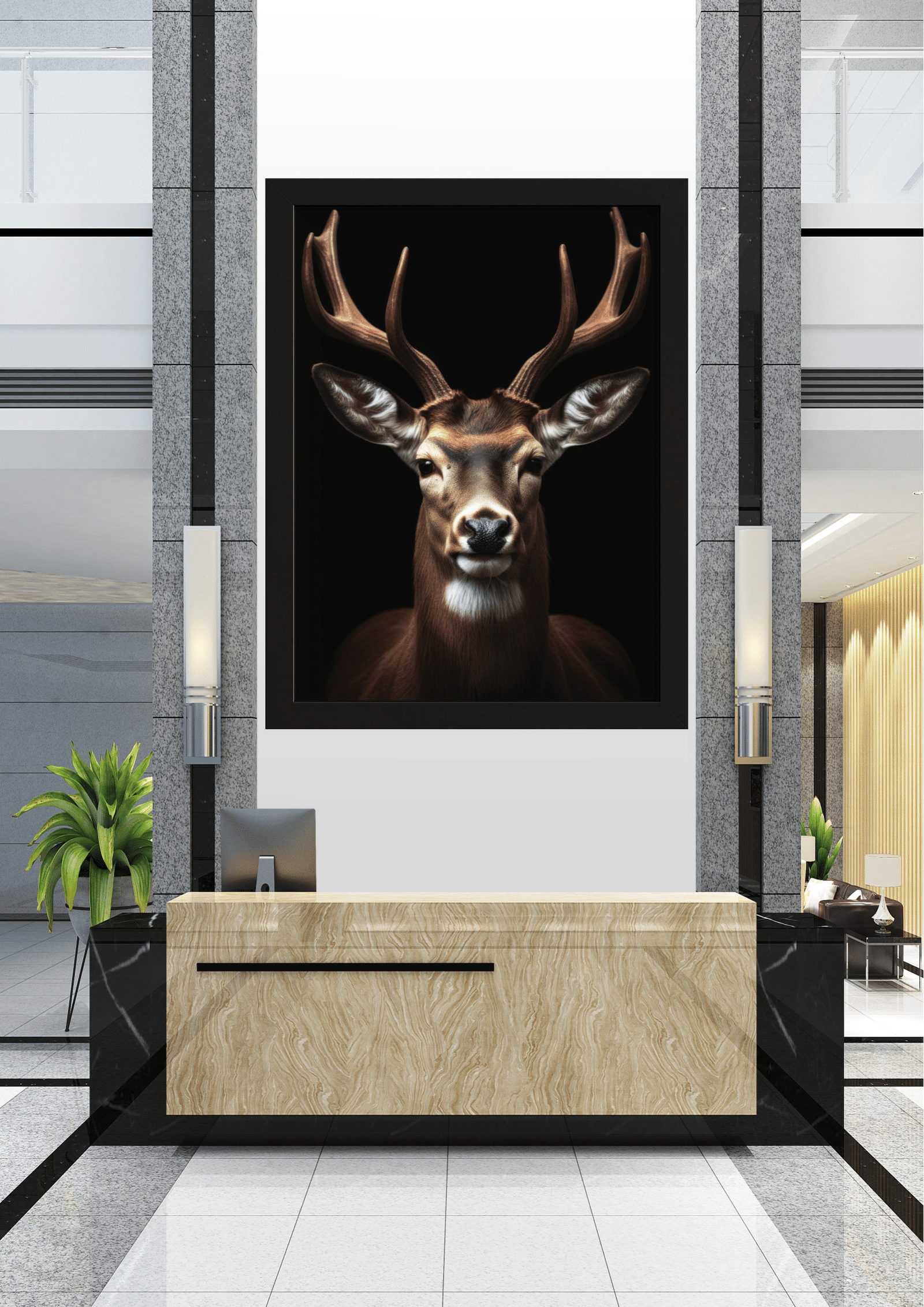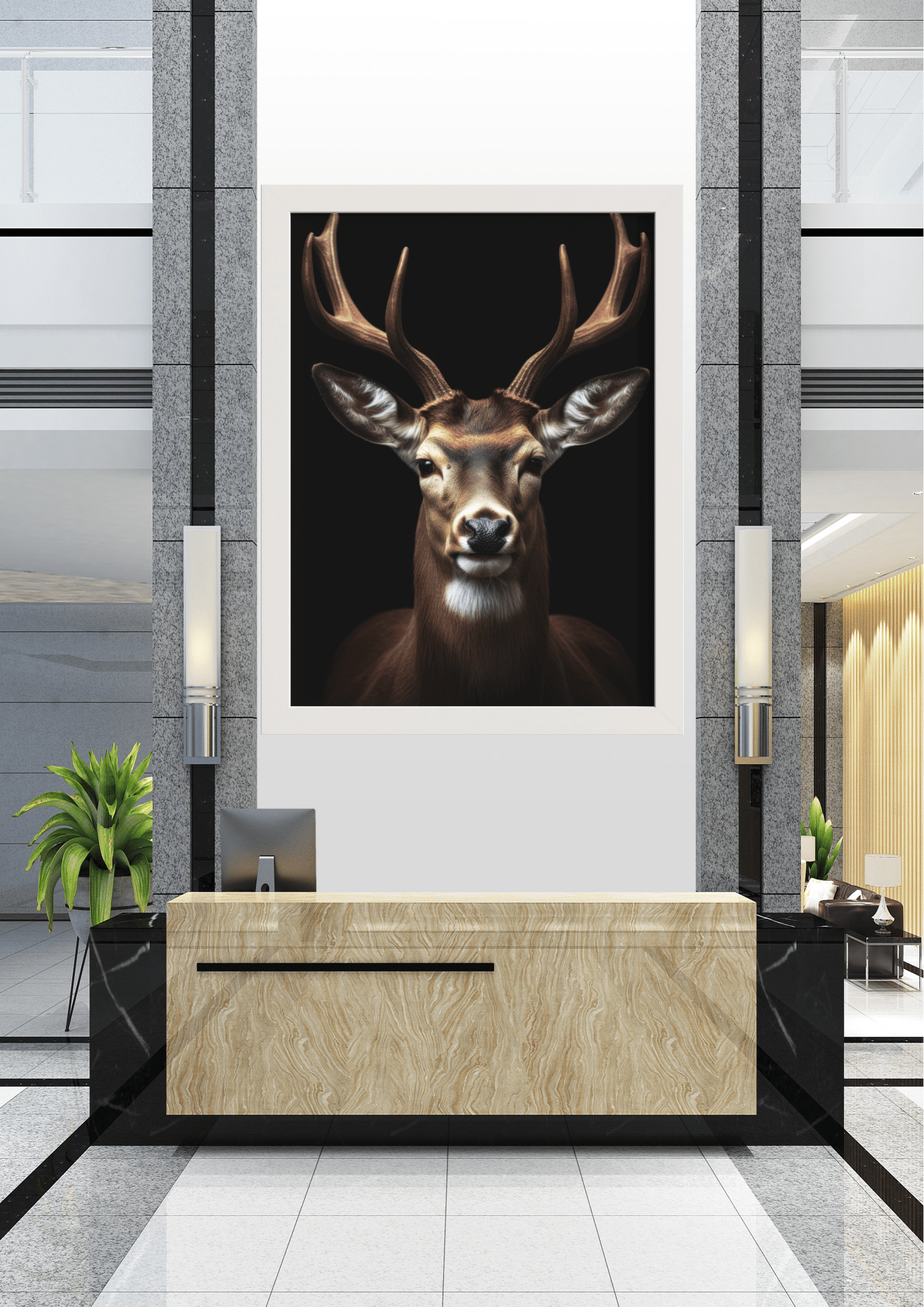 No coração de um hall moderno e sofisticado, destaca-se uma imponente obra de arte: a imagem de um majestoso cervo. O quadro, com seu fundo negro, realça a figura do cervo, que parece observar atentamente quem passa. Seus chifres, simétricos e robustos, simbolizam força e elegância, enquanto seu olhar transmite serenidade e sabedoria. A escolha do cervo como peça central não é aleatória; ele representa a harmonia entre a natureza e o ambiente urbano. O design minimalista da recepção, com linhas retas e materiais nobres como mármore e granito, complementa a presença do cervo, criando uma atmosfera de tranquilidade e introspecção. Plantas verdes ao redor adicionam um toque de frescor, reforçando a conexão com a natureza. Este espaço convida os visitantes a uma pausa contemplativa, destacando a beleza e a majestade da vida selvagem em meio ao cotidiano agitado.