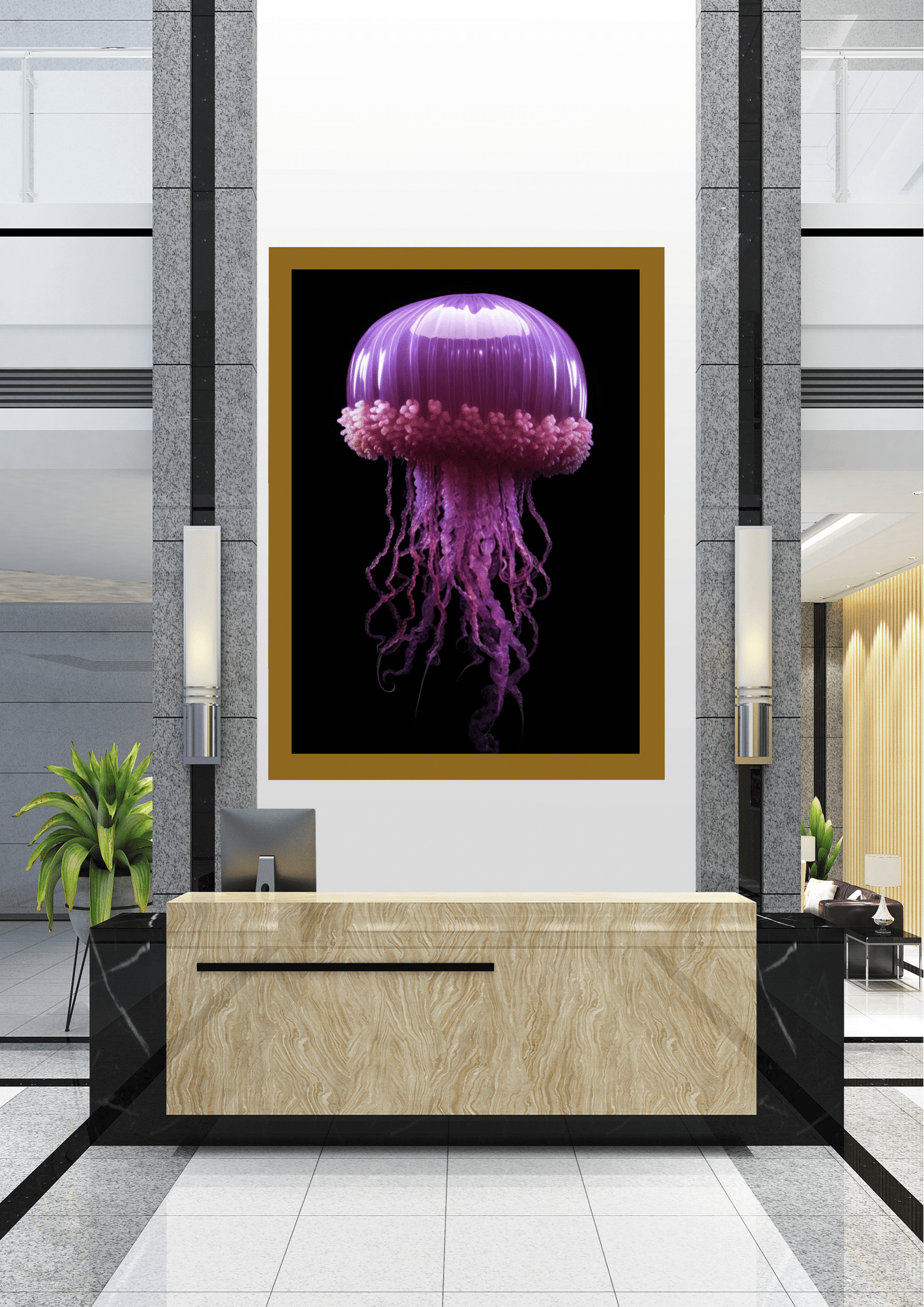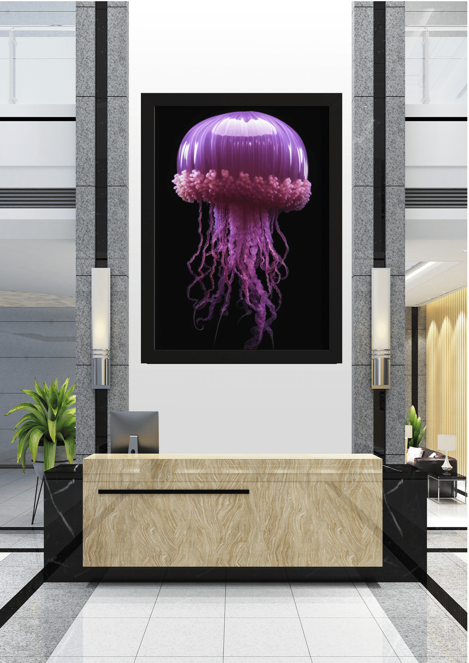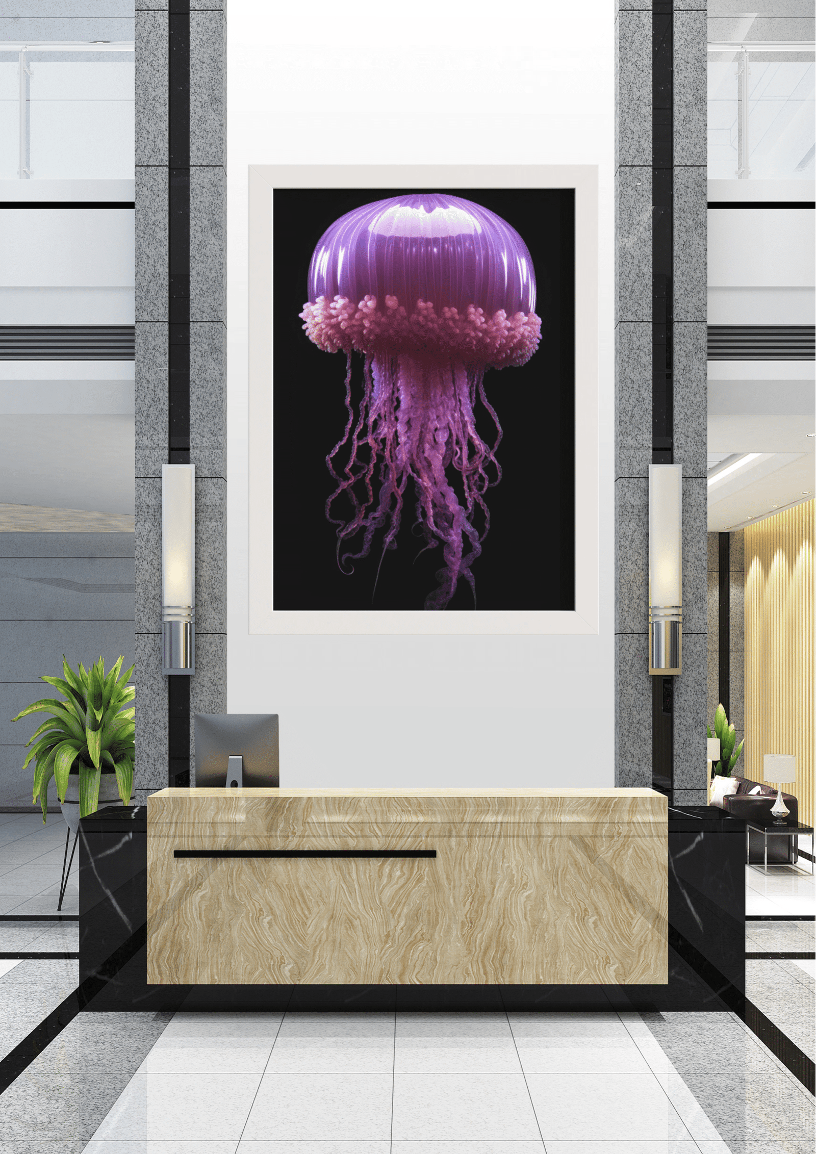 O quadro está emoldurado em preto, complementando o fundo escuro da imagem e direcionando o foco para a água-viva luminosa. Ele está pendurado em uma parede branca entre colunas de granito cinza, criando um ponto focal dramático em um ambiente moderno e minimalista.