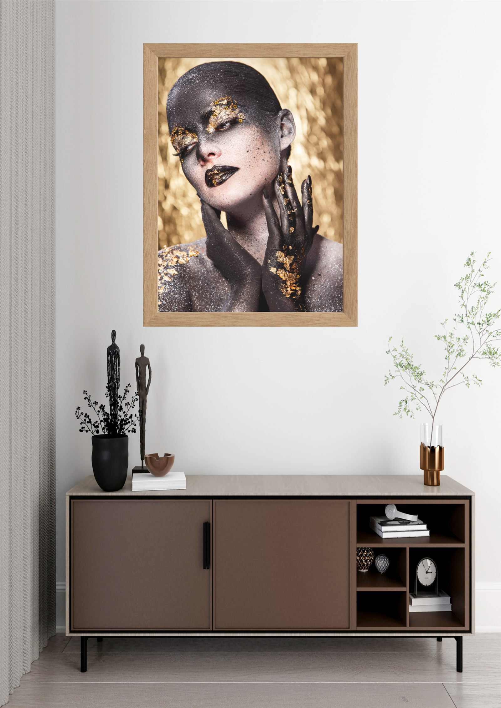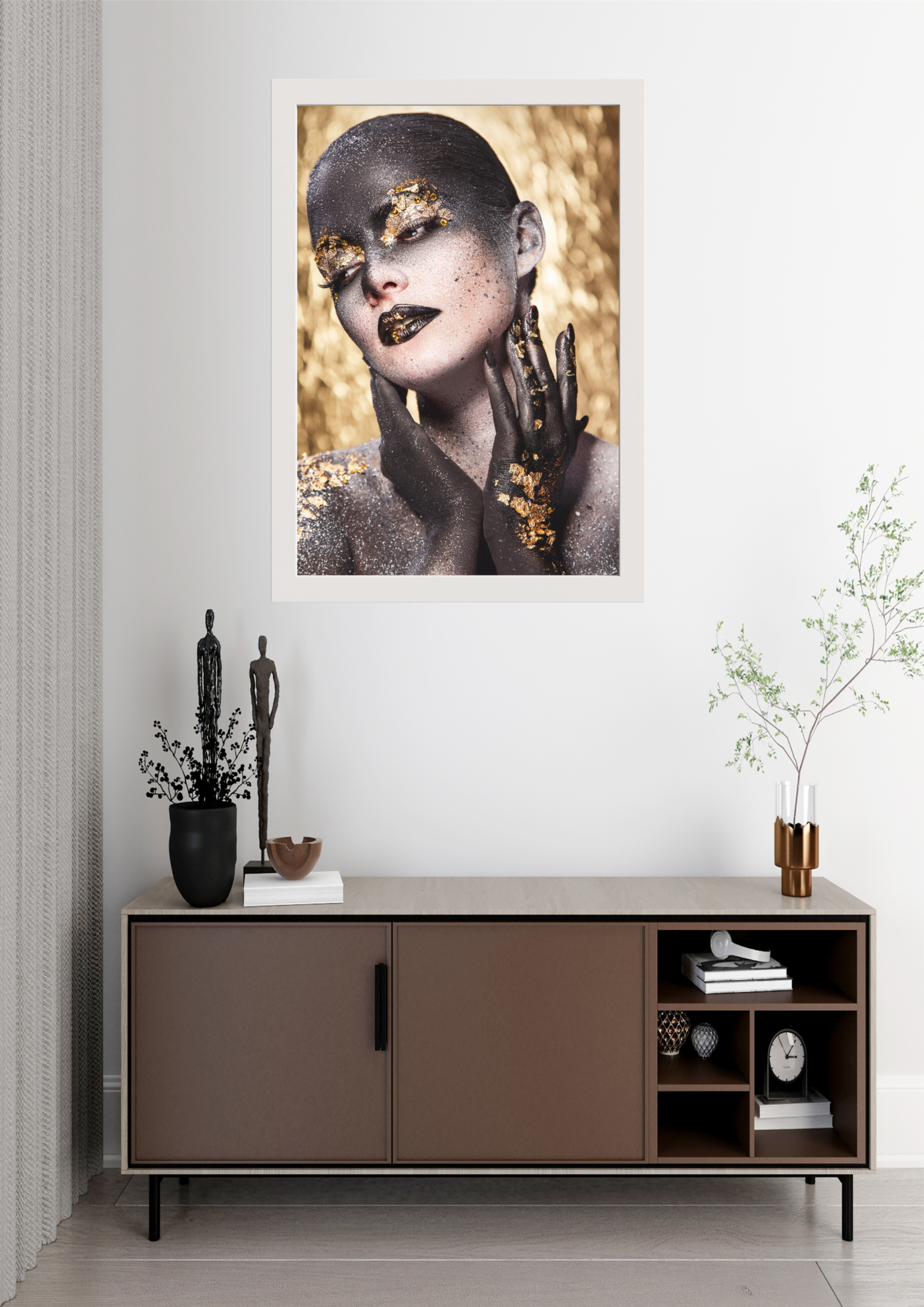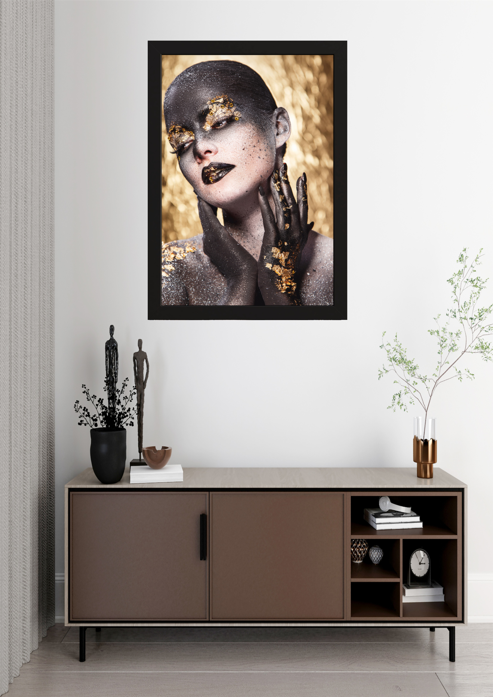 A obra “Metamorfose Dourada” captura a essência de uma transformação artística e simbólica. A imagem centraliza uma figura feminina envolta em um caleidoscópio de tons dourados e negros, simbolizando a dualidade entre a luz e a sombra. O uso de maquiagem artística e folhas de ouro cria um efeito visual impressionante, destacando a beleza e a complexidade da figura retratada. A expressão serena e o olhar fechado sugerem um estado de introspecção e paz interior, enquanto as mãos elegantemente posicionadas adicionam um toque de graça e sofisticação. O fundo dourado complementa a composição, evocando uma sensação de luxo e opulência. Esta obra, quando exibida em um ambiente minimalista, como na imagem, transforma o espaço, conferindo-lhe um ar de modernidade e elegância. Ideal para aqueles que buscam uma peça de arte que não apenas decore, mas também inspire reflexão e admiração.
