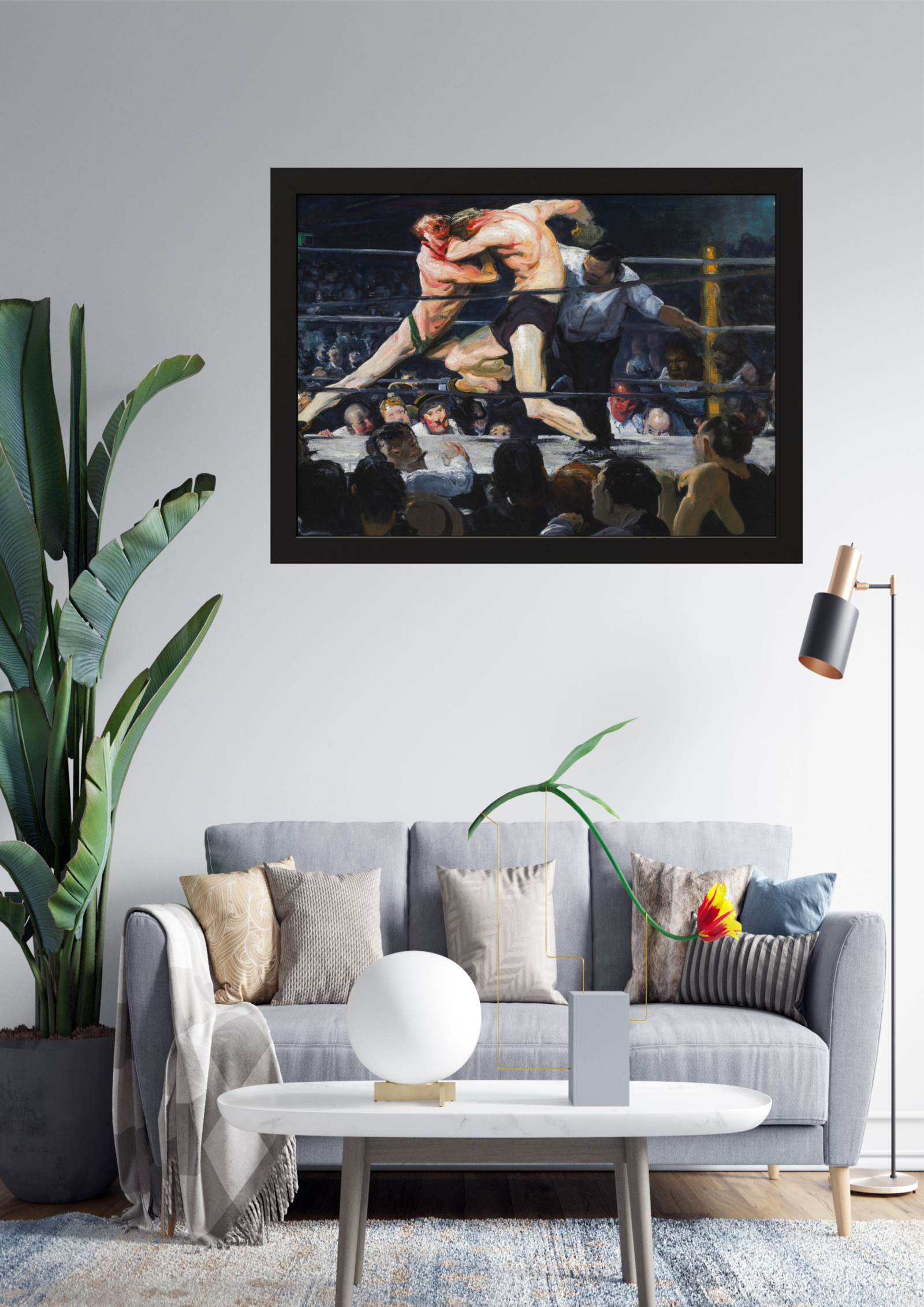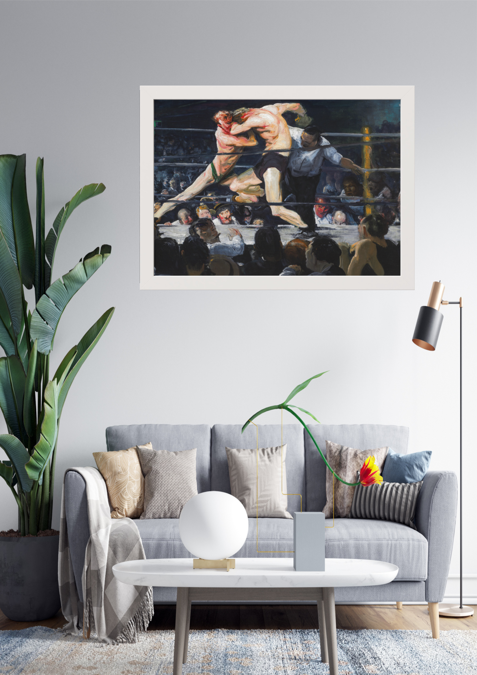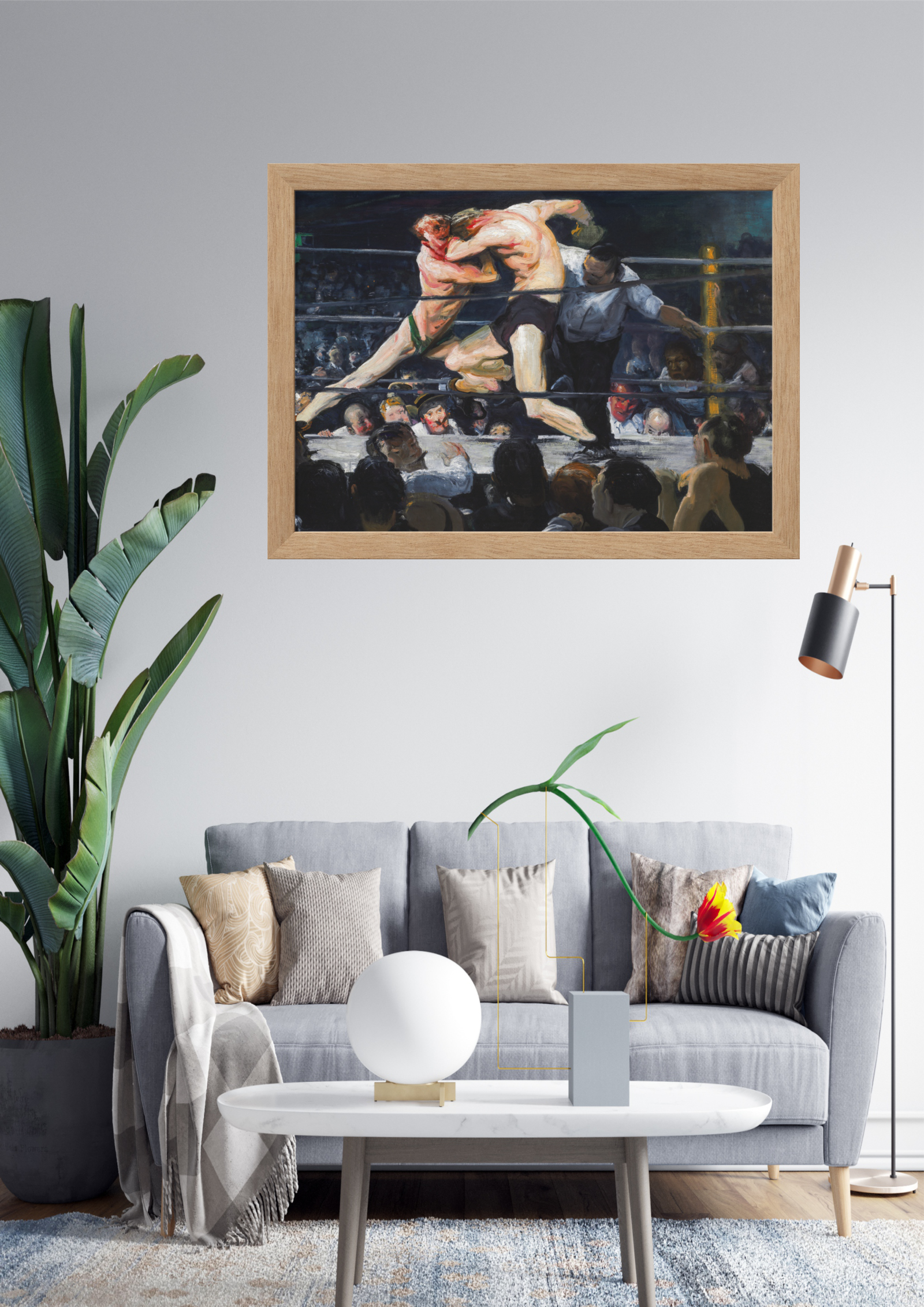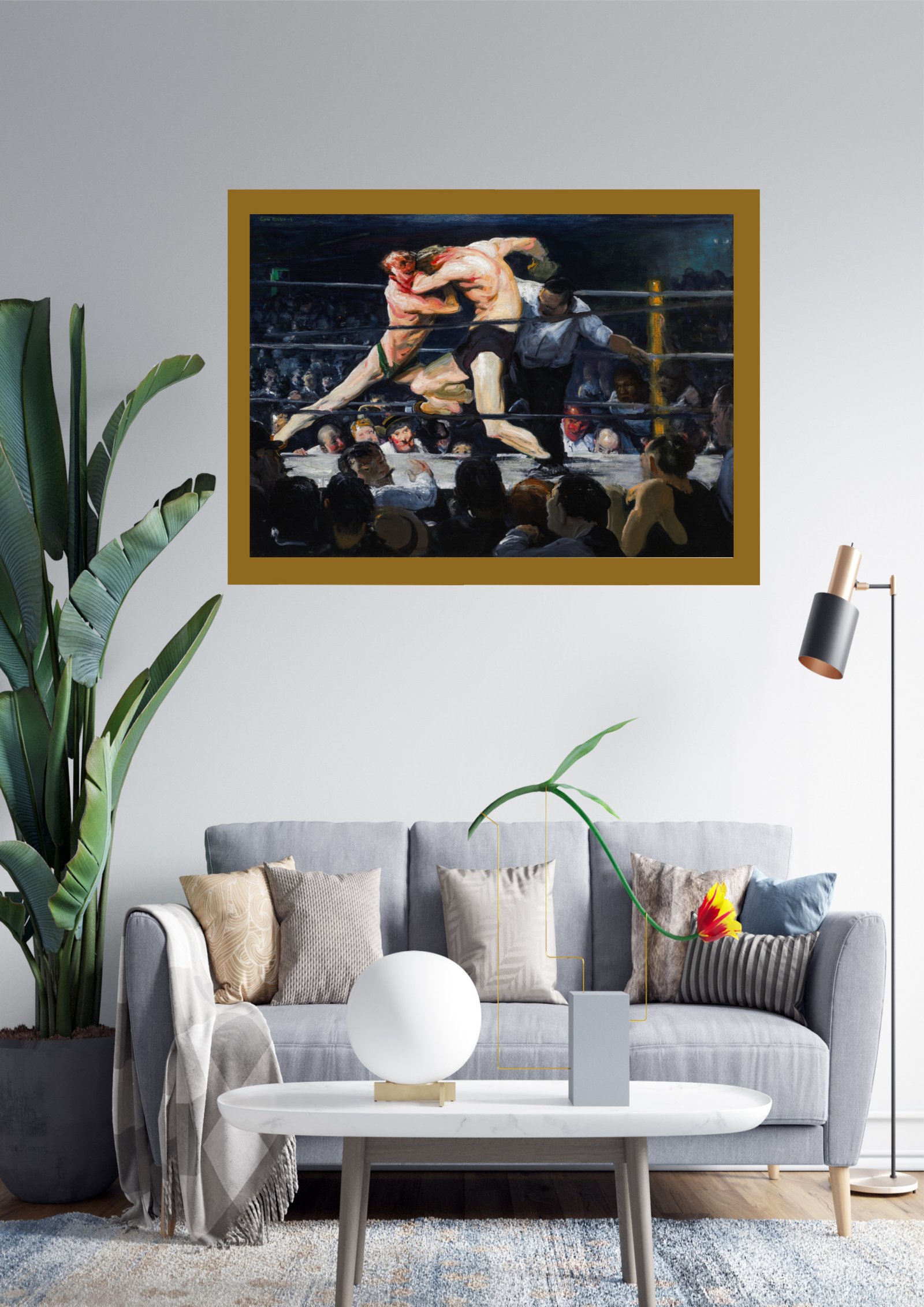 “A Luta no Ringue” Esta imagem retrata uma cena vibrante e dinâmica de uma luta de boxe, capturada em uma pintura que exala energia e emoção. O movimento dos lutadores é intensamente realista, com pinceladas que transmitem a tensão e a força do combate. O público ao redor, imerso na ação, adiciona profundidade e contexto à cena.
