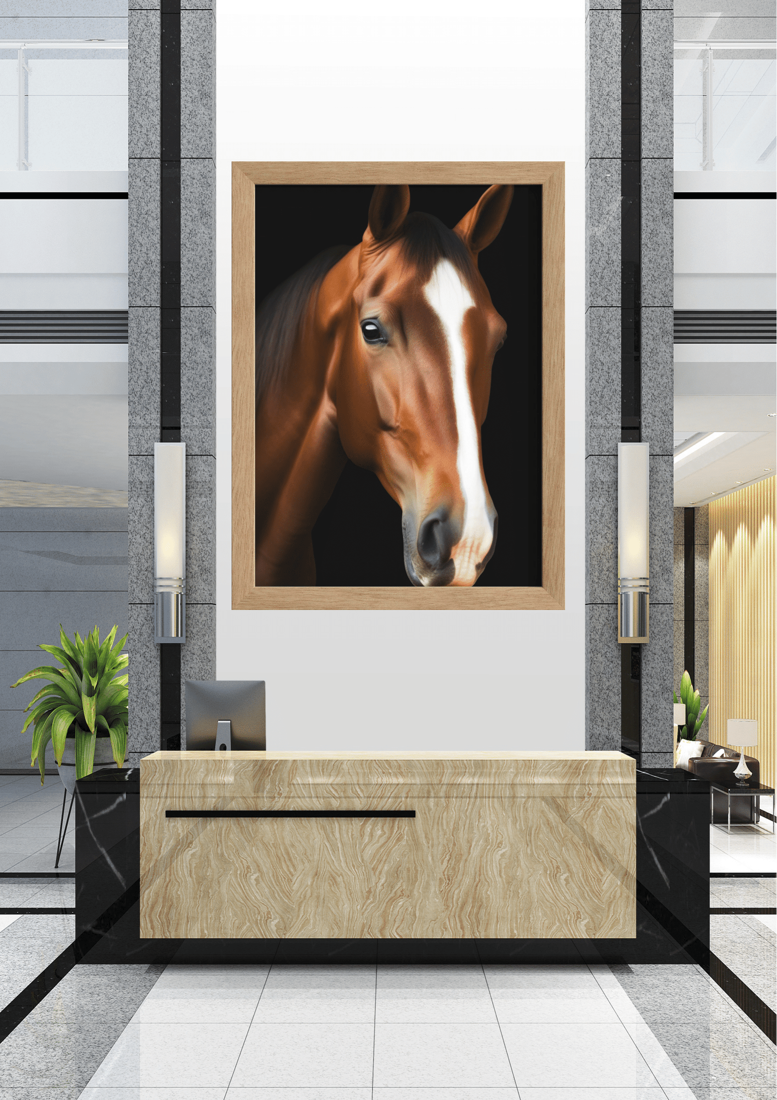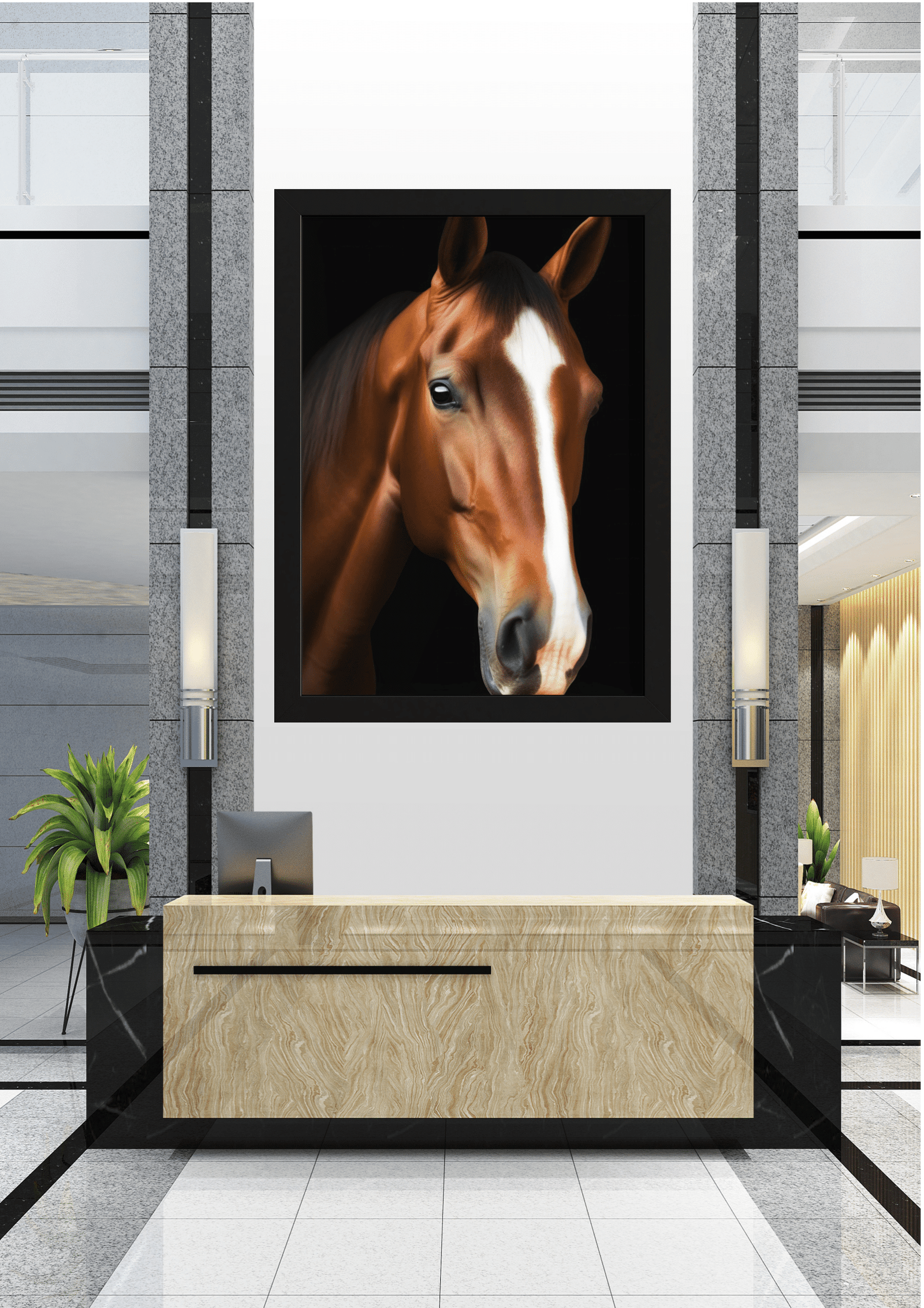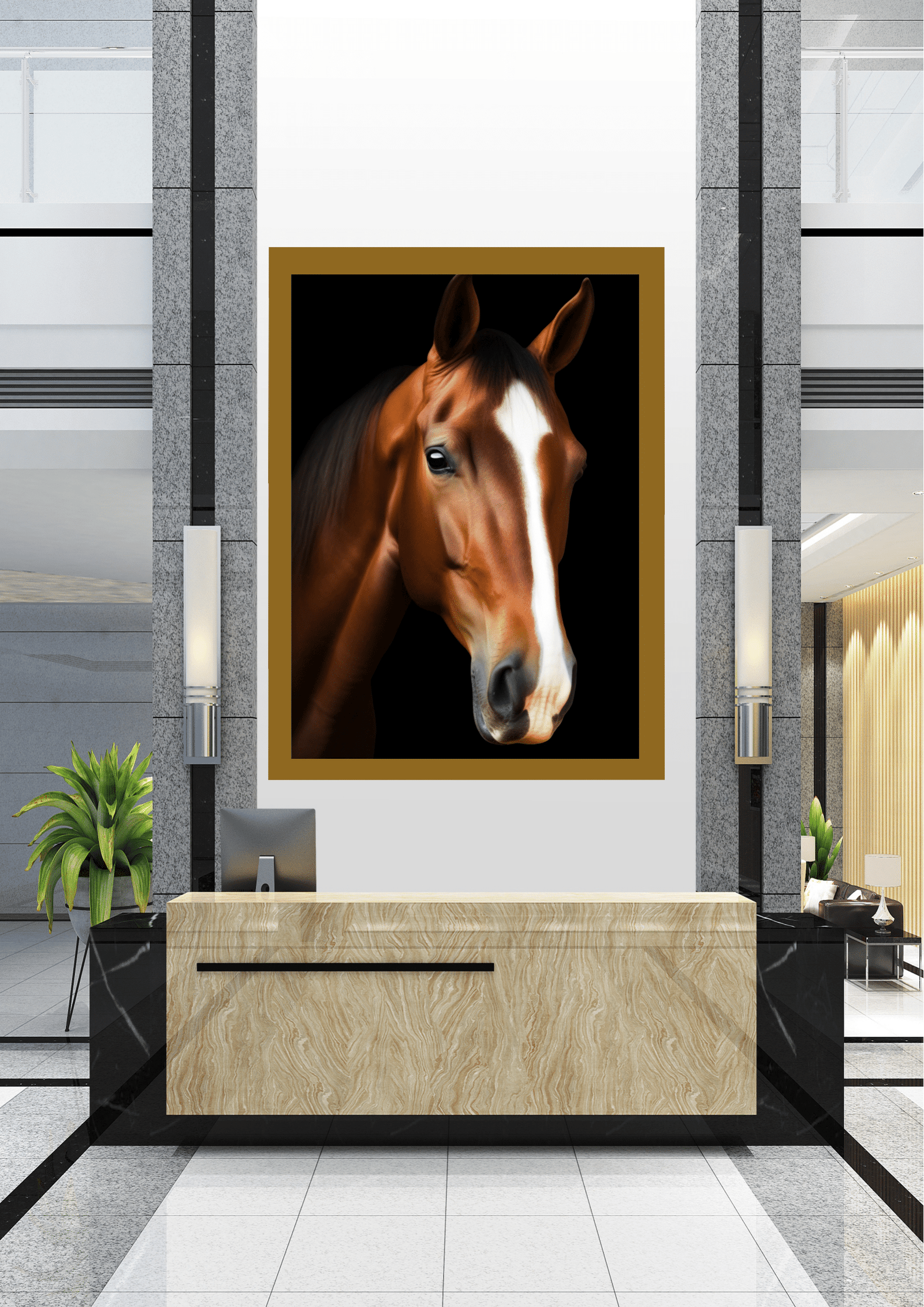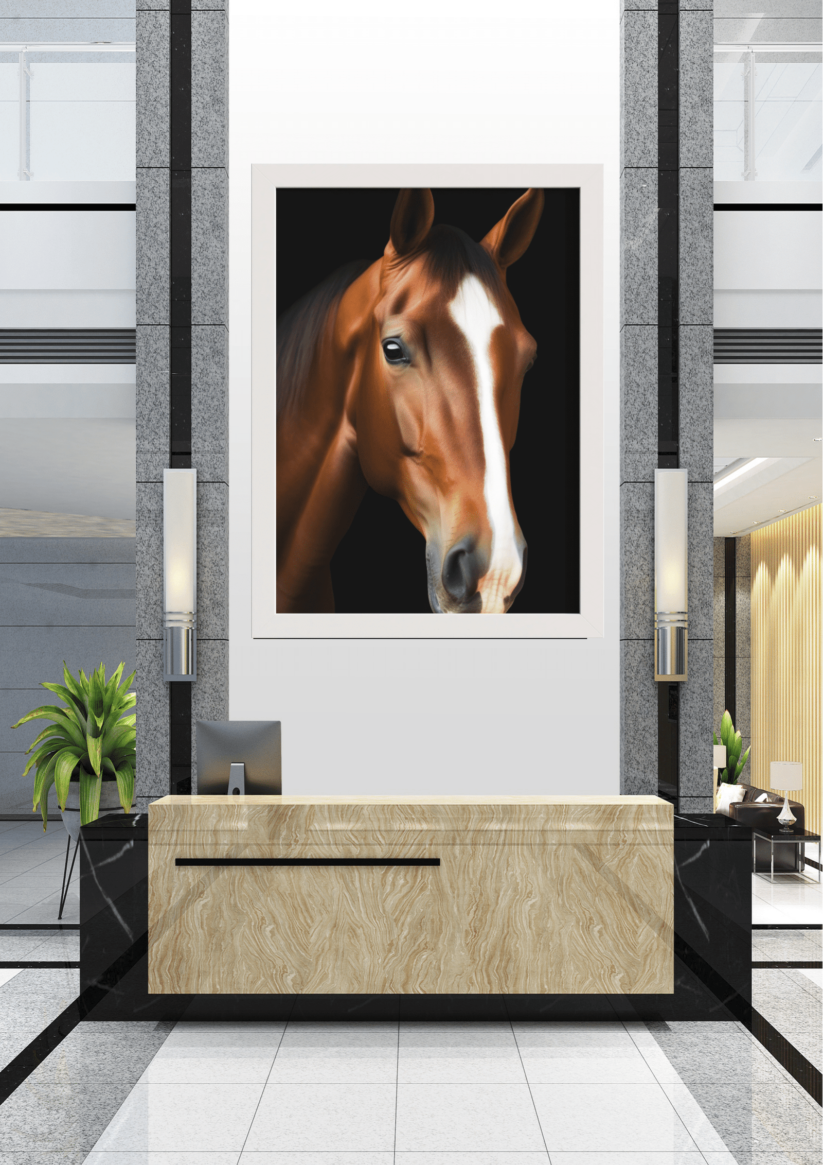 Este quadro não é apenas uma peça decorativa, mas um ponto focal que transforma o ambiente. Posicionado estrategicamente em uma parede branca, entre colunas de granito cinza, o retrato do cavalo se torna o centro das atenções em um espaço que mescla elementos naturais e artificiais.