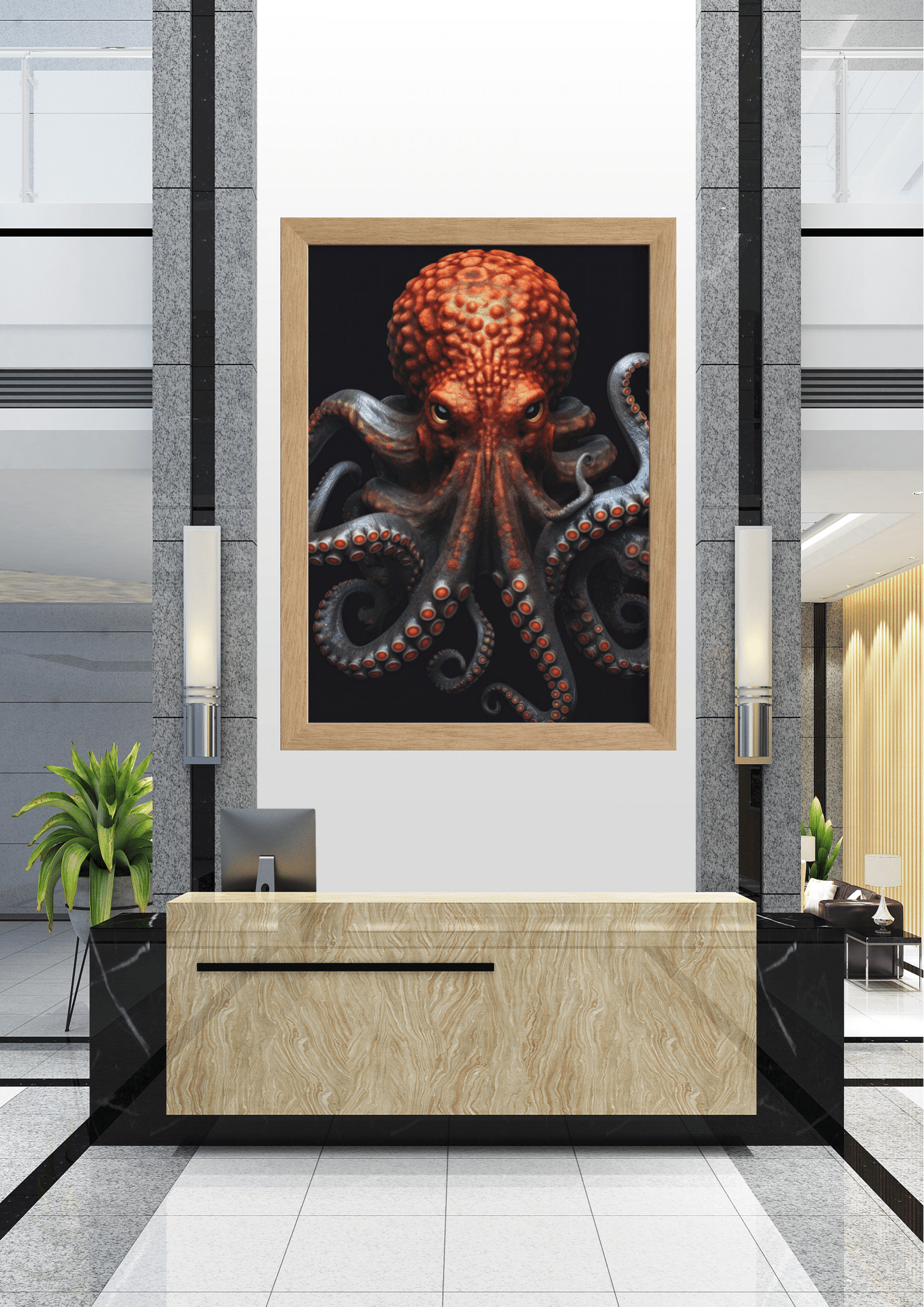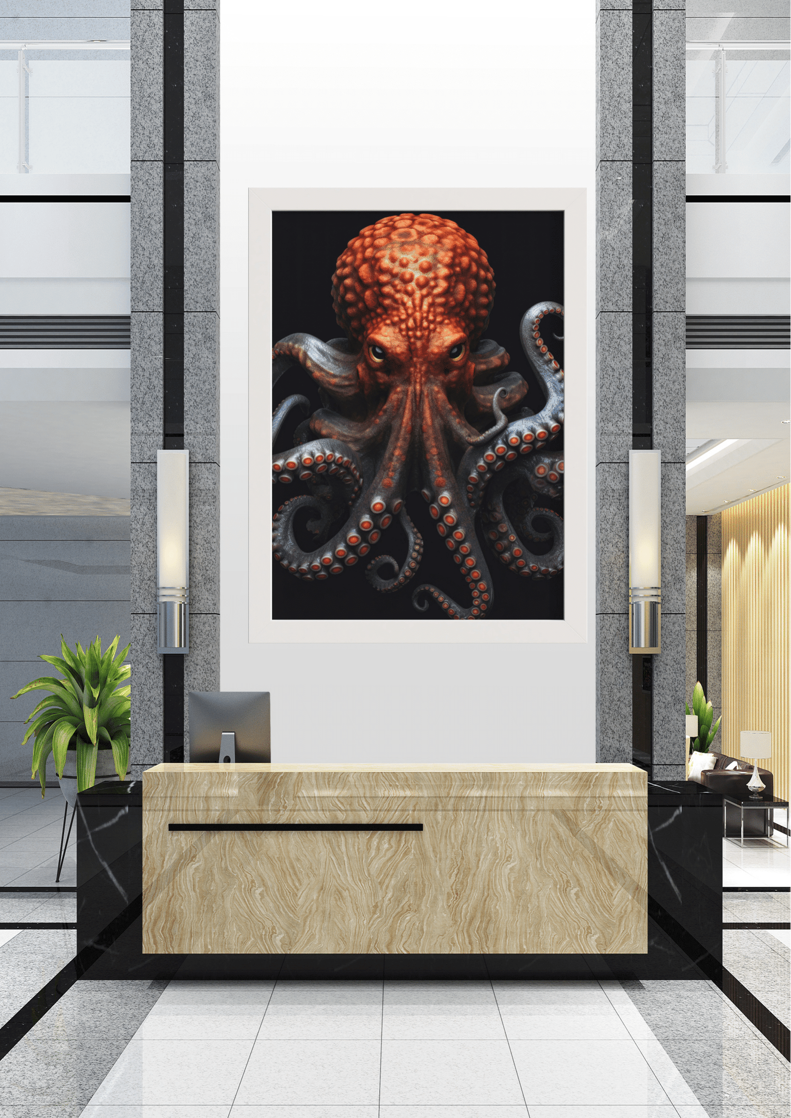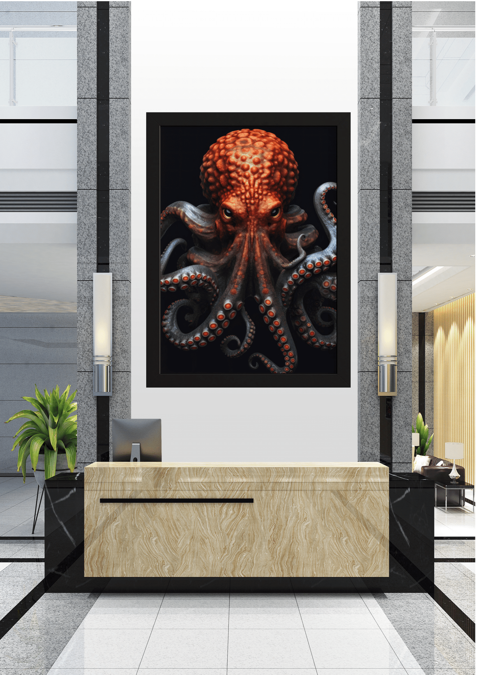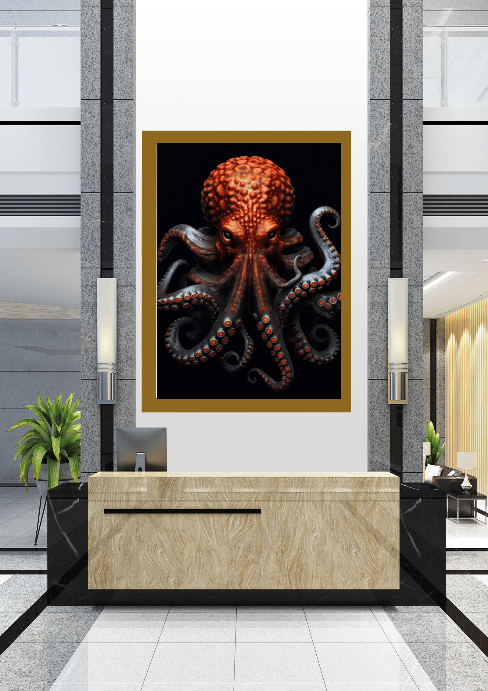 O quadro está posicionado acima de um balcão de recepção em mármore claro, em um lobby elegante. Colunas de granito cinza flanqueiam a obra, enquanto plantas decorativas e equipamentos modernos completam o ambiente, criando um equilíbrio interessante entre o orgânico e o artificial.