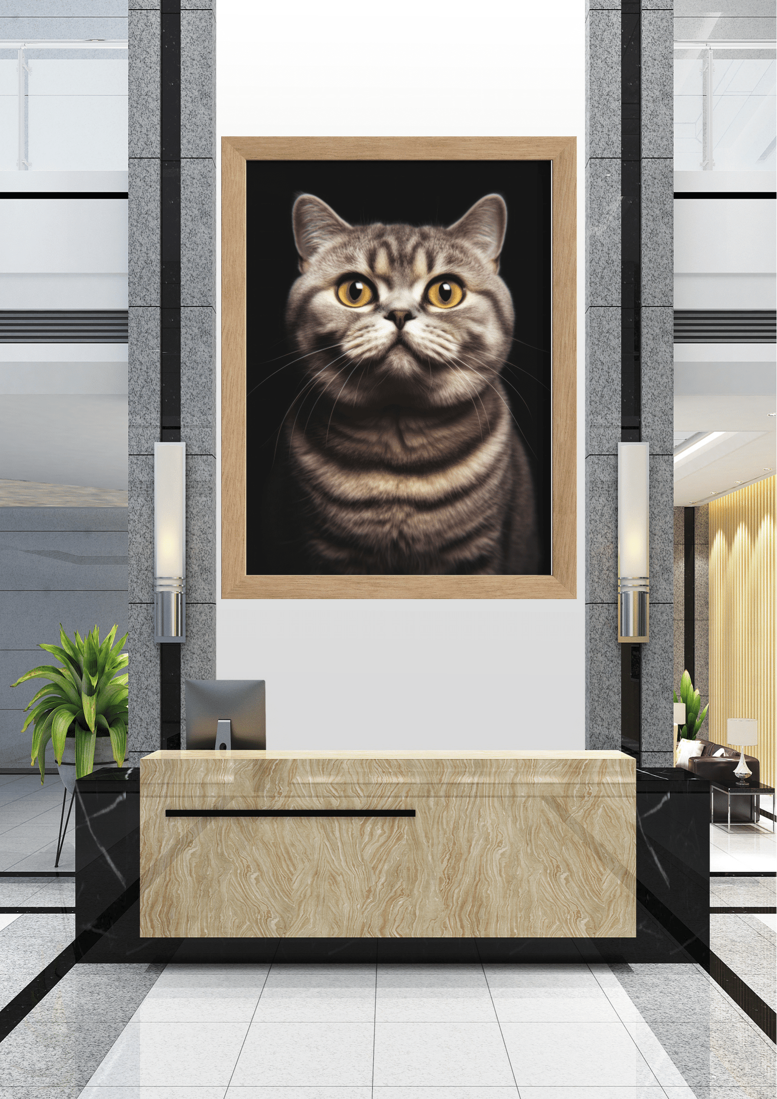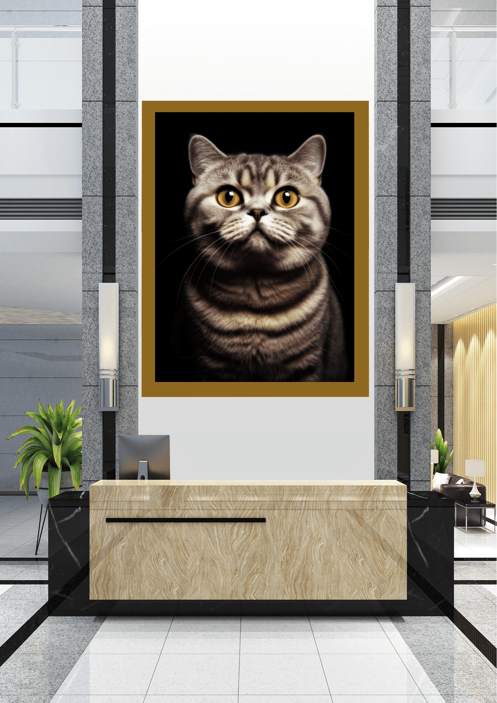 Neste elegante saguão, o destaque é um imponente retrato de um gato de olhar penetrante. A imagem, emoldurada em preto, contrasta com o ambiente moderno, composto por mármore e detalhes metálicos. O gato, com seus olhos dourados e expressivos, parece observar atentamente quem entra, conferindo ao espaço uma atmosfera de sofisticação e curiosidade. As linhas arquitetônicas ao redor, com suas texturas de pedra e madeira, complementam a presença marcante do felino, criando uma harmonia entre arte e design. Esta escolha decorativa não só embeleza o ambiente, mas também provoca uma sensação de acolhimento e vigilância, tornando a recepção memorável para visitantes e funcionários.