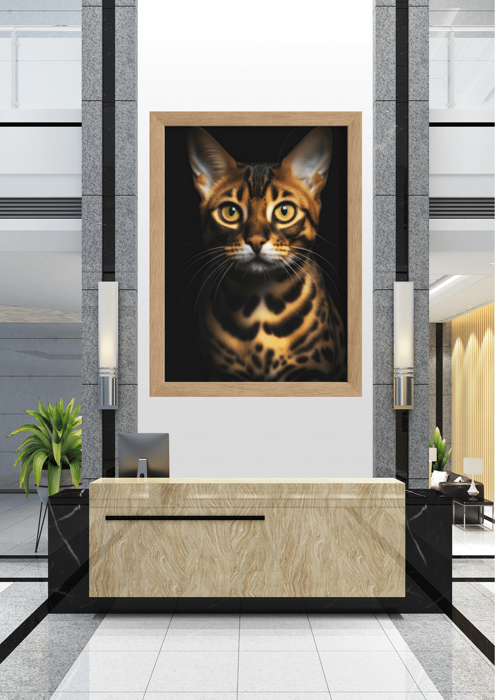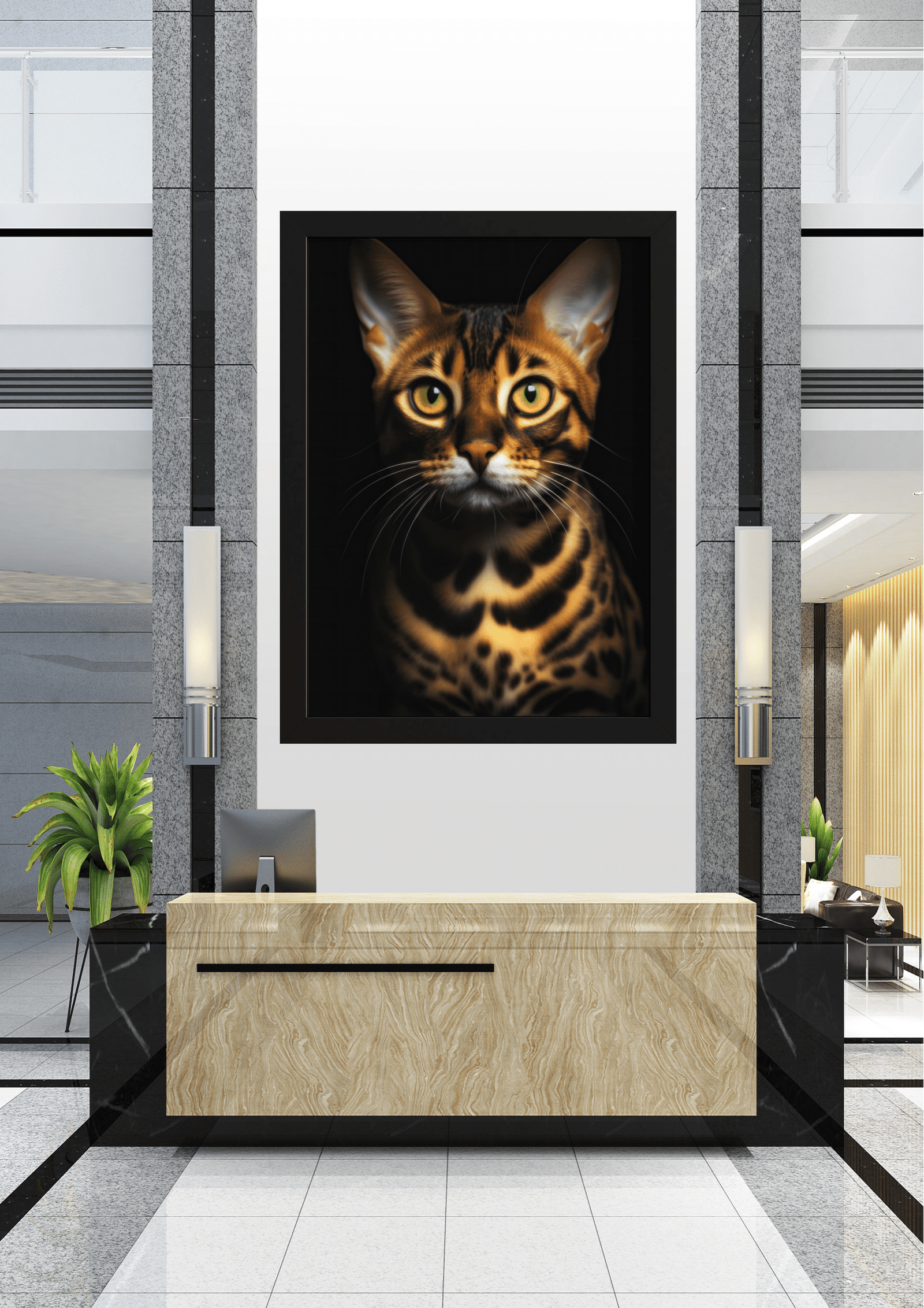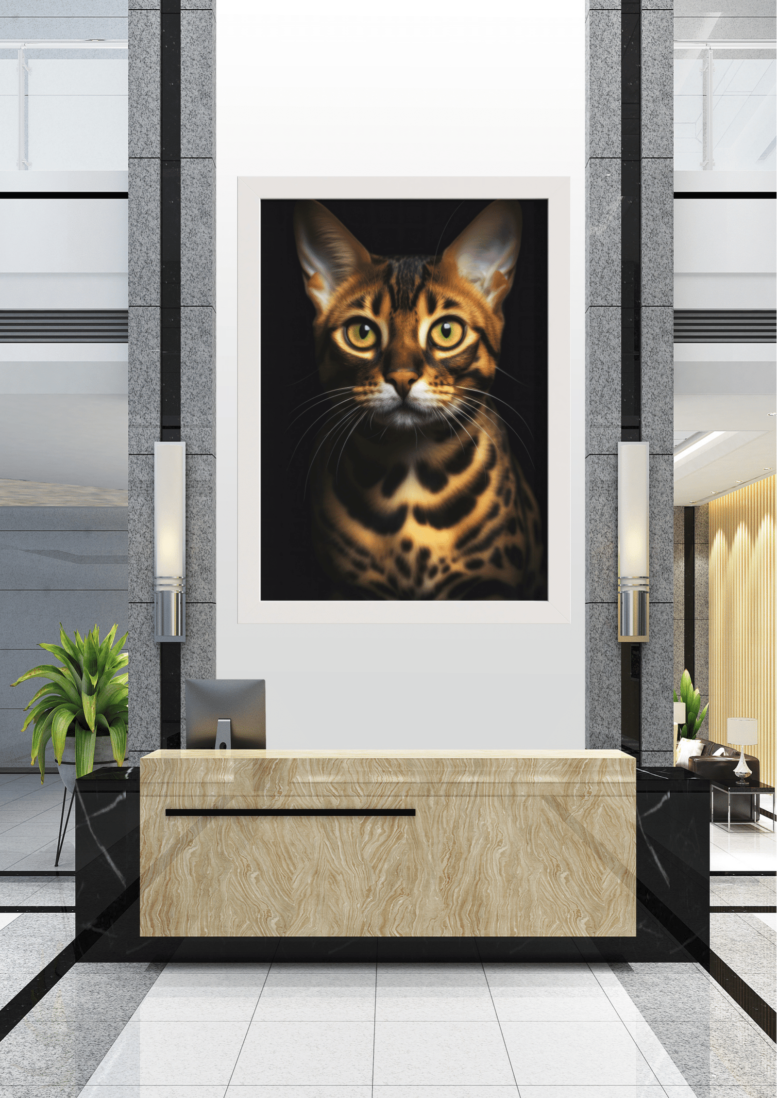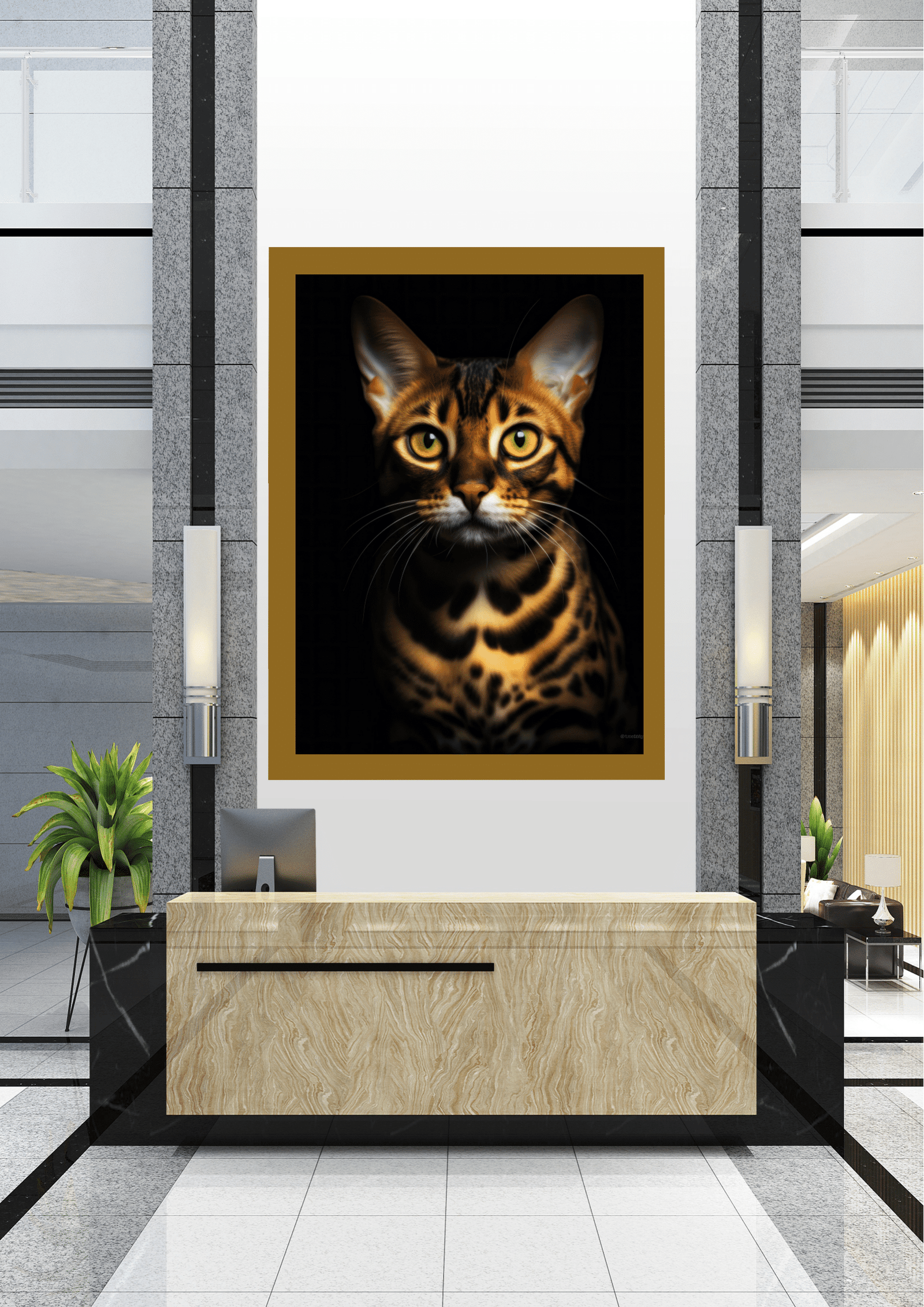 No coração de um saguão moderno e sofisticado, destaca-se uma impressionante obra de arte: um retrato de um gato de pelagem exótica e olhar penetrante. Este majestoso felino, com suas manchas marcantes e olhos expressivos, parece vigiar o ambiente com uma presença quase real. O quadro, emoldurado em preto, contrasta harmoniosamente com as paredes de mármore e os detalhes em metal do espaço, criando um ponto focal que atrai todos os olhares.