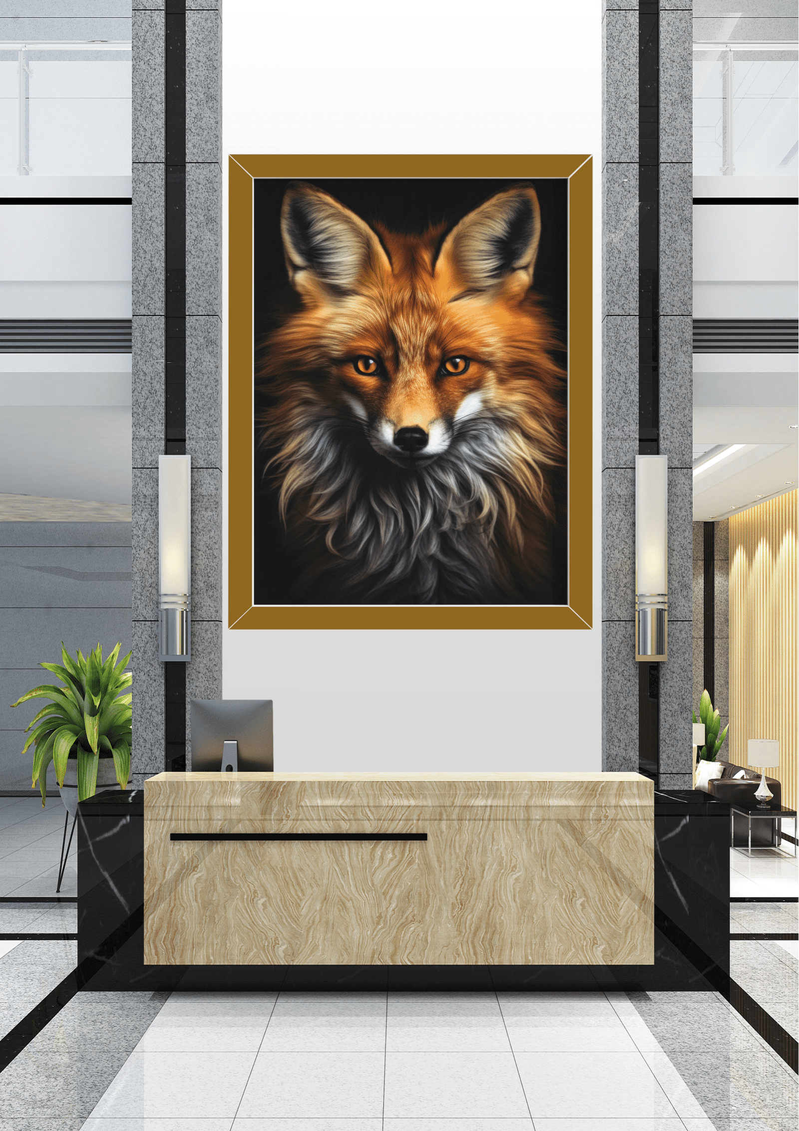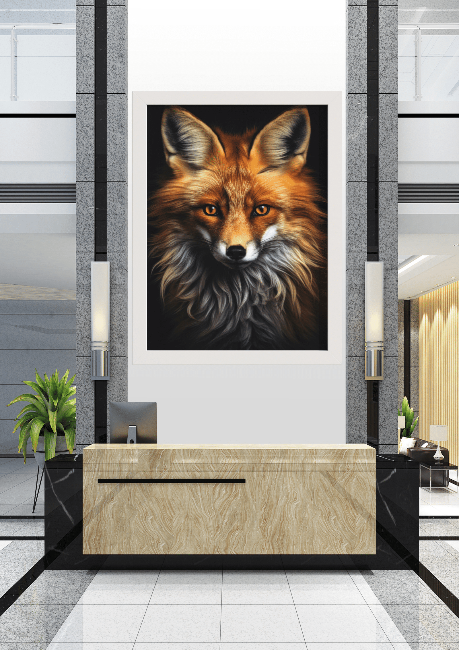 No coração de um moderno saguão empresarial, uma majestosa pintura de uma raposa rouba a cena. Com seus olhos penetrantes e pelagem exuberante, a raposa parece vigiar o espaço com uma presença quase mística. A obra, emoldurada em preto, contrasta elegantemente com as paredes claras e o design contemporâneo do ambiente. À frente, um balcão de recepção em mármore e detalhes em preto complementa a sofisticação do local. Plantas verdes adicionam um toque de natureza, harmonizando com a imagem do animal selvagem. Este espaço não é apenas uma entrada, mas uma introdução ao equilíbrio entre arte, natureza e arquitetura moderna, criando uma atmosfera acolhedora e intrigante para visitantes e funcionários.