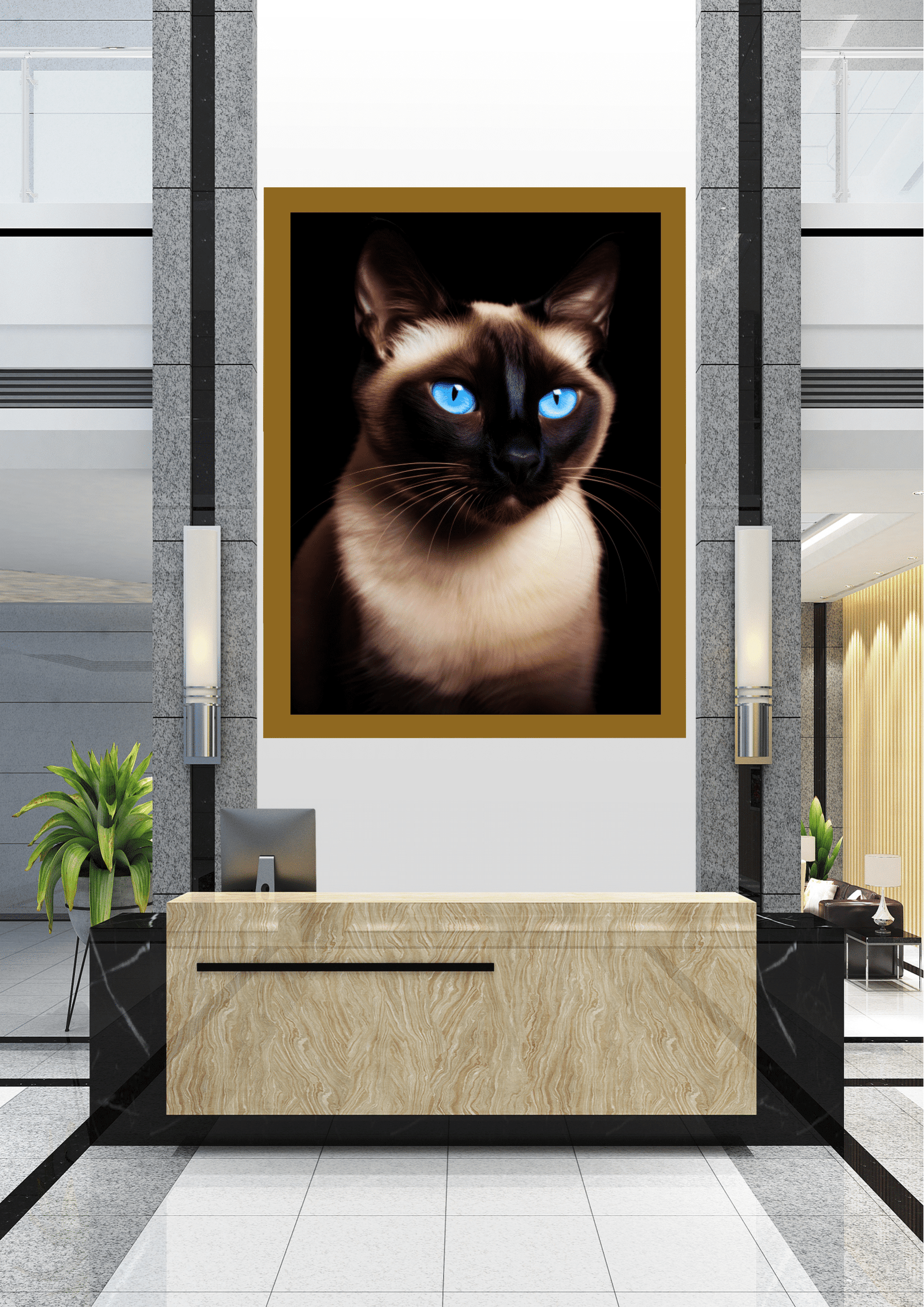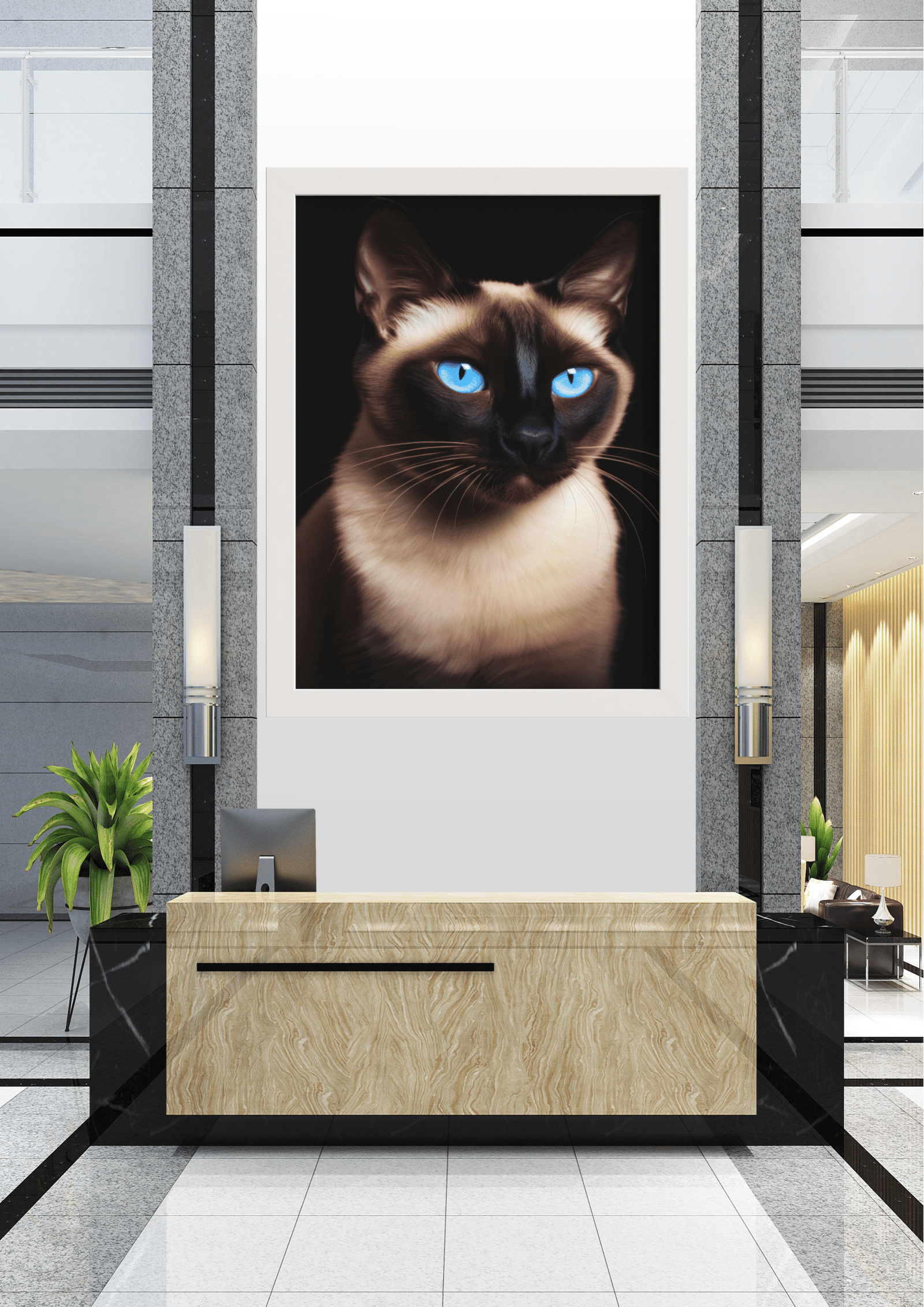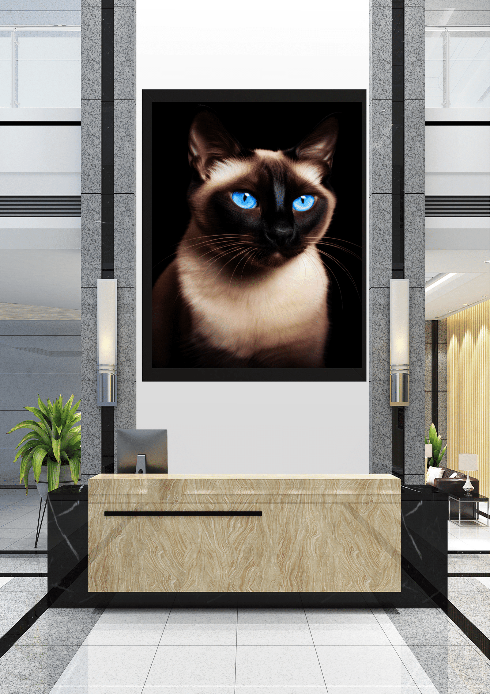Na recepção de um edifício moderno, uma imponente imagem de um gato siamês captura imediatamente a atenção de quem entra. O felino, com seus olhos azuis penetrantes, parece vigiar o ambiente com uma presença quase majestosa. A paleta de cores do pelo, em tons de marrom e bege, contrasta com o fundo escuro da fotografia, destacando ainda mais suas características marcantes.
