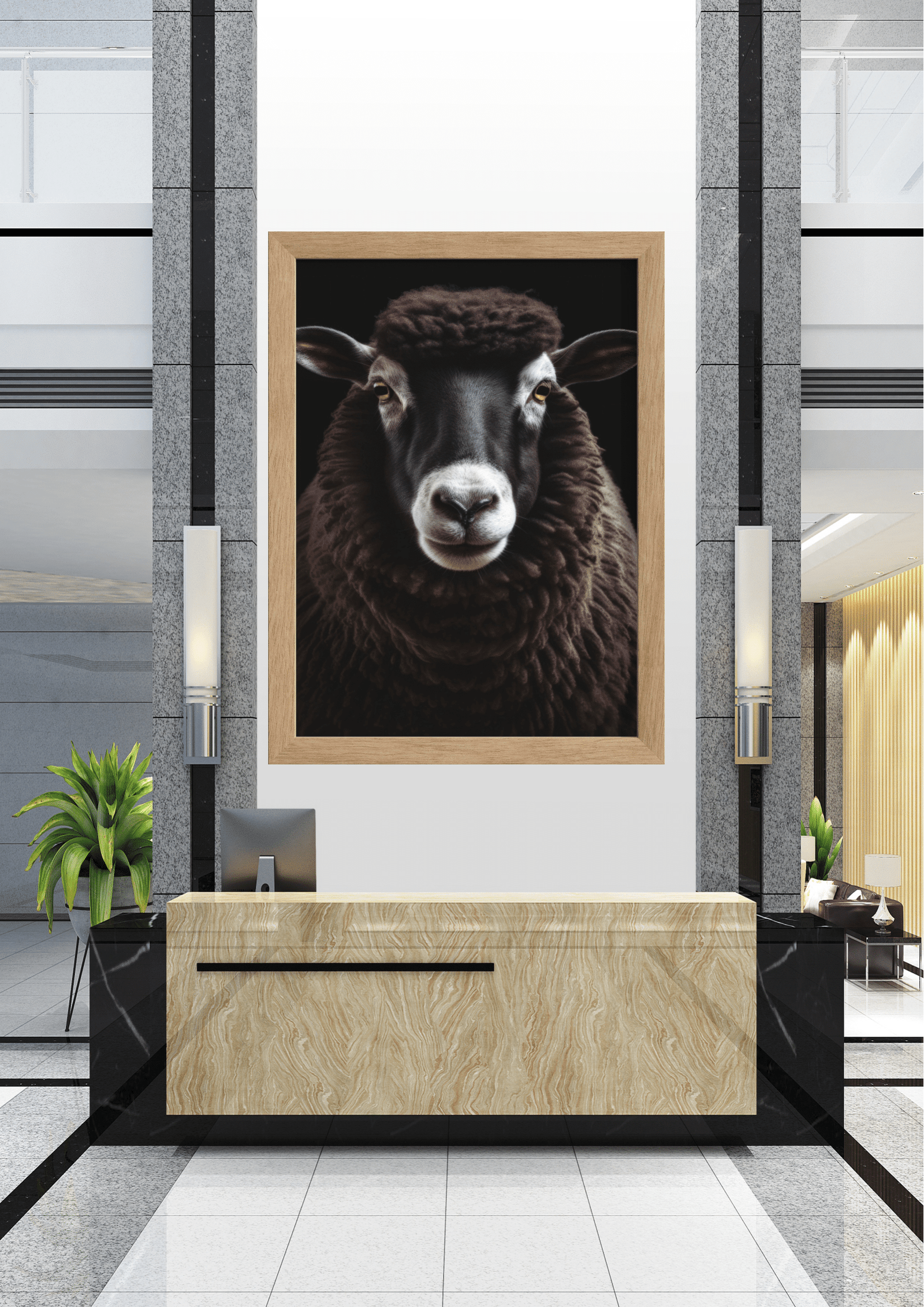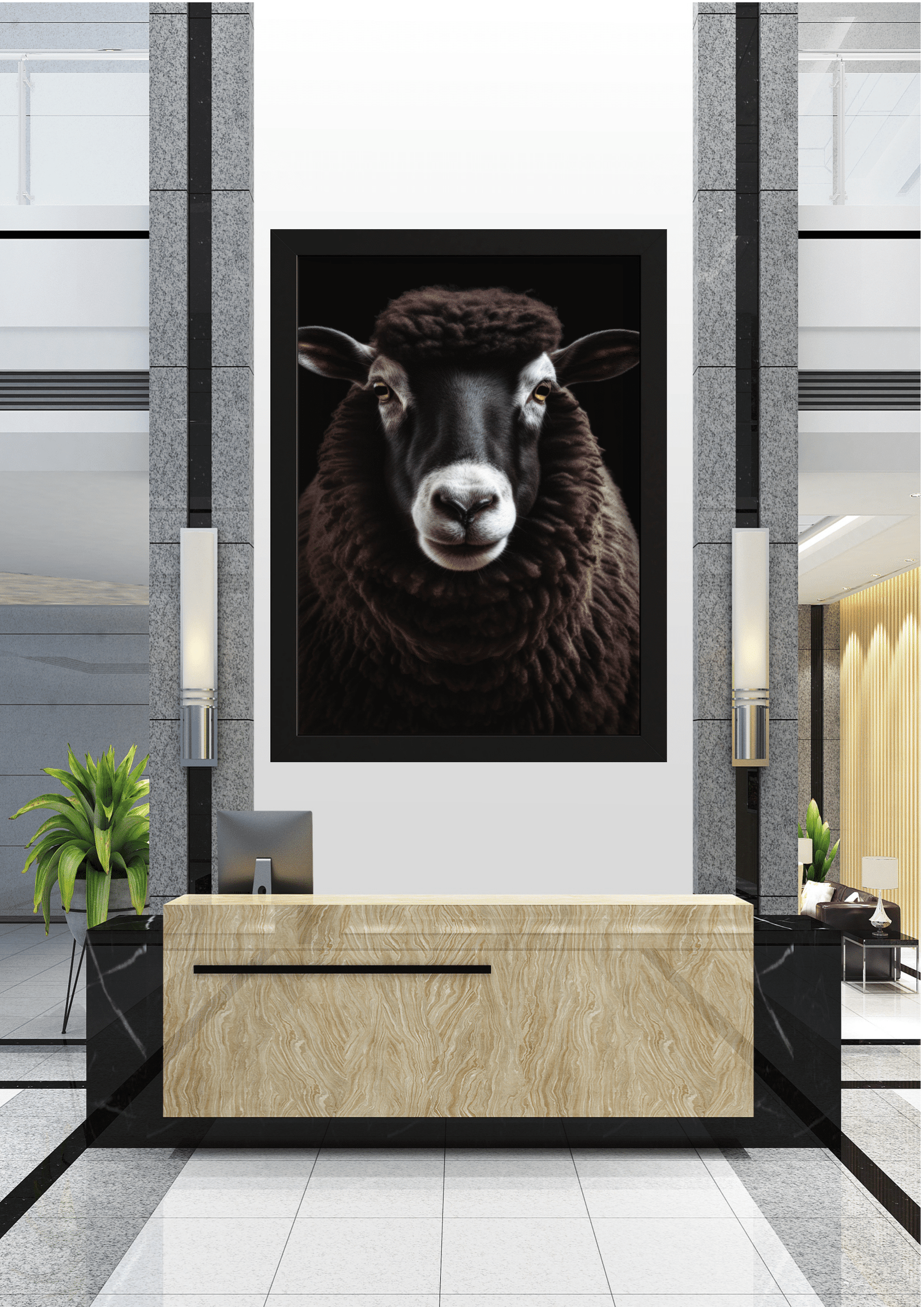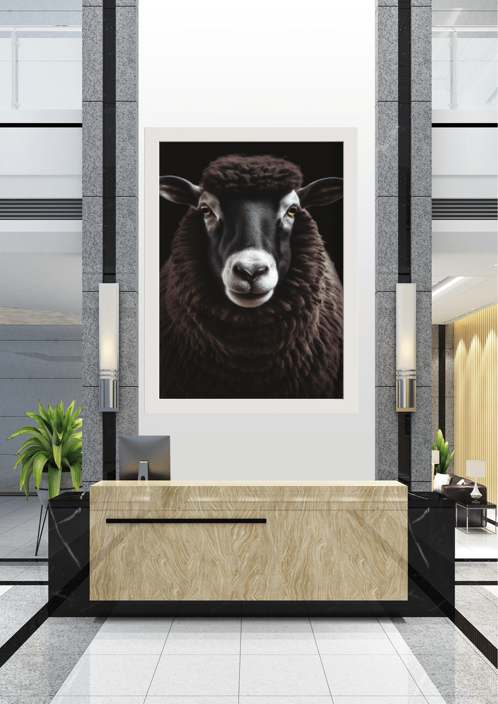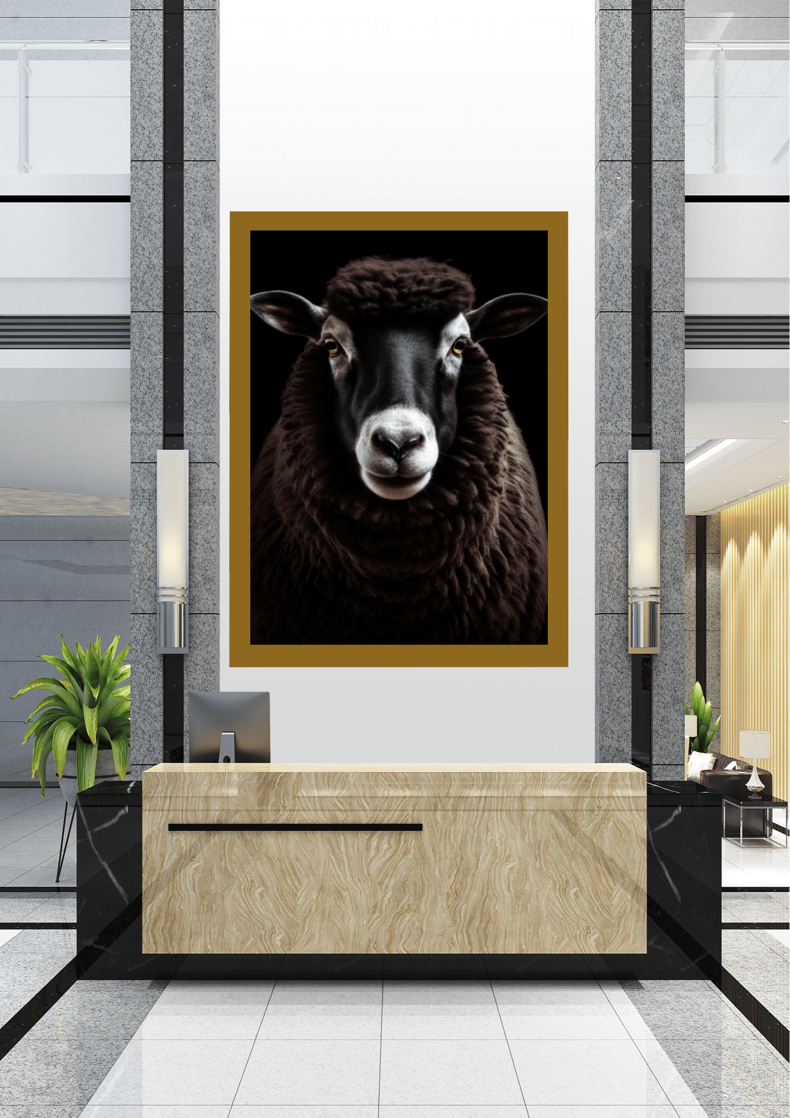 Este quadro impressionante apresenta o retrato de uma ovelha negra em um ambiente moderno e minimalista. A imagem da ovelha, capturada em um fundo escuro, destaca-se de forma dramática e intensa. O animal olha diretamente para o observador, criando uma conexão imediata e intrigante.