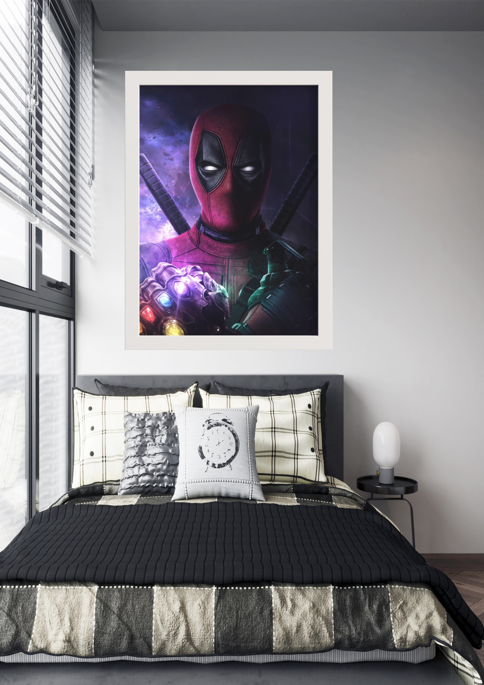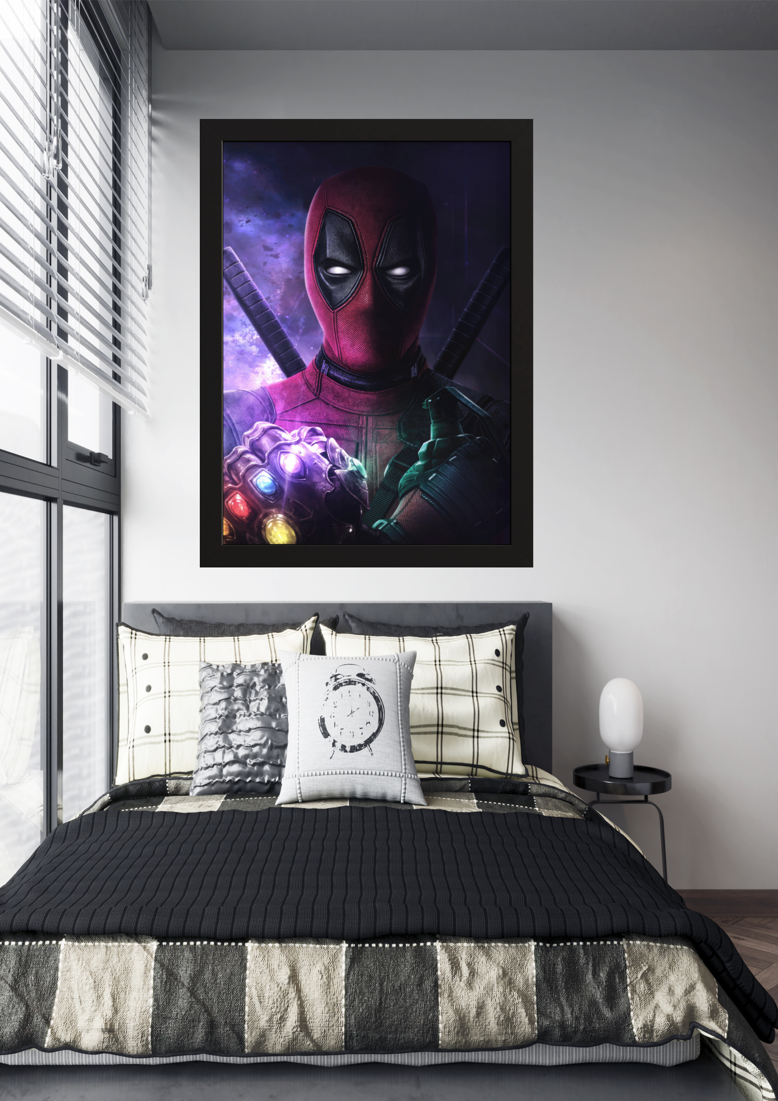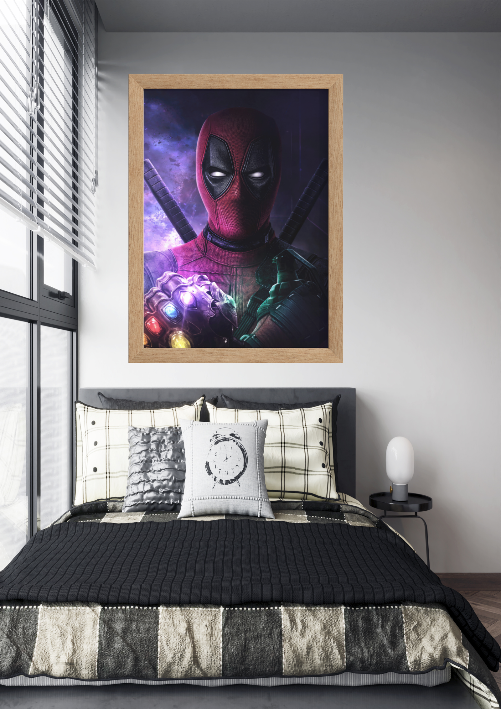 Em um quarto moderno e bem decorado, destaca-se uma impressionante obra de arte na parede, capturando a atenção com a imagem de um anti-herói icônico. Deadpool, com seu traje vermelho característico e olhar penetrante, segura a poderosa Manopla do Infinito, adornada com as brilhantes Joias do Infinito. A combinação inusitada de um personagem irreverente com um artefato de poder absoluto cria uma atmosfera intrigante e cheia de contrastes. O ambiente ao redor, com uma cama de tons neutros e almofadas cuidadosamente dispostas, oferece um equilíbrio entre o caos do universo dos quadrinhos e a serenidade do espaço pessoal. Esta imagem não só enriquece o quarto com sua presença vibrante, mas também convida à reflexão sobre o impacto dos heróis e vilões em nossa imaginação.