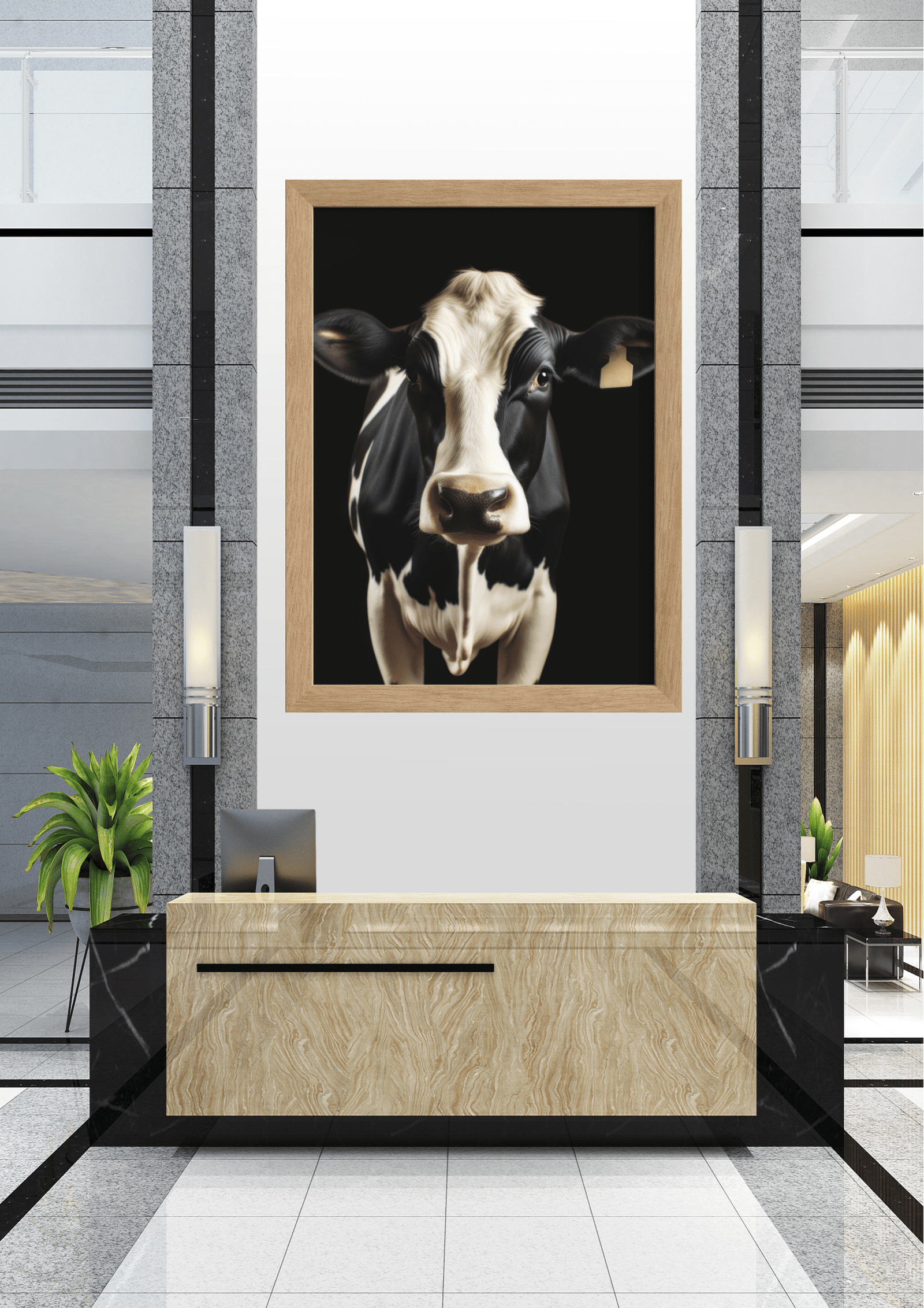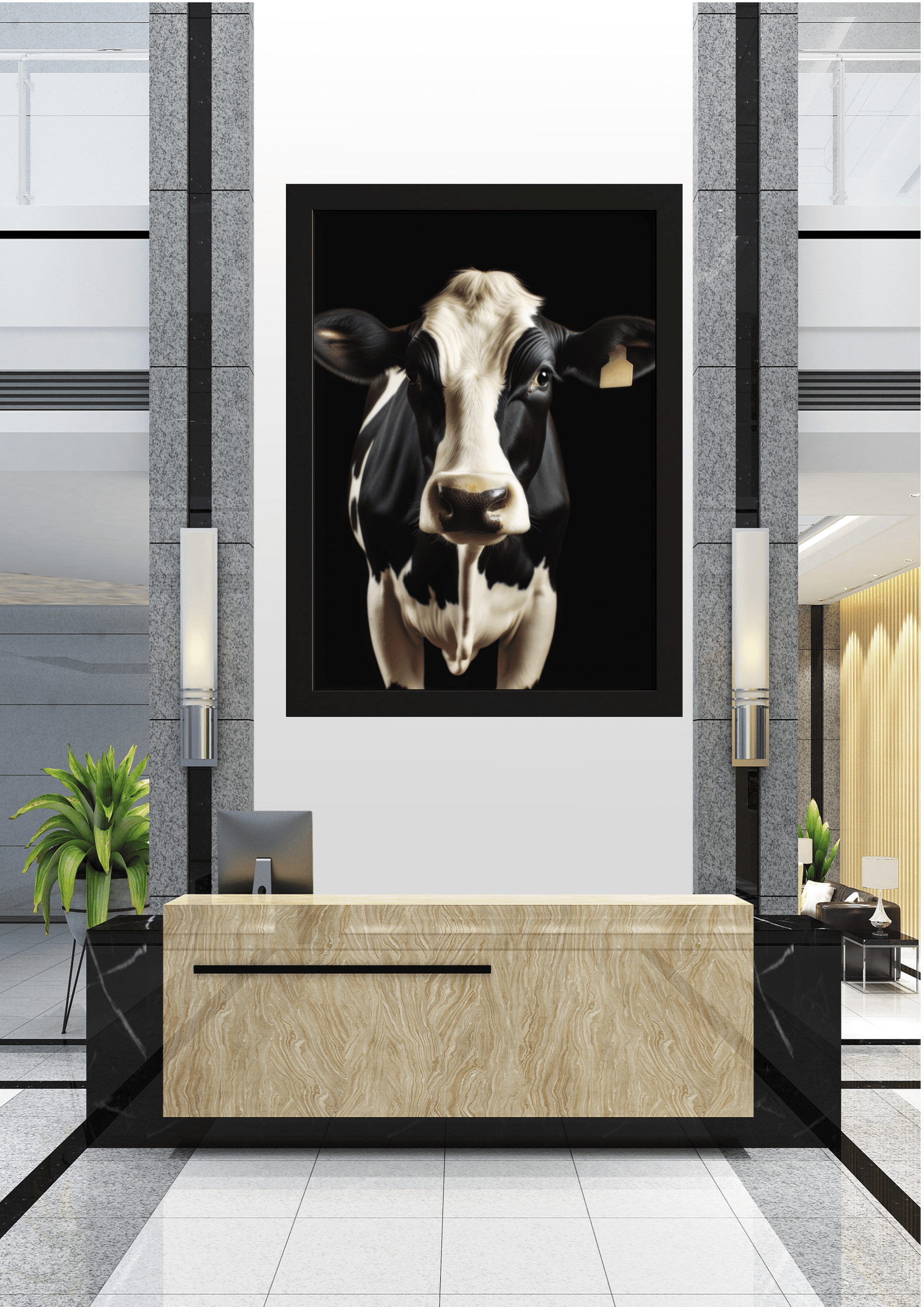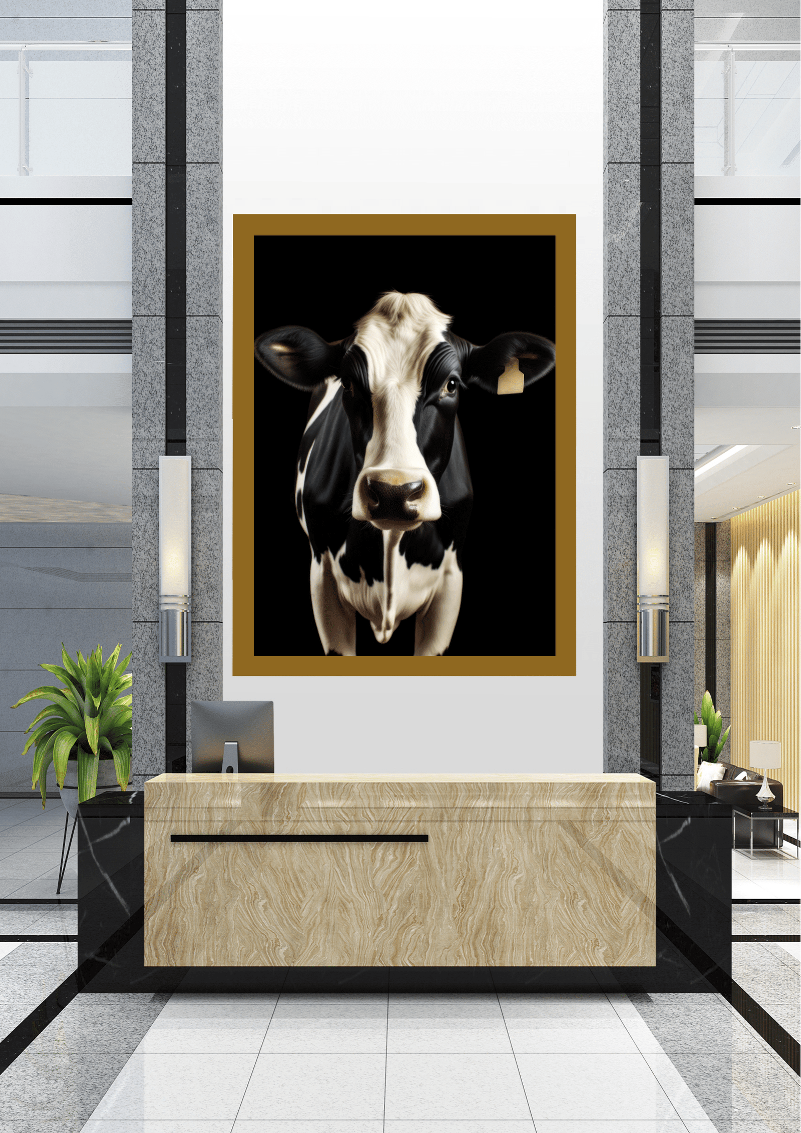 Este quadro impressionante apresenta uma fusão única entre o rústico e o contemporâneo, destacando-se em um ambiente moderno e minimalista. No centro da composição, vemos o retrato majestoso de uma vaca Holstein, conhecida por seu padrão distintivo de manchas pretas e brancas.