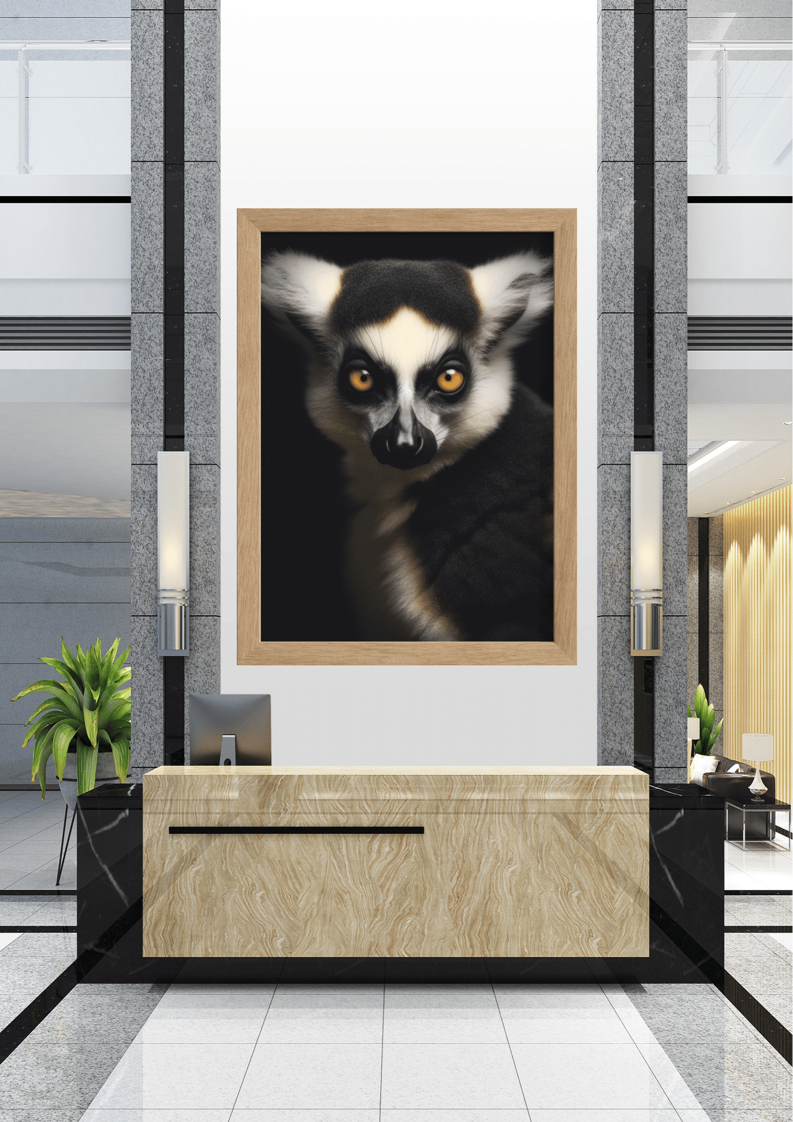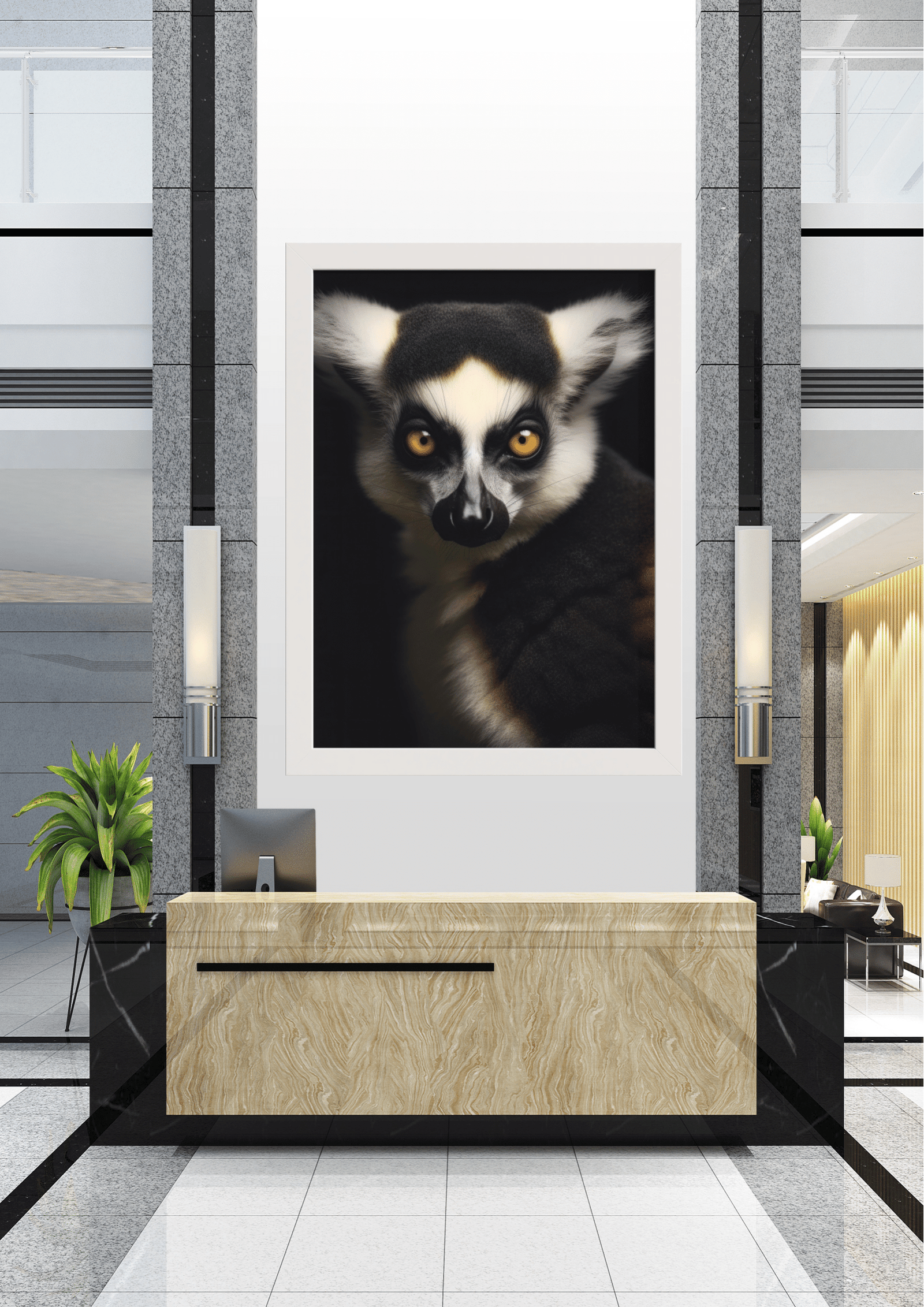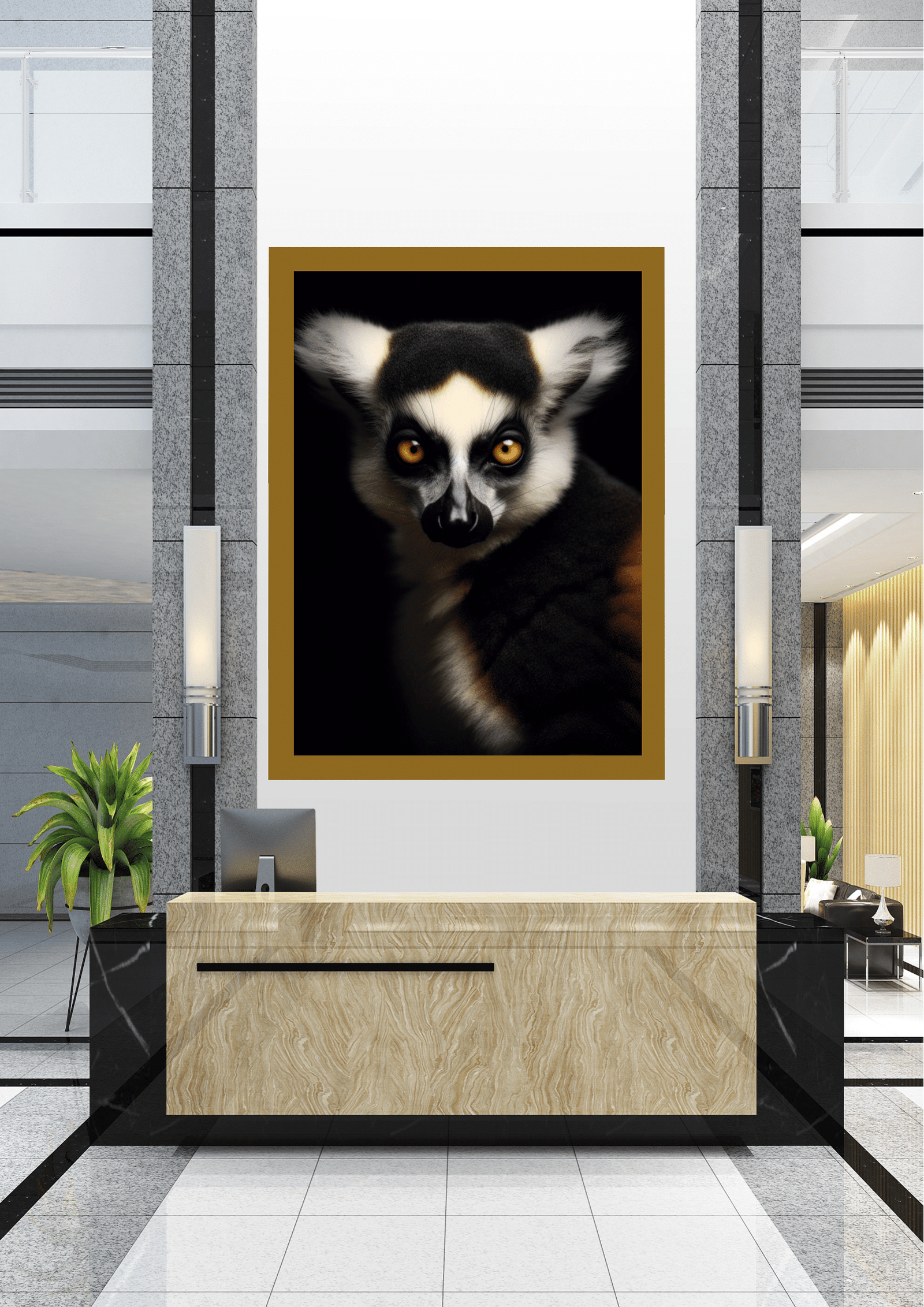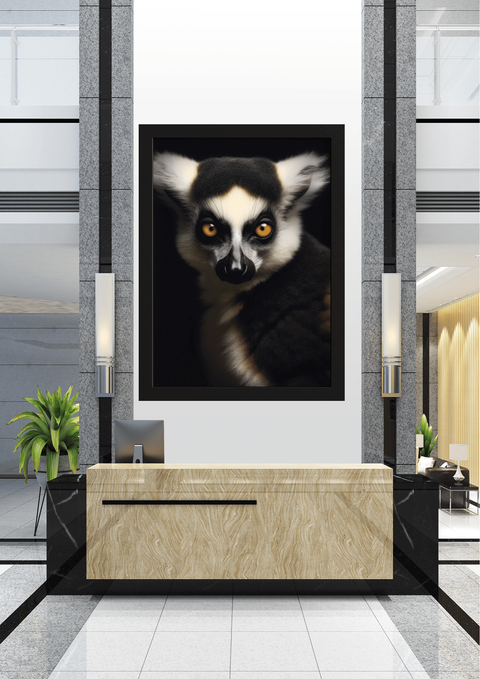No coração de um elegante saguão, um retrato cativante de um lêmure de olhos intensos domina o ambiente. A imagem, emoldurada com precisão, destaca o contraste entre o fundo escuro e o olhar penetrante do animal, criando uma atmosfera de mistério e sofisticação. A composição é cuidadosamente equilibrada, com o lêmure posicionado de forma centralizada, atraindo imediatamente a atenção de quem entra no espaço. A escolha do lêmure, um símbolo de curiosidade e agilidade, sugere uma conexão entre a natureza e o design moderno do local. A paleta de cores neutras do saguão, com seus elementos de mármore e aço, complementa a vivacidade do retrato, criando uma harmonia visual que é ao mesmo tempo acolhedora e intrigante. Este cenário não só embeleza o ambiente, mas também convida os visitantes a uma reflexão sobre a beleza e a complexidade do mundo natural.