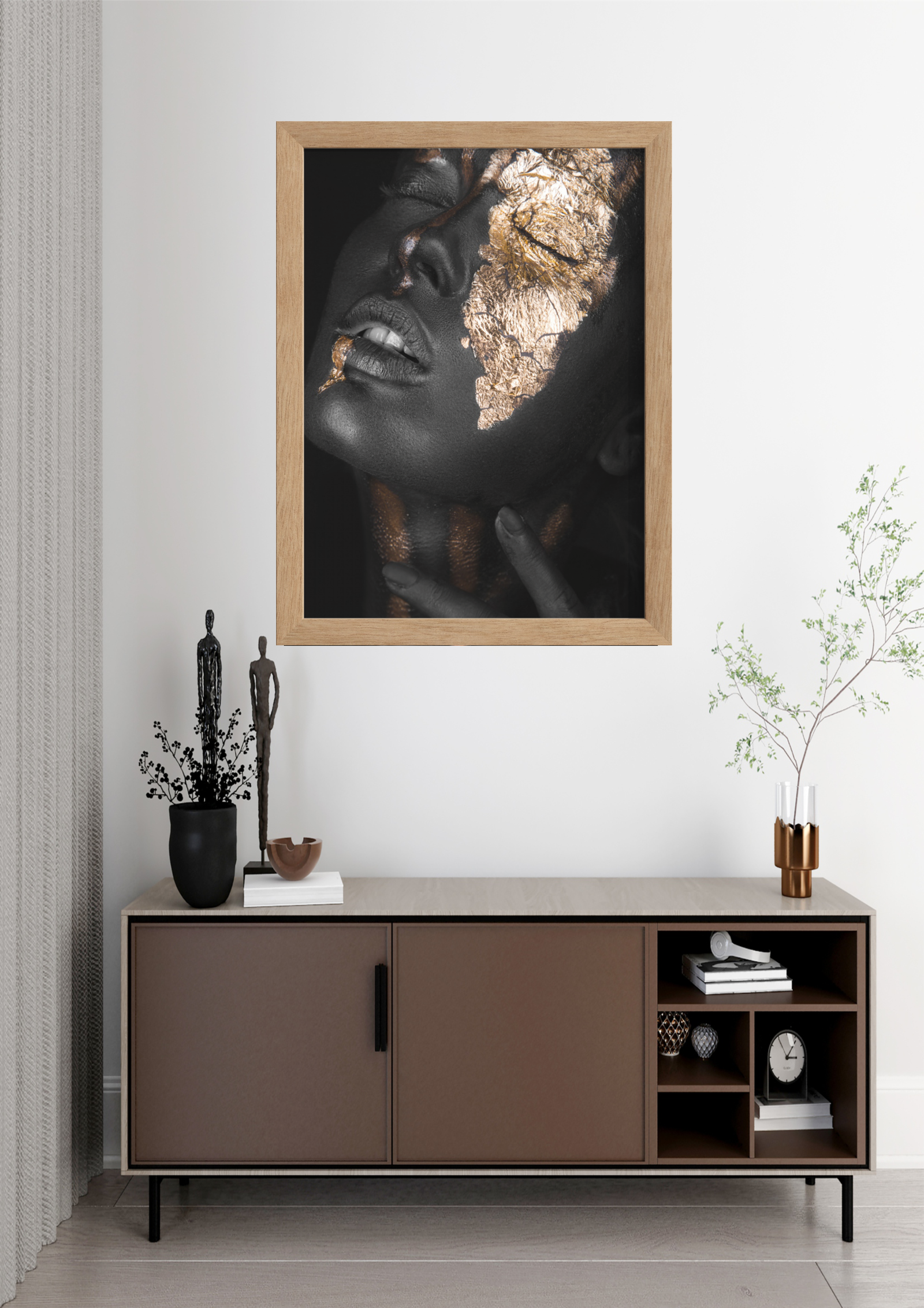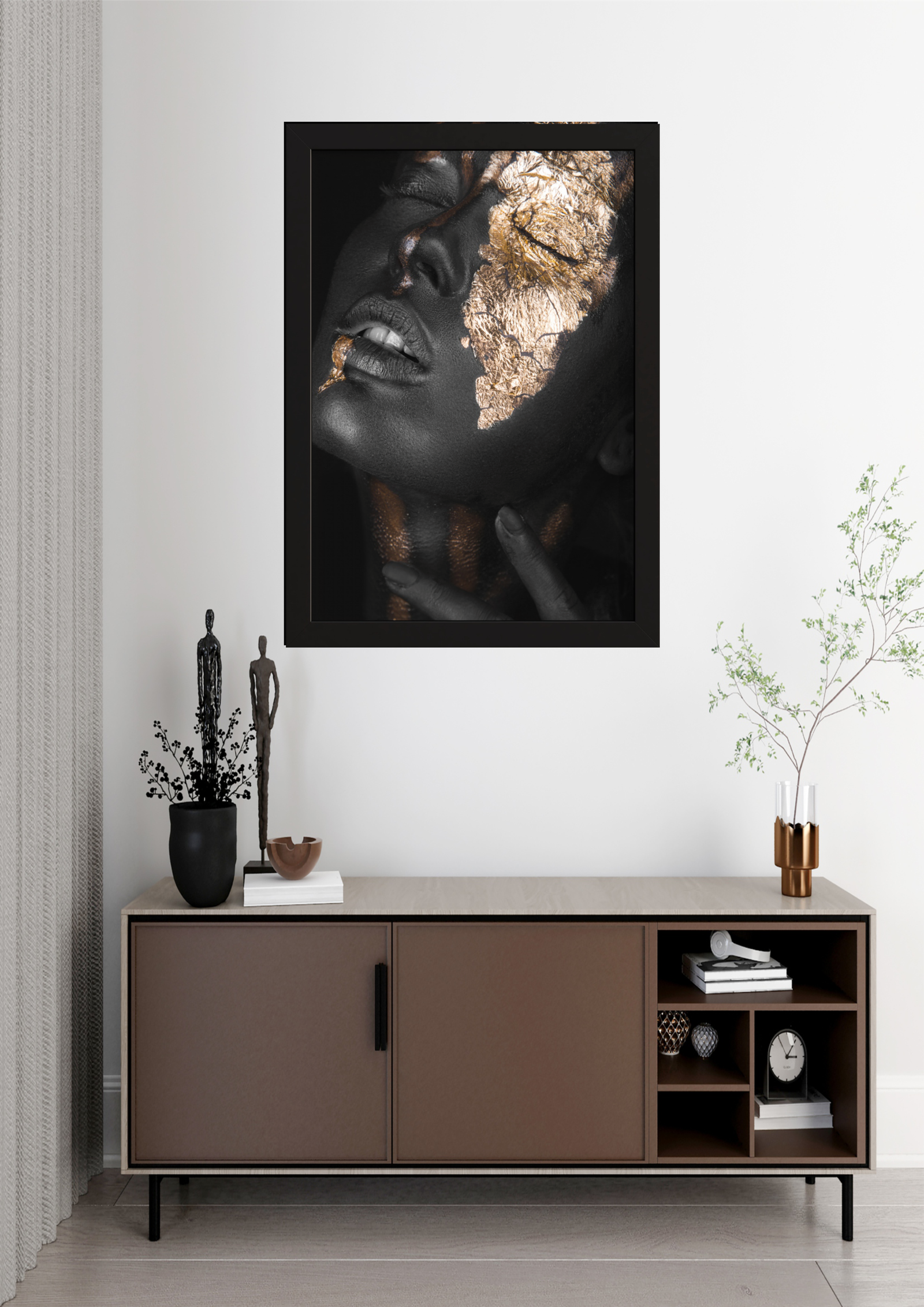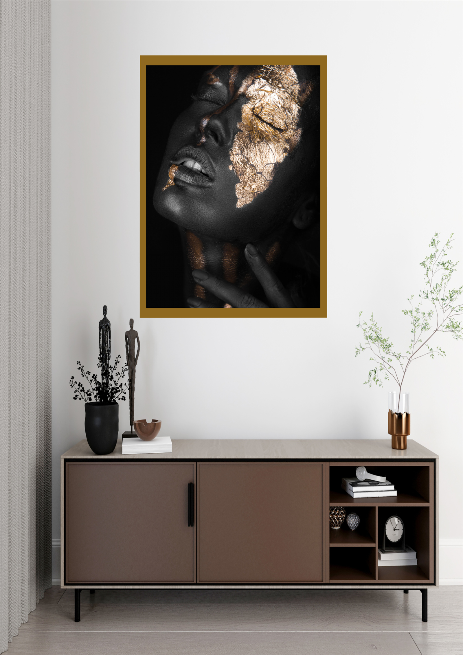A imagem apresenta uma sofisticada composição de design de interiores, destacando uma obra de arte impactante. O quadro, centralizado na parede, exibe uma figura feminina com pele negra adornada por folhas de ouro, criando um contraste visual marcante e refinado. A expressão serena e os olhos fechados da modelo evocam uma sensação de paz e introspecção, enquanto o brilho dourado acentua a beleza natural e a elegância da imagem.