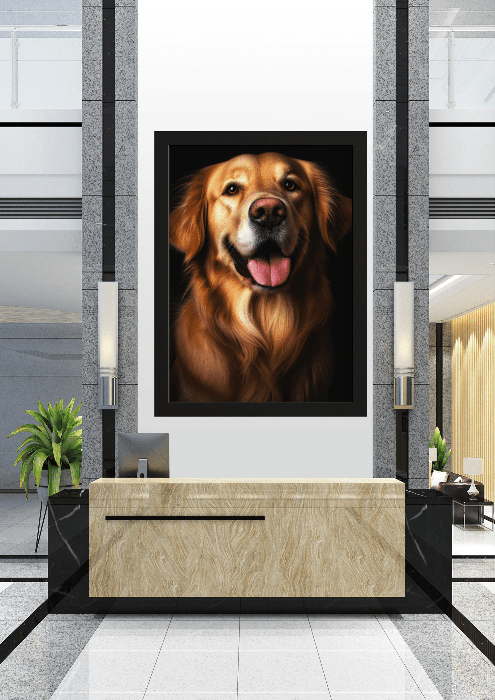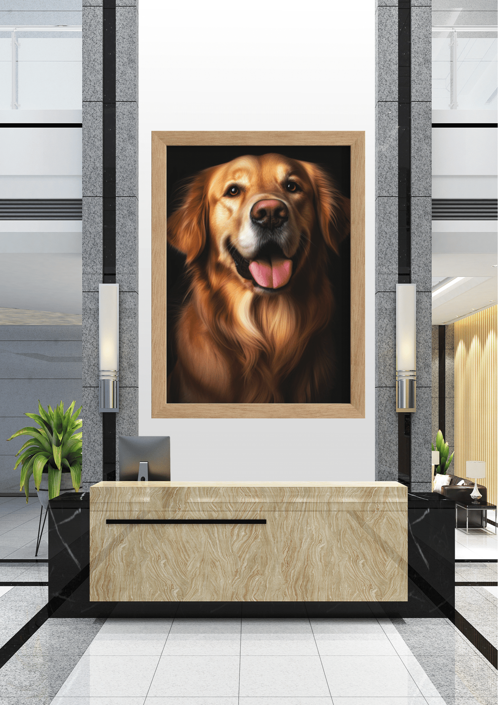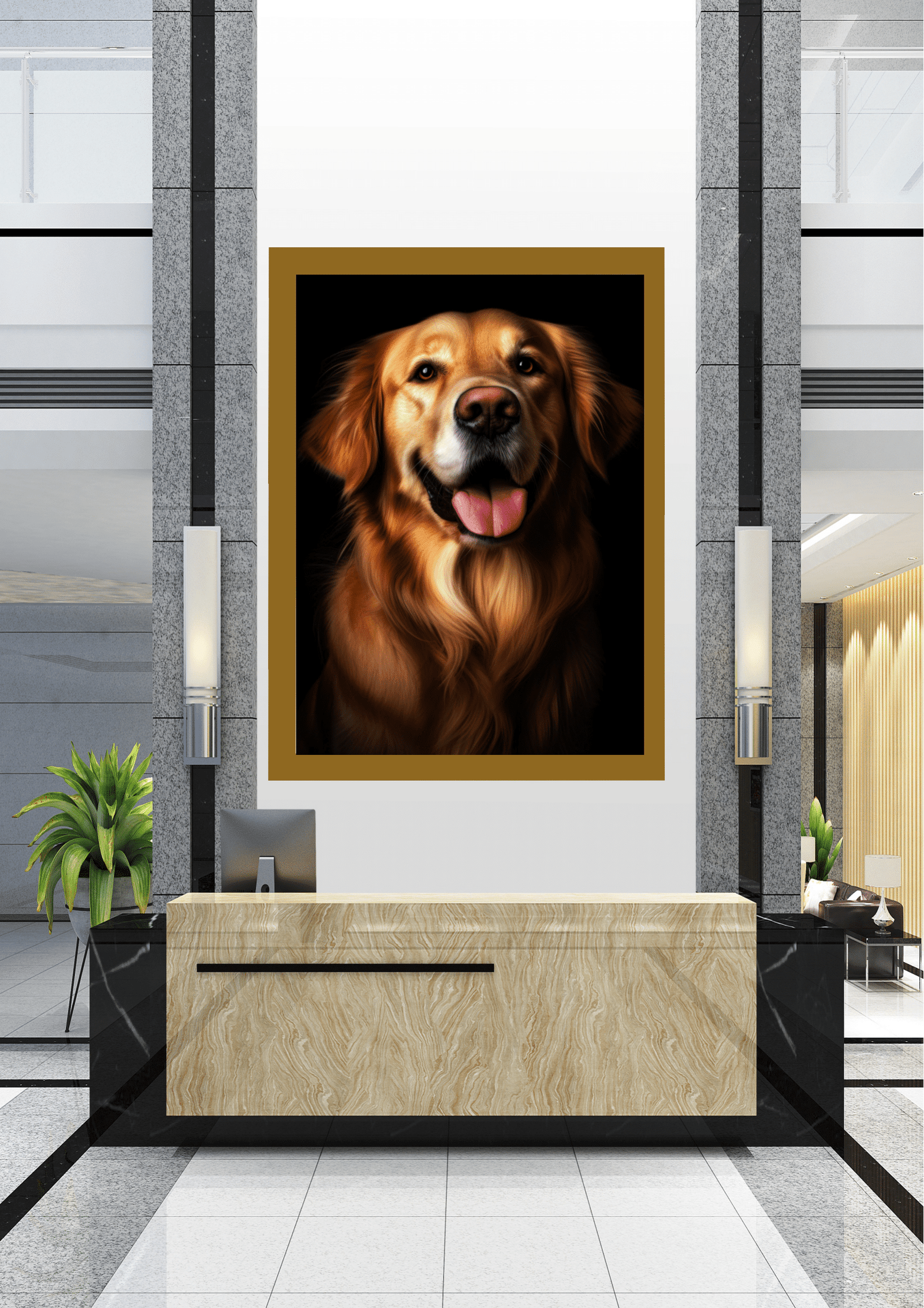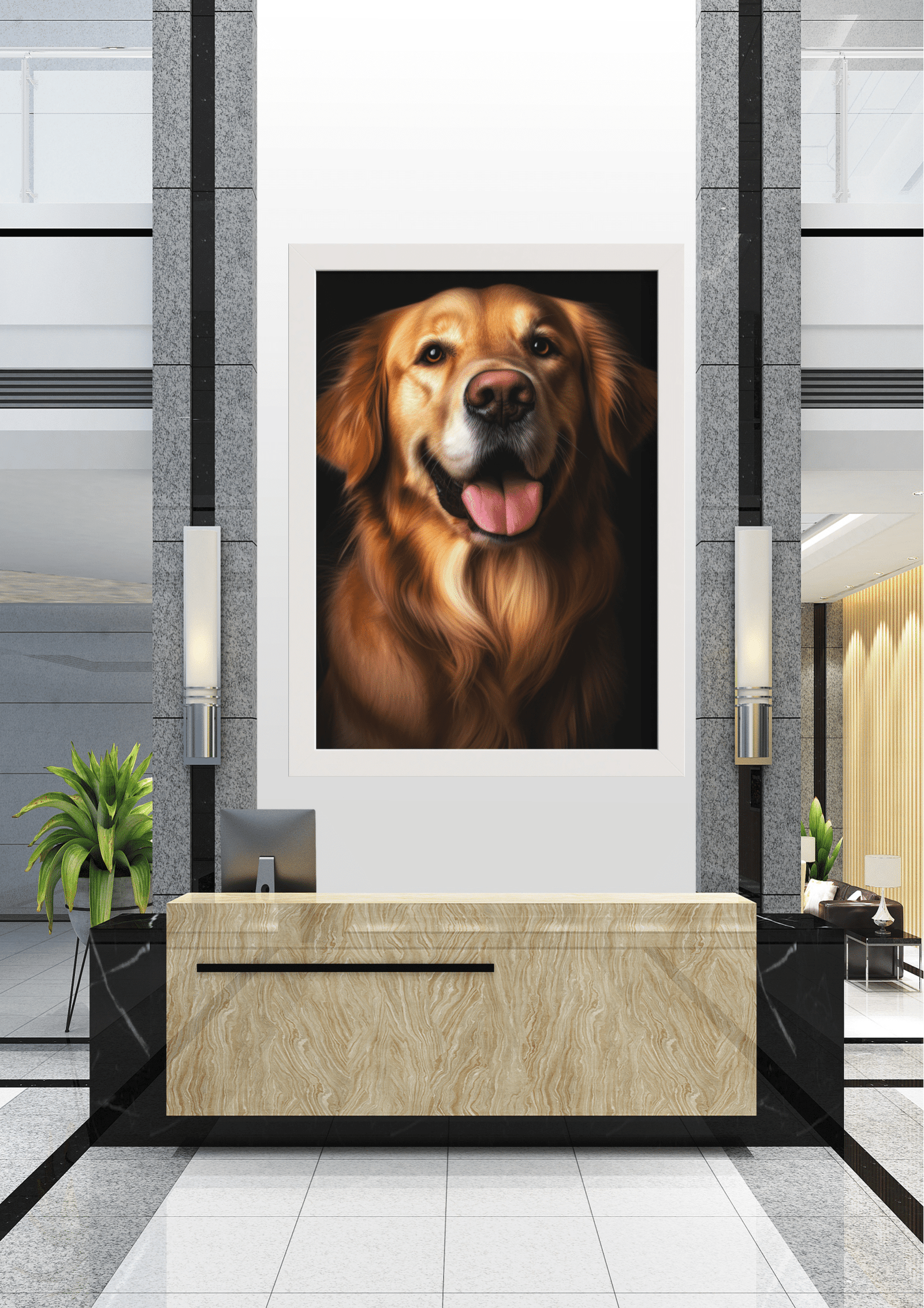 A imagem retrata uma sofisticada área de recepção, onde o design moderno se encontra com o toque caloroso de um retrato de um golden retriever. O ambiente é marcado por linhas elegantes e tons neutros, destacando o balcão de mármore que serve como ponto central. Acima do balcão, uma imponente pintura de um cachorro, com expressão amigável e vibrante, traz vida e personalidade ao espaço. As paredes revestidas de pedra e detalhes em preto adicionam um contraste elegante, enquanto as plantas cuidadosamente posicionadas oferecem um toque de frescor. Este espaço não só acolhe os visitantes com uma sensação de profissionalismo, mas também com um caloroso abraço visual, graças à presença do adorável retrato canino.