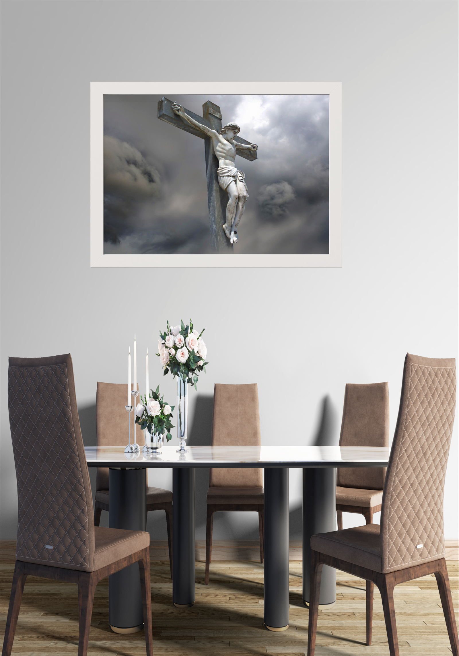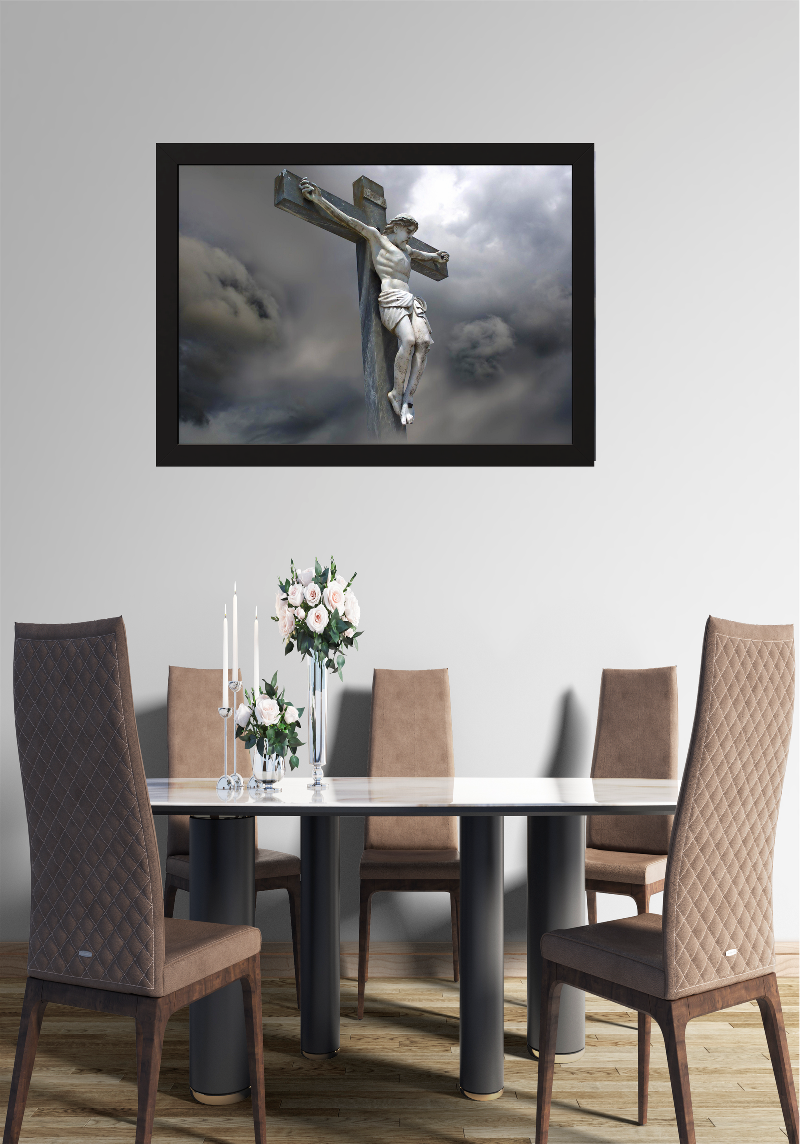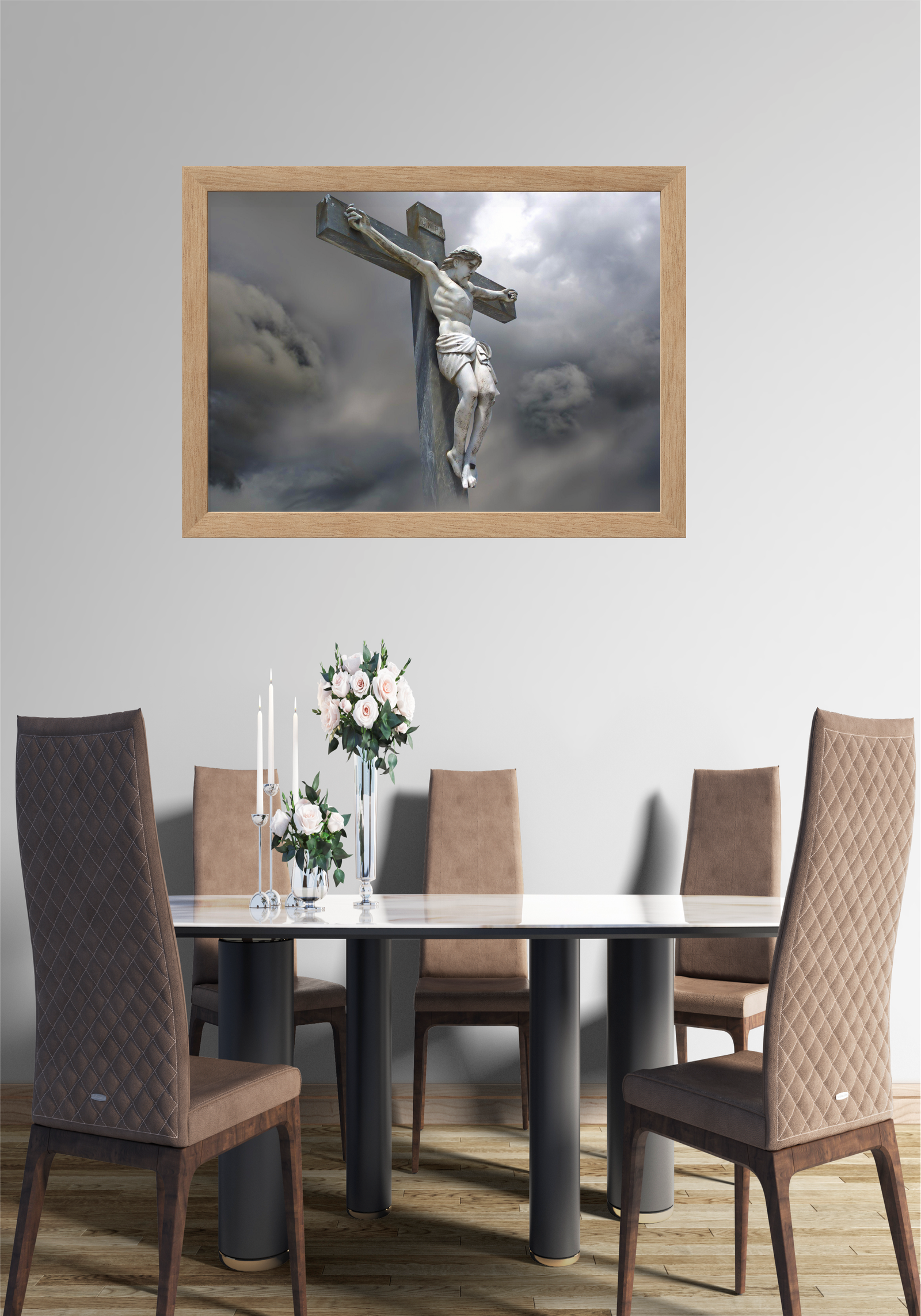 A imagem retrata um ambiente de jantar sofisticado, onde a decoração minimalista e elegante se destaca. Ao fundo, uma imponente obra de arte emoldurada exibe a crucificação de Cristo, criando um ponto focal de profunda reflexão. A mesa de jantar, com um design moderno e cadeiras acolchoadas em tons neutros, contrasta harmoniosamente com o quadro, adicionando um toque de serenidade ao ambiente. No centro da mesa, um arranjo floral delicado e castiçais com velas brancas acrescentam um toque de sofisticação e tranquilidade. As paredes em tom claro e o piso de madeira completam a composição, proporcionando um espaço acolhedor e introspectivo, ideal para momentos de contemplação e comunhão. Esta combinação de elementos cria um equilíbrio perfeito entre arte sacra e design contemporâneo, transformando o ambiente em um local de paz e inspiração.
