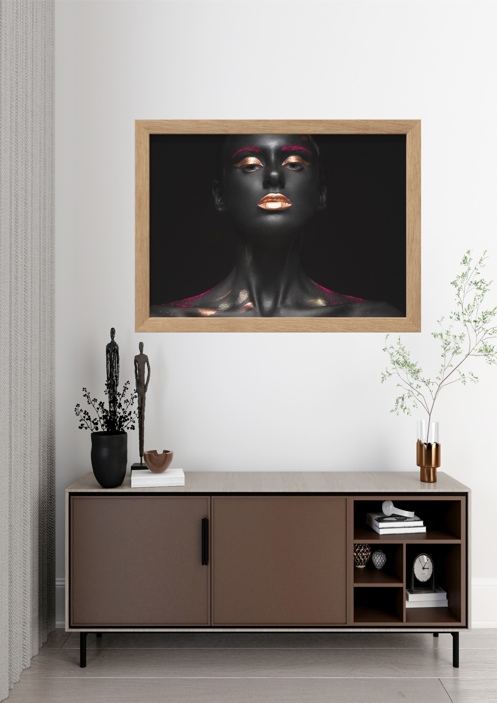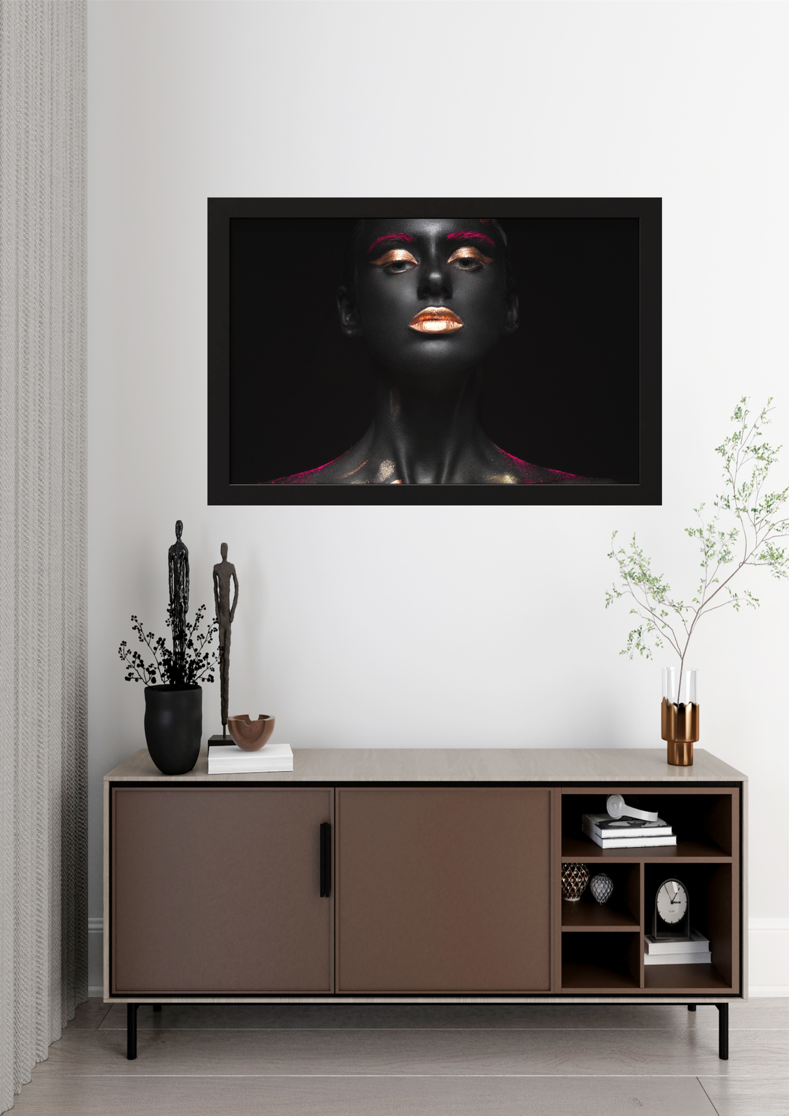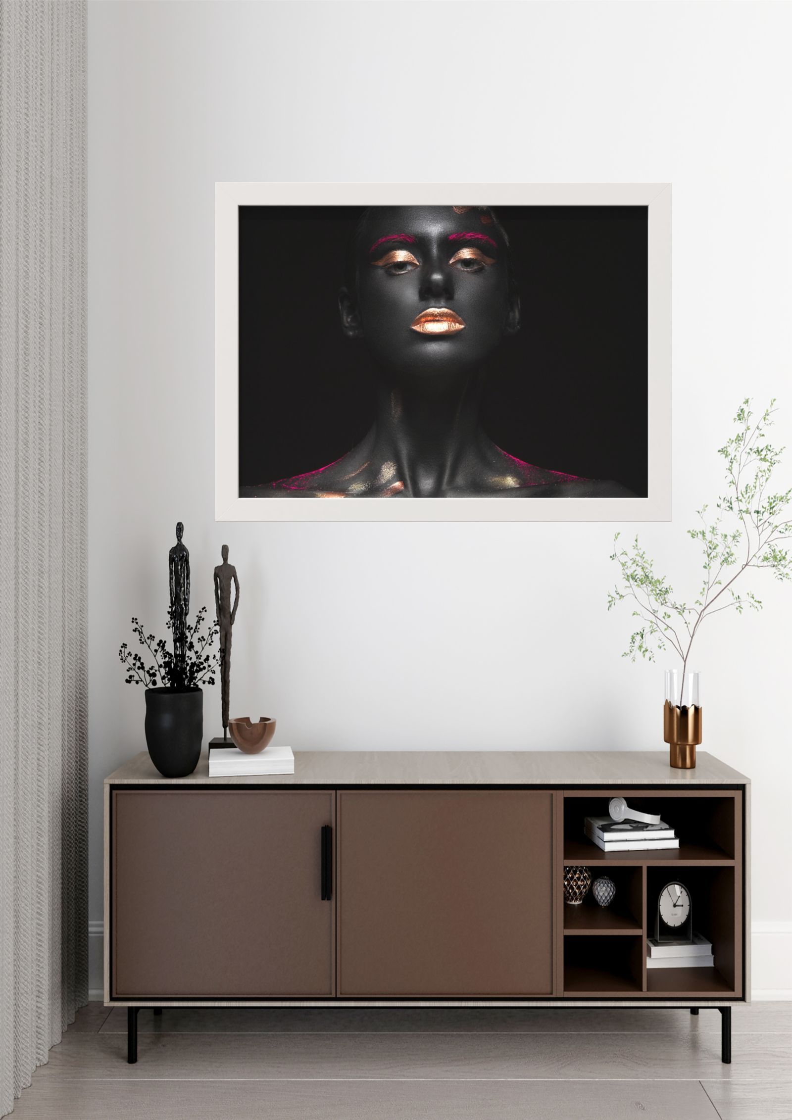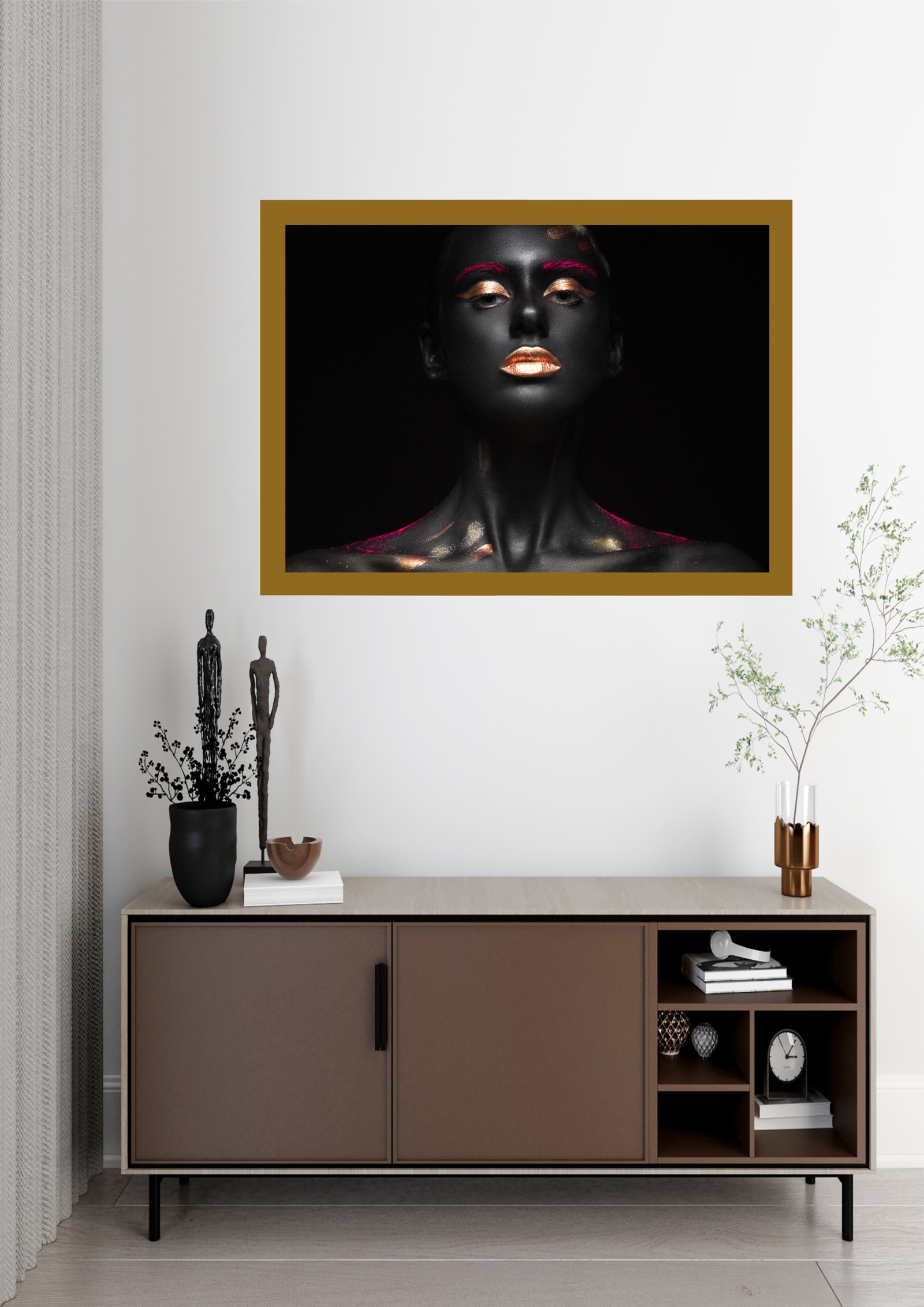 Este quadro captura a essência da beleza e do mistério através de um retrato monocromático realçado por toques de ouro. A figura feminina, envolta em sombras sutis, exibe uma expressão contemplativa que evoca tanto força quanto serenidade. Os detalhes dourados nos lábios, olhos e unhas contrastam com o fundo escuro, simbolizando a luz que emerge da escuridão. Uma peça que convida à introspecção e à apreciação da elegância atemporal.