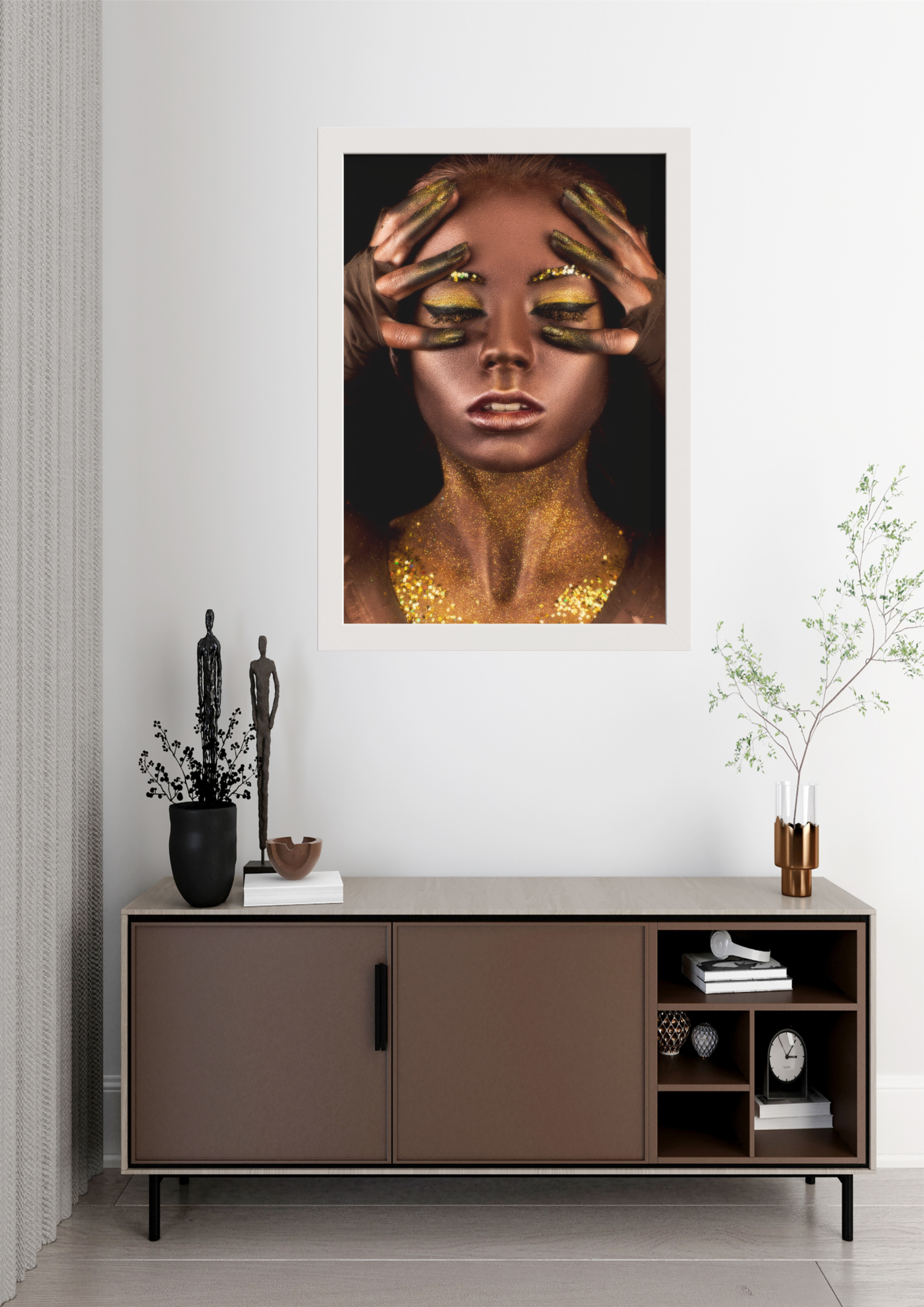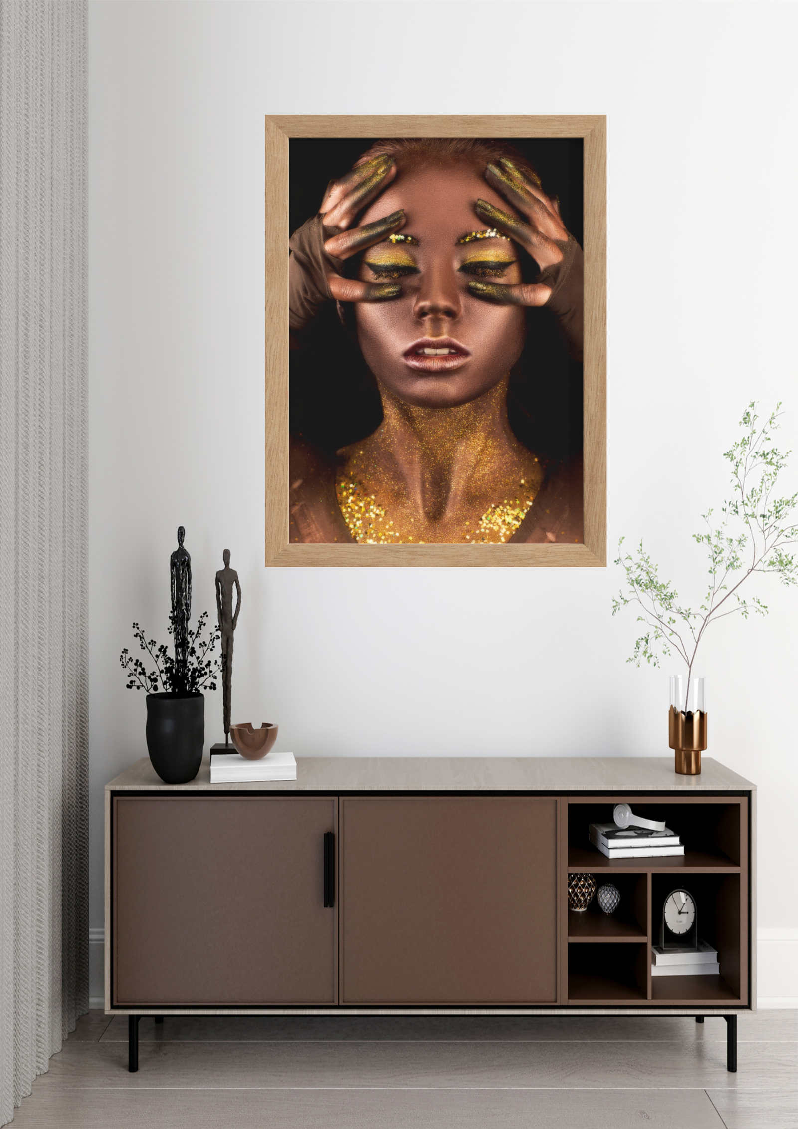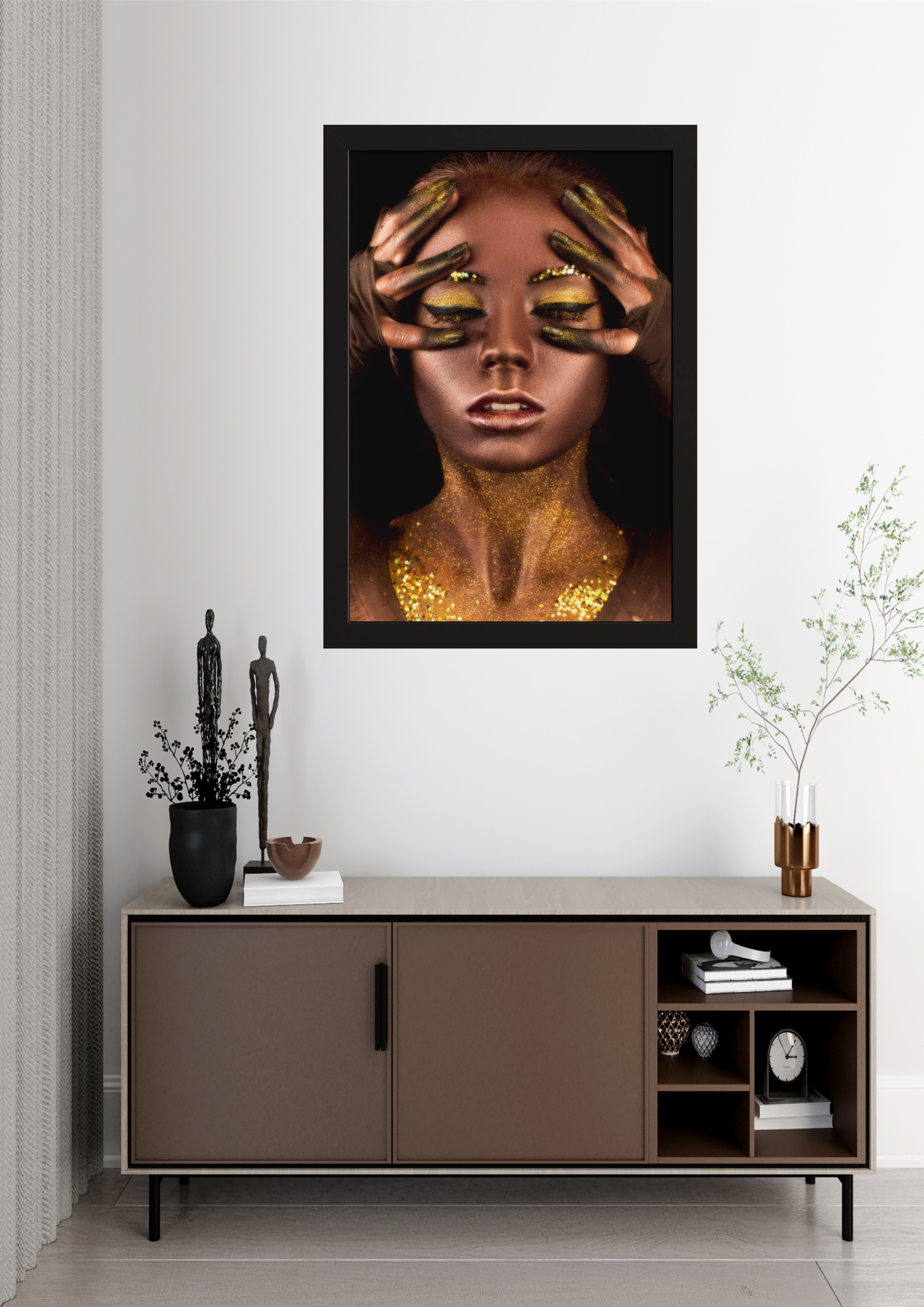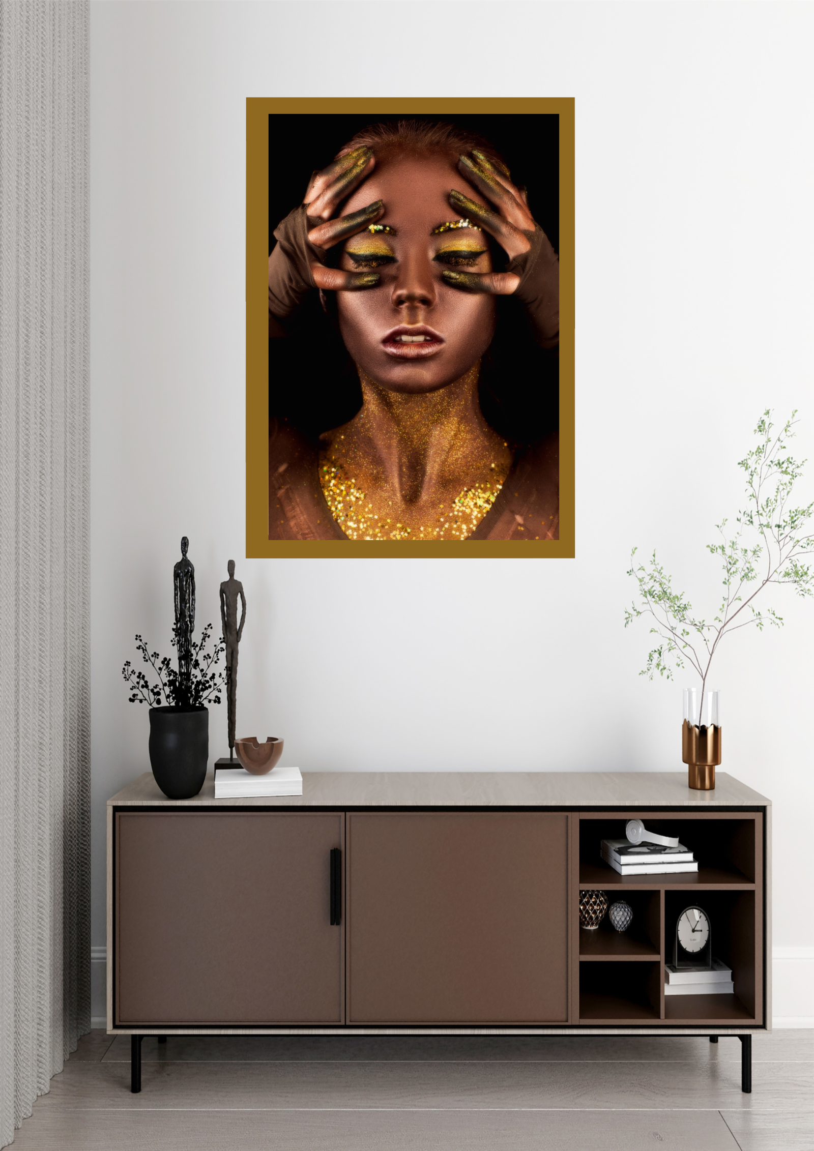 Nesta impactante obra de arte, a imagem captura a essência do autoconhecimento através de uma representação visual poderosa. O rosto da modelo, adornado com um brilho dourado, simboliza a busca interna por iluminação e compreensão pessoal. As mãos que envolvem o rosto sugerem introspecção e a complexidade do processo de autoexploração. O uso de tons metálicos e a textura brilhante evocam uma sensação de luxo e profundidade, enquanto o fundo escuro contrasta, destacando a figura central. Esta peça não apenas decora o ambiente, mas também convida o observador a refletir sobre sua própria jornada interior. A composição é equilibrada e harmoniosa, trazendo sofisticação e um toque de mistério ao espaço onde está exposta. Ideal para quem aprecia arte que provoca reflexão e instiga o pensamento crítico sobre a identidade e a beleza interna.