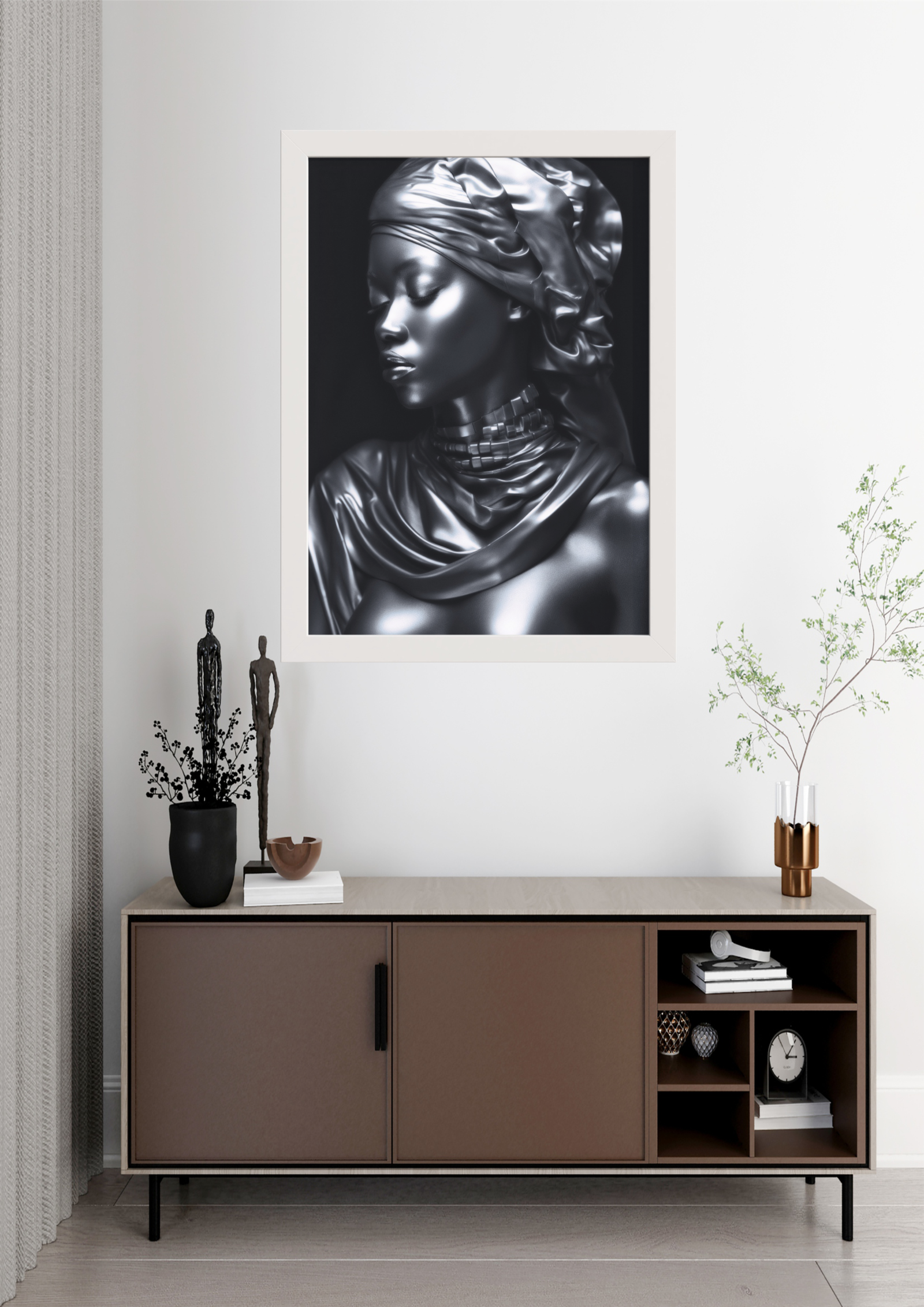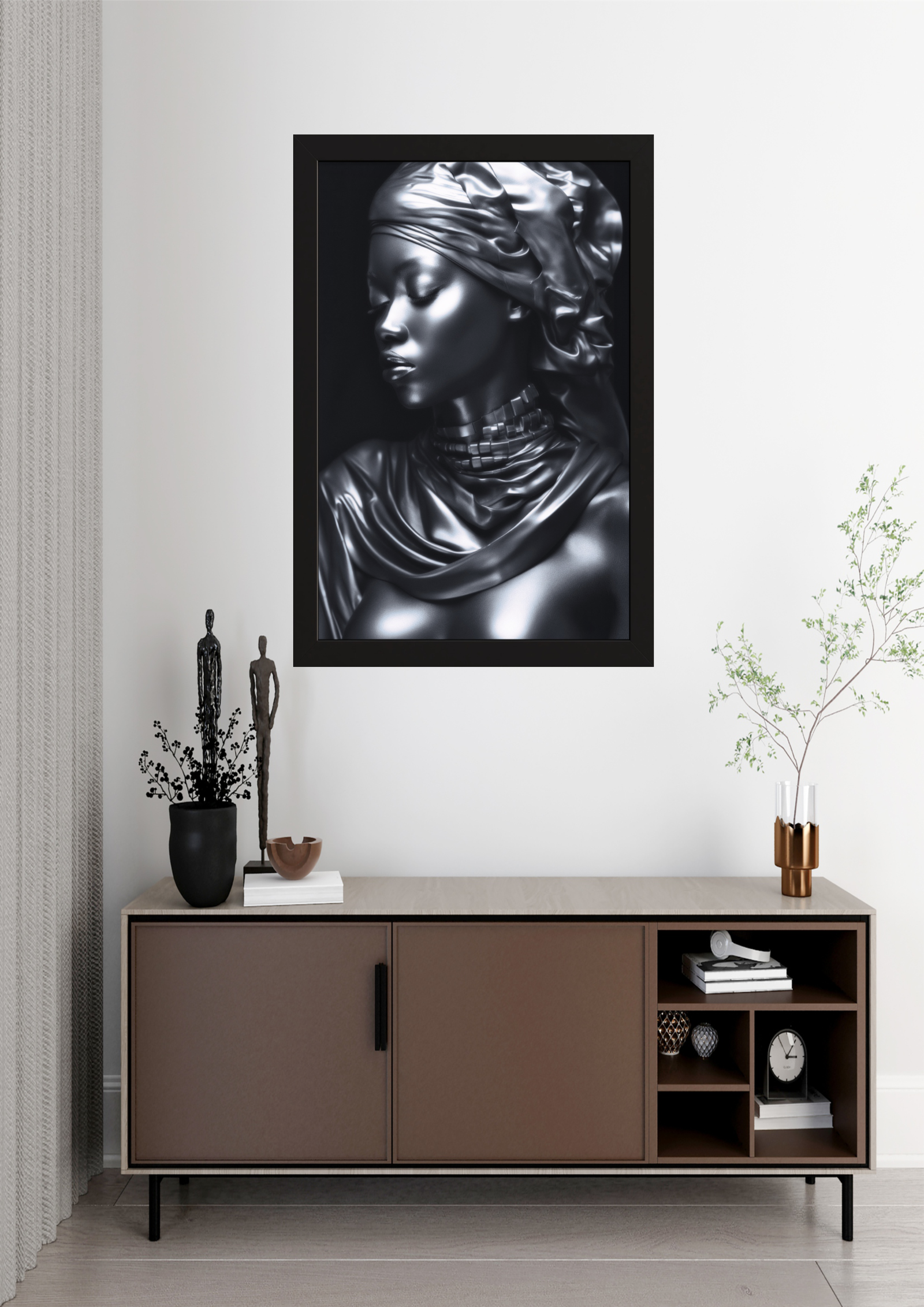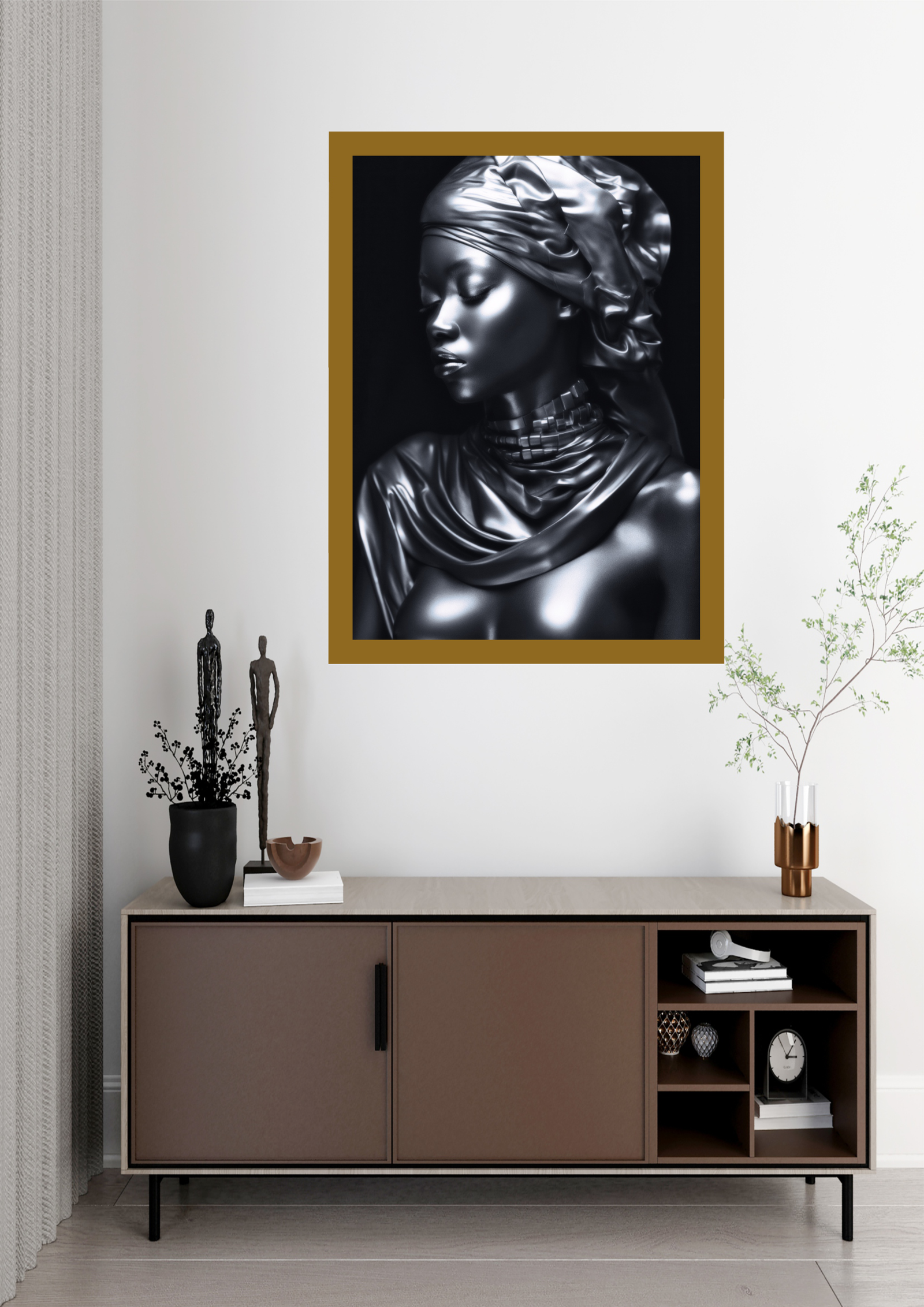 Neste quadro, a figura central exala uma serenidade quase etérea, capturada em um tom metálico que reflete a luz de maneira sublime. A imagem retrata uma mulher envolta em um manto que parece fluir como líquido, destacando-se pelo contraste entre a suavidade do tecido e a rigidez do metal. Seu olhar está voltado para baixo, sugerindo introspecção e tranquilidade. O turbante, meticulosamente esculpido, adiciona um elemento de majestade e tradição, evocando histórias de tempos passados. A textura da pele, quase irreal em sua perfeição, confere à obra uma qualidade futurista, enquanto as sombras criam profundidade e mistério. Ao fundo, a escuridão destaca ainda mais a figura, fazendo com que ela pareça emergir do desconhecido. Este quadro é uma homenagem à beleza e à força silenciosa, capturando a essência de uma presença imponente e ao mesmo tempo delicada. A obra convida o espectador a contemplar a dualidade entre o material e o espiritual, o passado e o futuro. É uma peça que não apenas decora, mas provoca reflexão e admiração, tornando-se um ponto focal em qualquer ambiente.