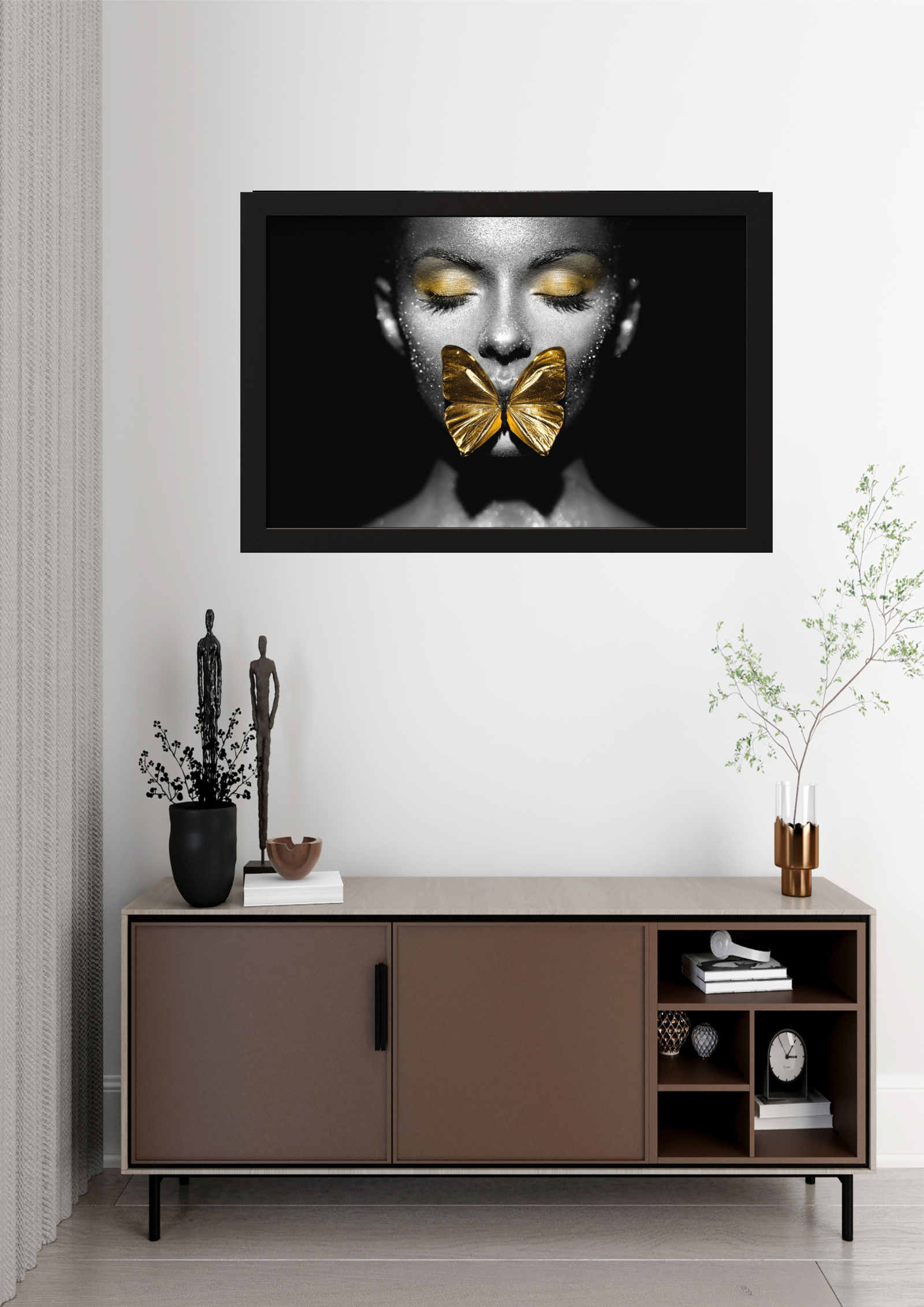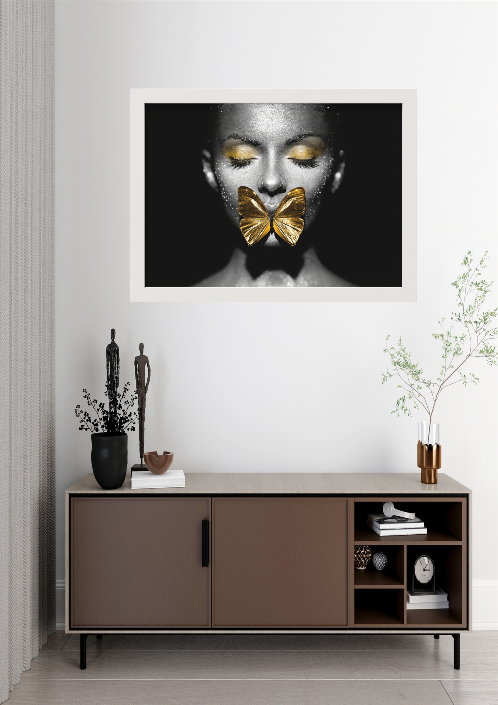 A escolha do dourado, tanto na borboleta quanto nas pálpebras, contrasta com o fundo escuro, destacando a dualidade entre luz e sombra, entre o visível e o oculto. As gotas de brilho na pele evocam a ideia de um universo estrelado, sugerindo que mesmo no silêncio existem mundos inteiros a serem descobertos.